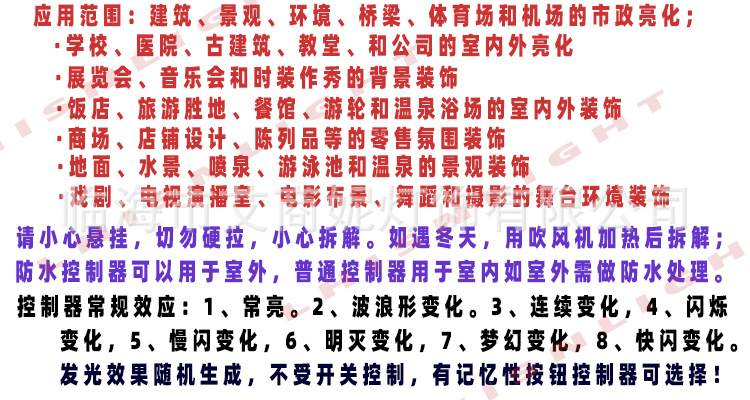 产品由LED(常规平头内凹直径5MM)制作而成,灯串的长度和灯泡颗数可以根据客户具体要求定制,常规为10米100颗LED,电压为220V,配备四路八功能控制器,可产生:常亮、渐变、闪烁、追逐、波浪等多种灯光变幻组合。主要功能1、常亮、2、波浪型变化、3、连续变化、4、闪烁变化5、慢闪变化、6、明灭变化、7、梦幻变化8、快闪变化。