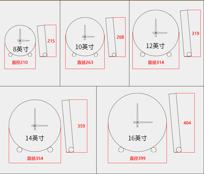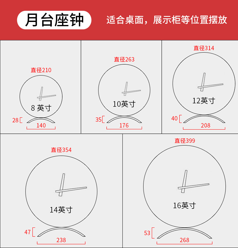 8inch (бесшумное движение); 8inch (механизм Seiko); 8inch (радиоволновой механизм); 10inch (бесшумное движение); 10inch (механизм Seiko); 10inch (радиоволновой механизм); 12inch (бесшумное движение); 12inch (механизм Seiko); 12inch (радиоволновой механизм); 14inch (бесшумное движение); 14inch (механизм Seiko); 14inch (радиоволновой механизм); 16inch (бесшумное движение); 16inch (механизм Seiko); 16inch (радиоволновой механизм)