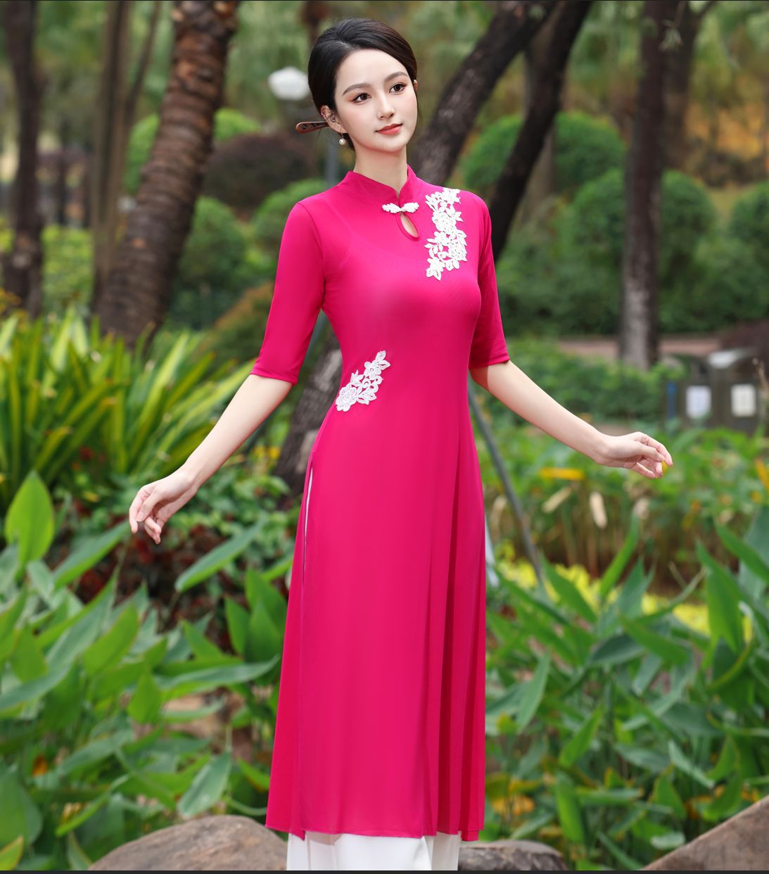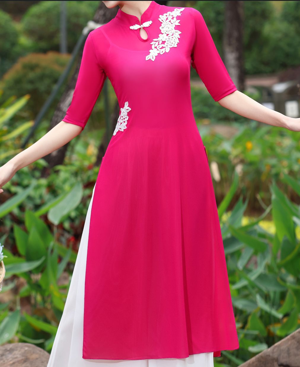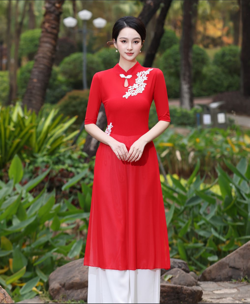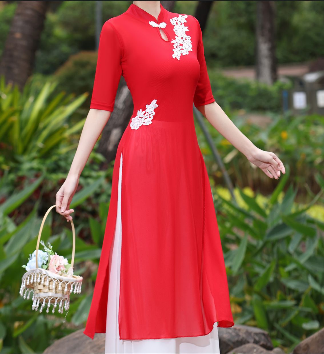 Костюм чонсам с вышивкой красного цвета; Костюм чонсам с вышивкой розово-красного цвета; Вышитая инфракрасная одежда + красные подтяжки.; Вышитое розово-красное пальто + белые подтяжки; Вышитая инфракрасная одежда; Вышитое розово-красное пальто; Двухслойные белые брюки.; красный слинг; белый слинг