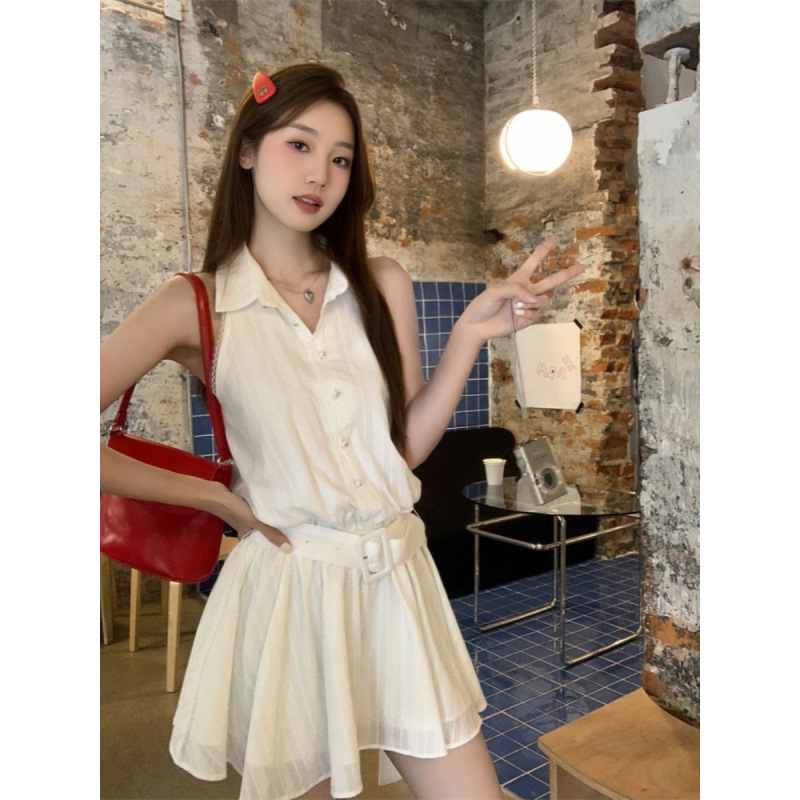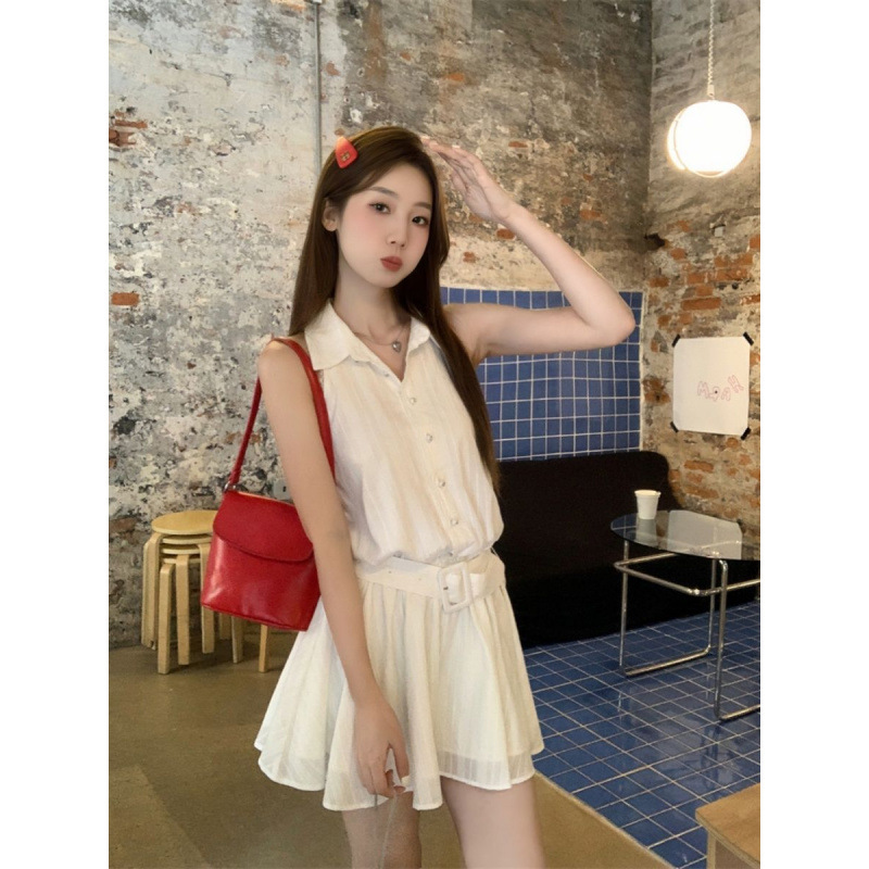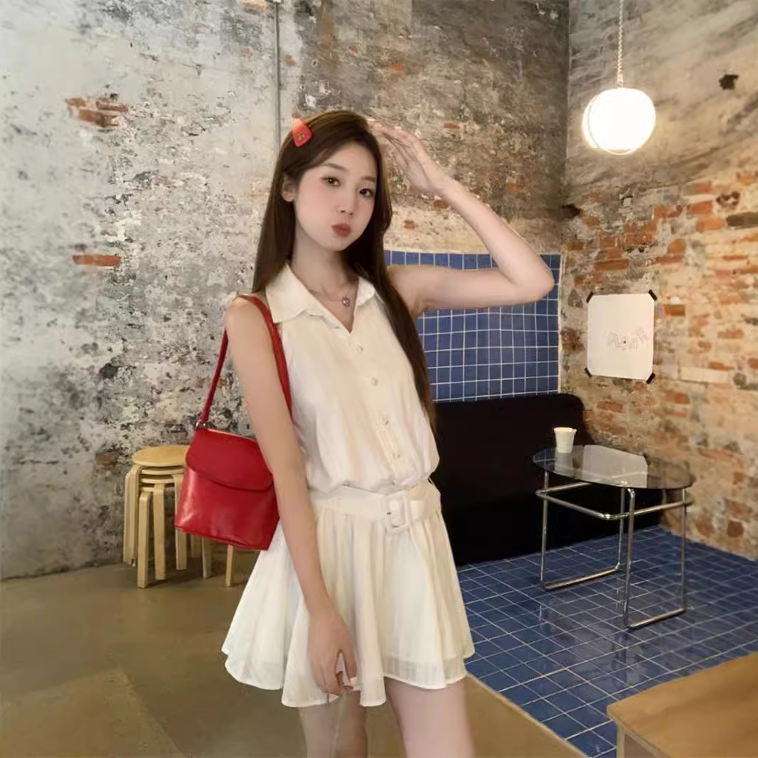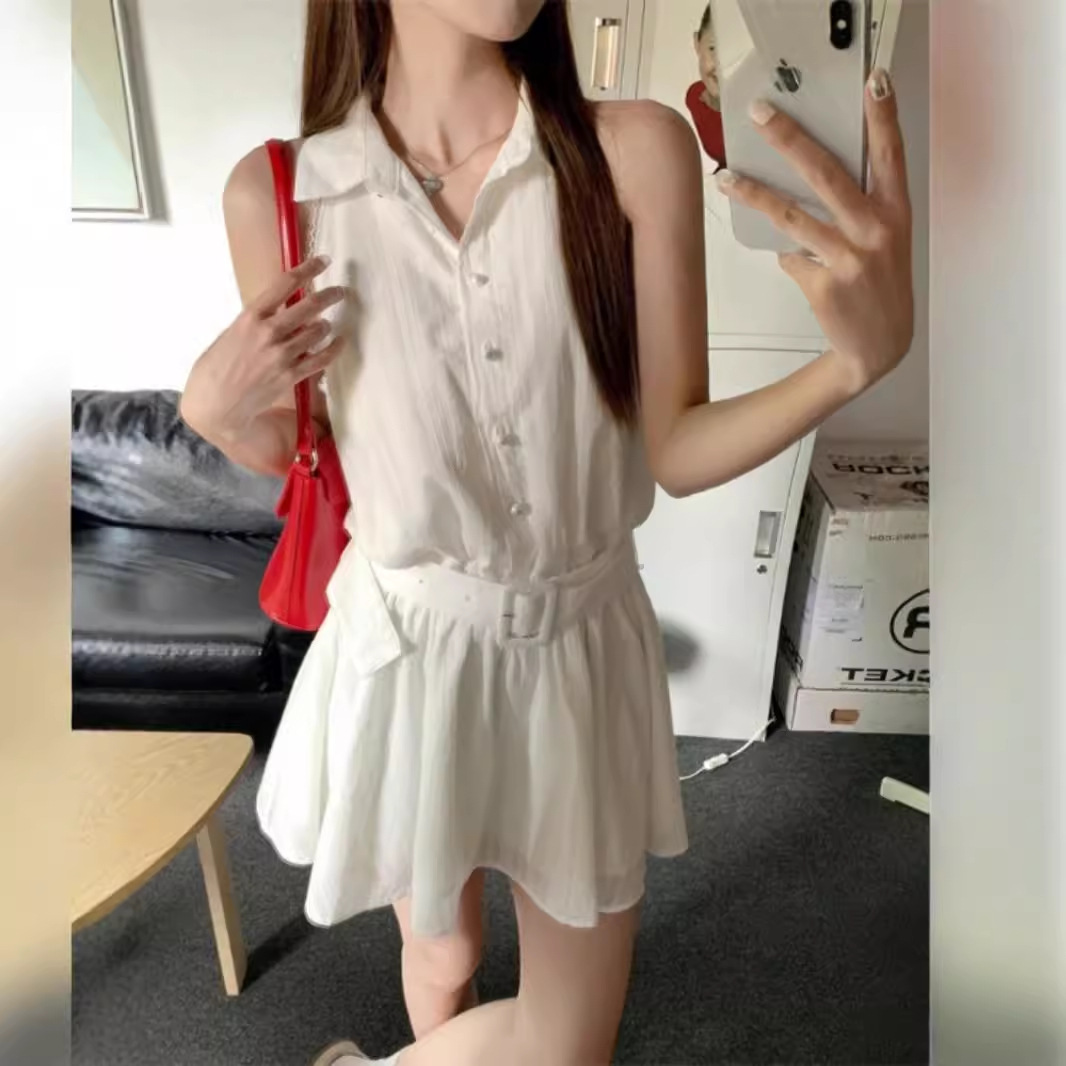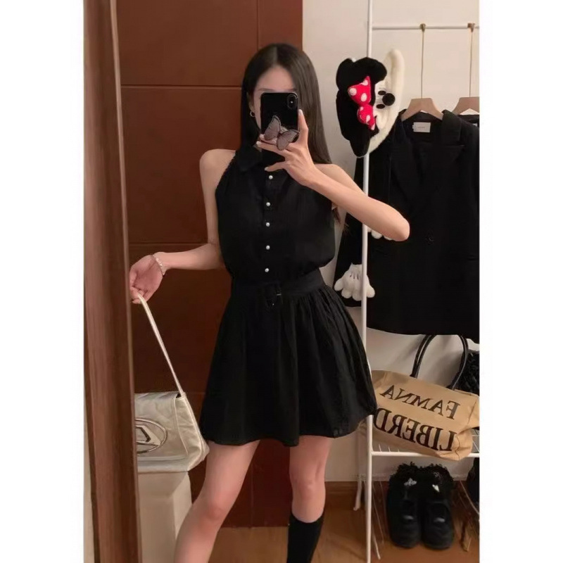 Сладкое классное черное платье-жилет с открытыми плечами женское лето новый воротник поло мода талия тонкая, короткая юбка