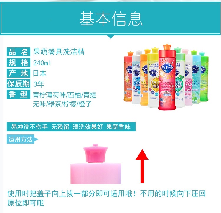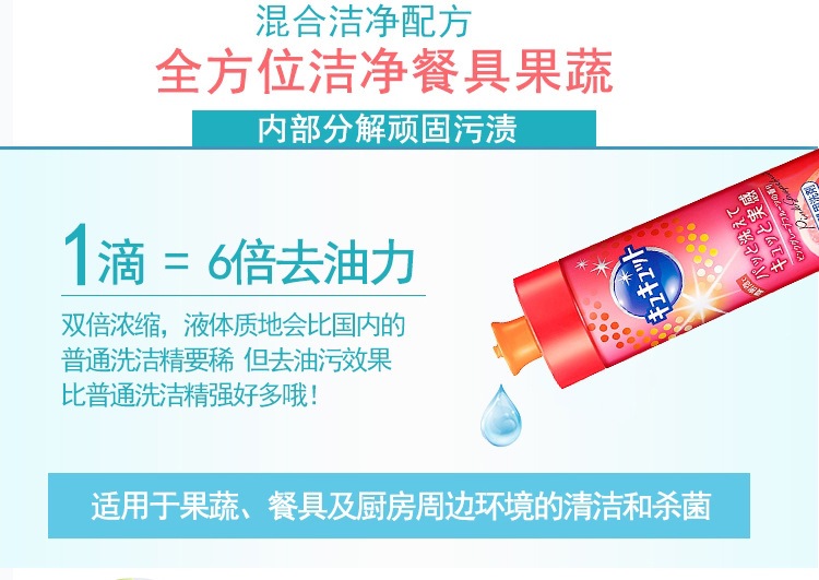 特点:每次洗碗只需一点点,让你全家都健康哦。去污力是国内一般洗洁精的10倍哦。适用于蔬菜水果、厨房调理器具、切菜板、等等厨房周边环境的清洁。使用后的厨房每天都保持洁净闪亮,洗后不留残香。不用多说,一用就知道。洗涤之前加水浸泡效果更好哦。