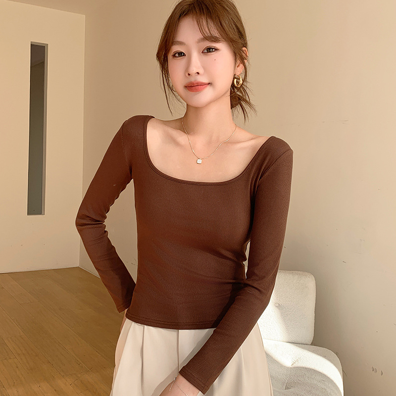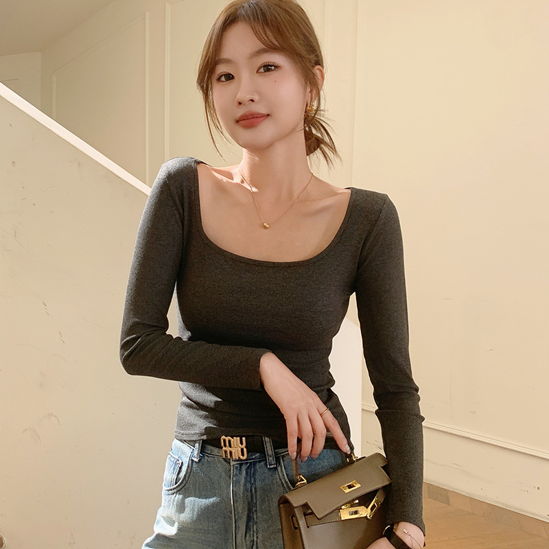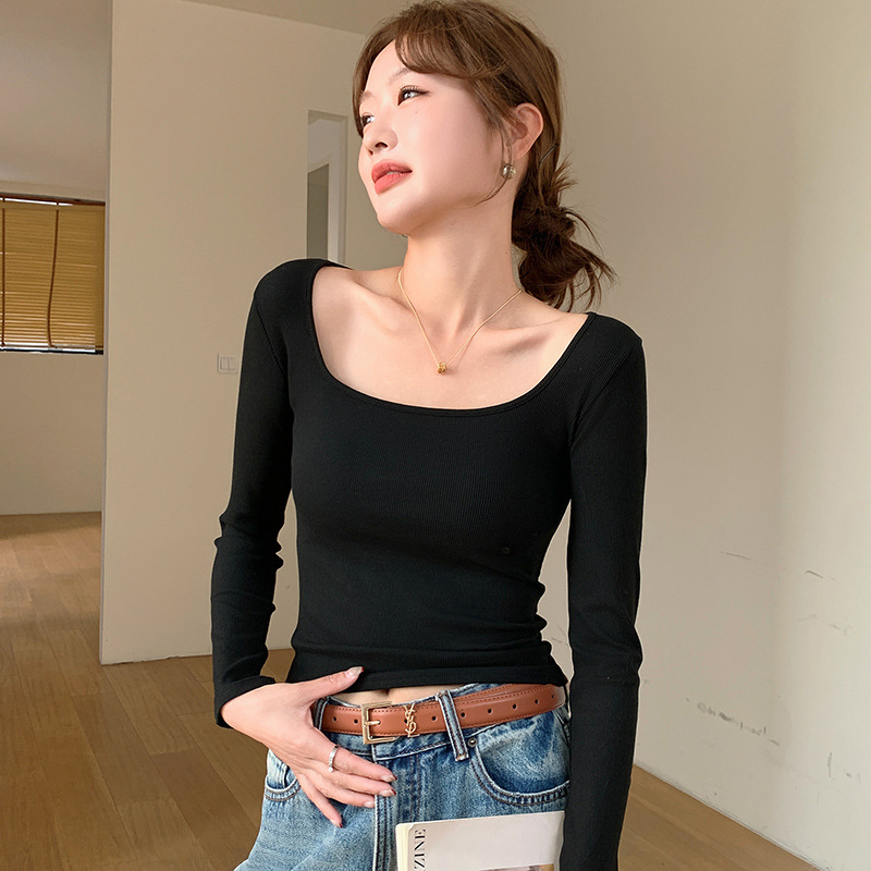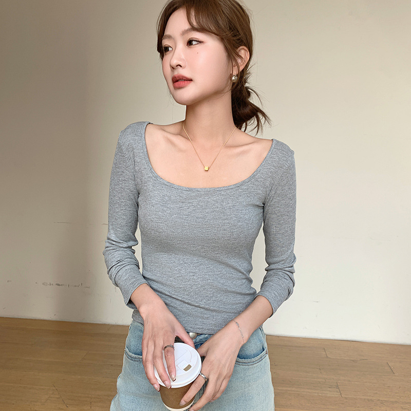 H869 резьбовой большой U-образный воротник с длинным рукавом блузка женская весенняя тонкая футболка теплая простая повседневная нижняя рубашка новый стиль