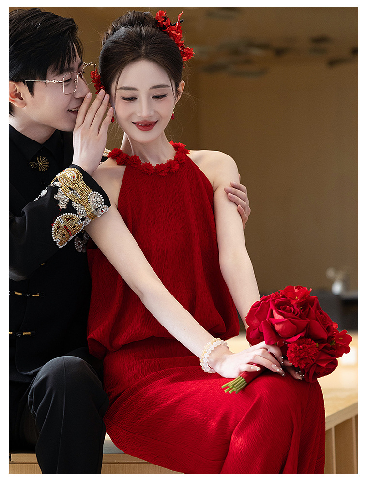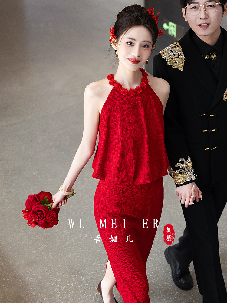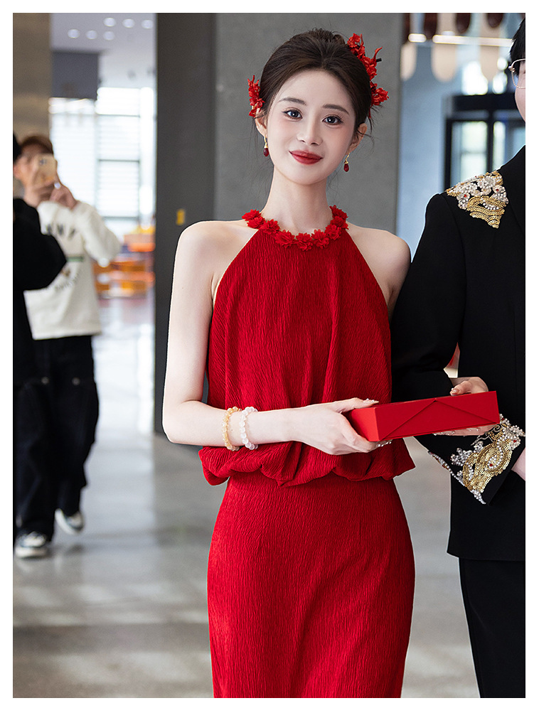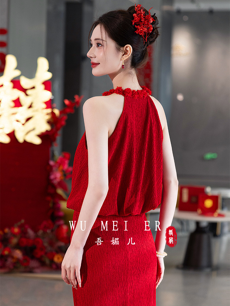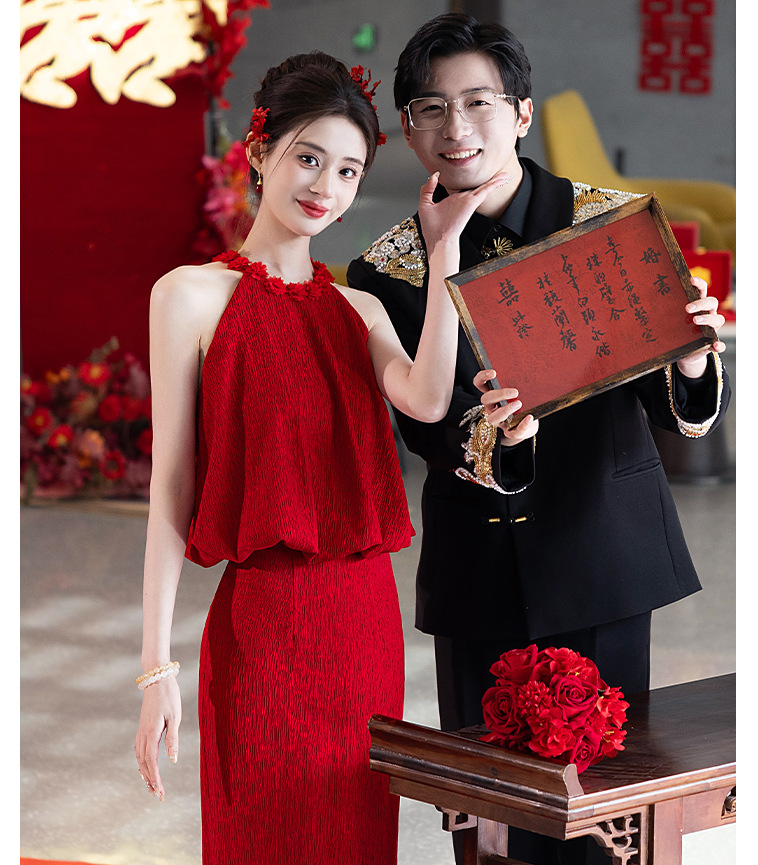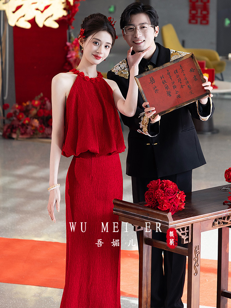 Новое китайское свадебное платье с воротником-халтер, модель 2026 года, с ощущением роскоши, элегантное и стройнящее красное платье для свадебной церемонии.