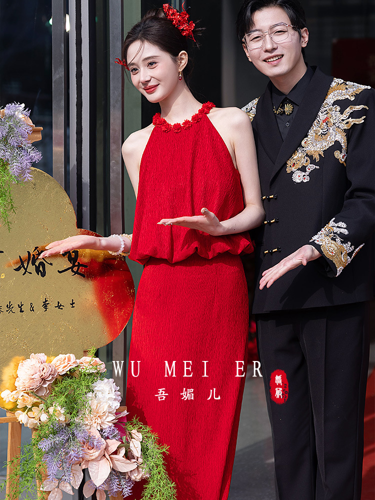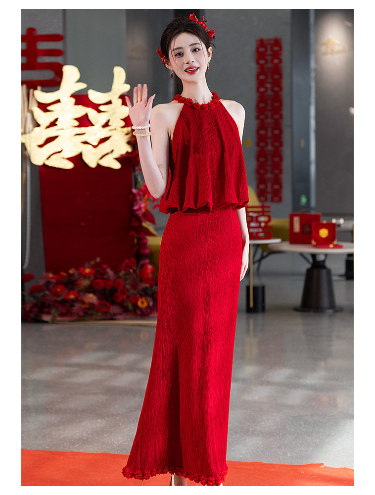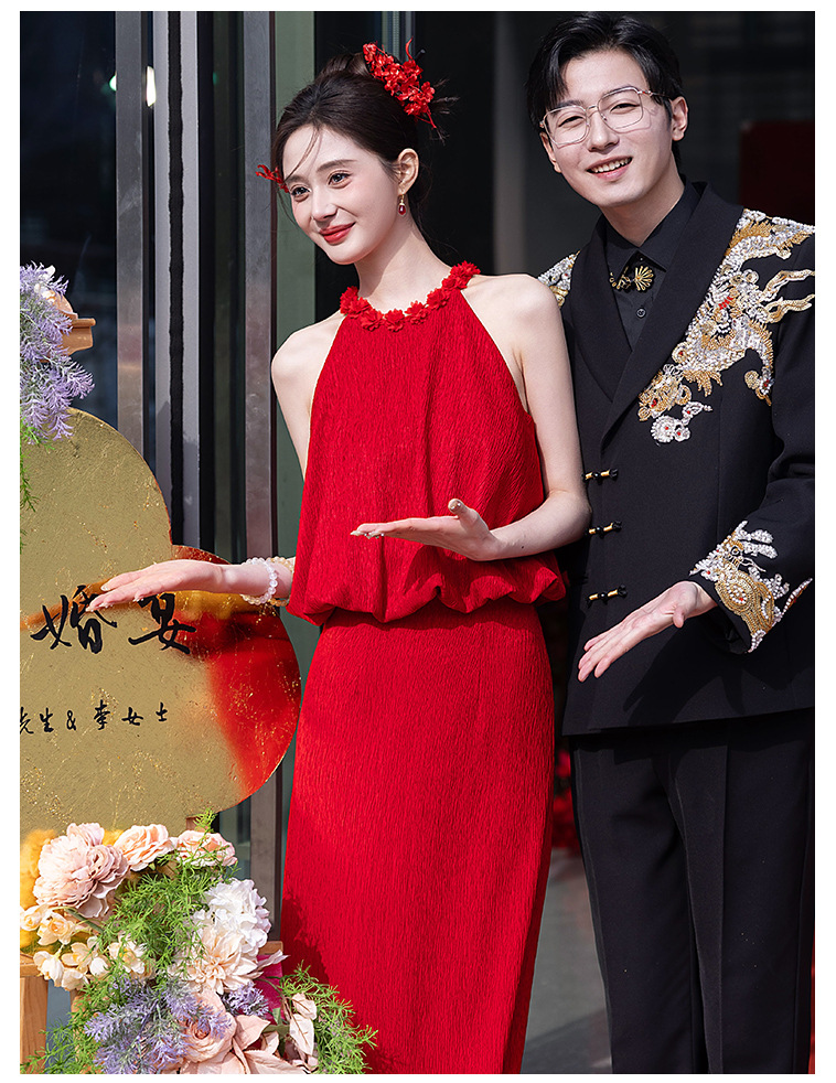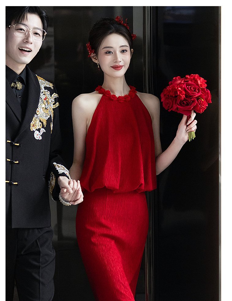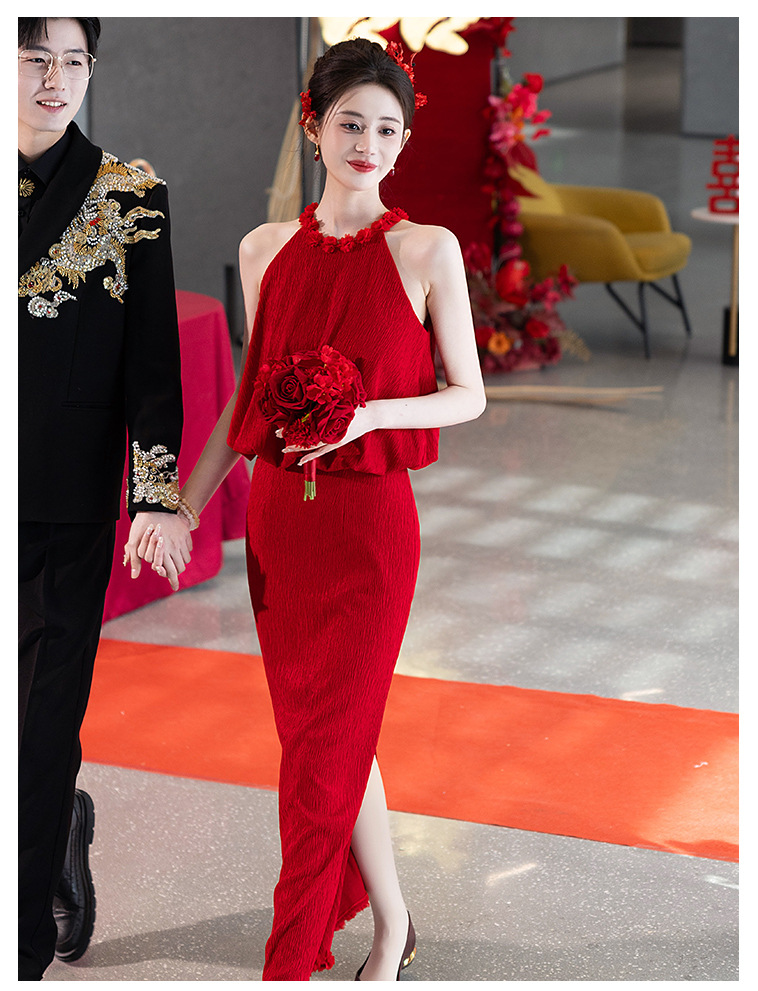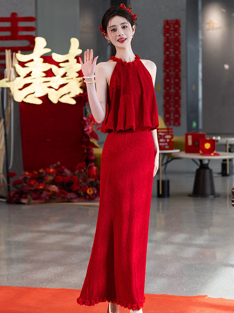 Новое китайское свадебное платье с воротником-халтер, модель 2026 года, с ощущением роскоши, элегантное и стройнящее красное платье для свадебной церемонии.