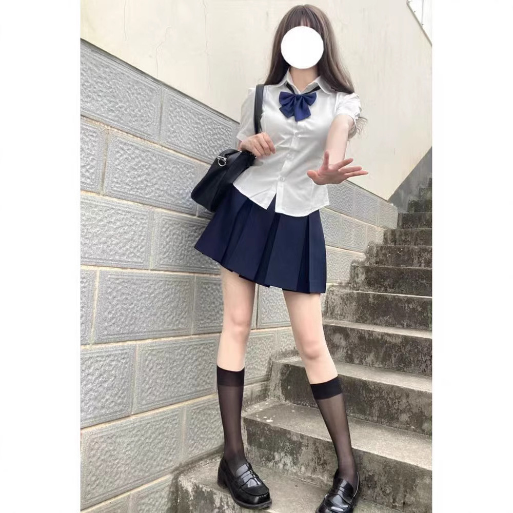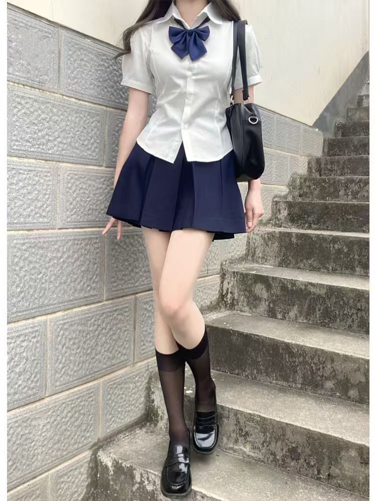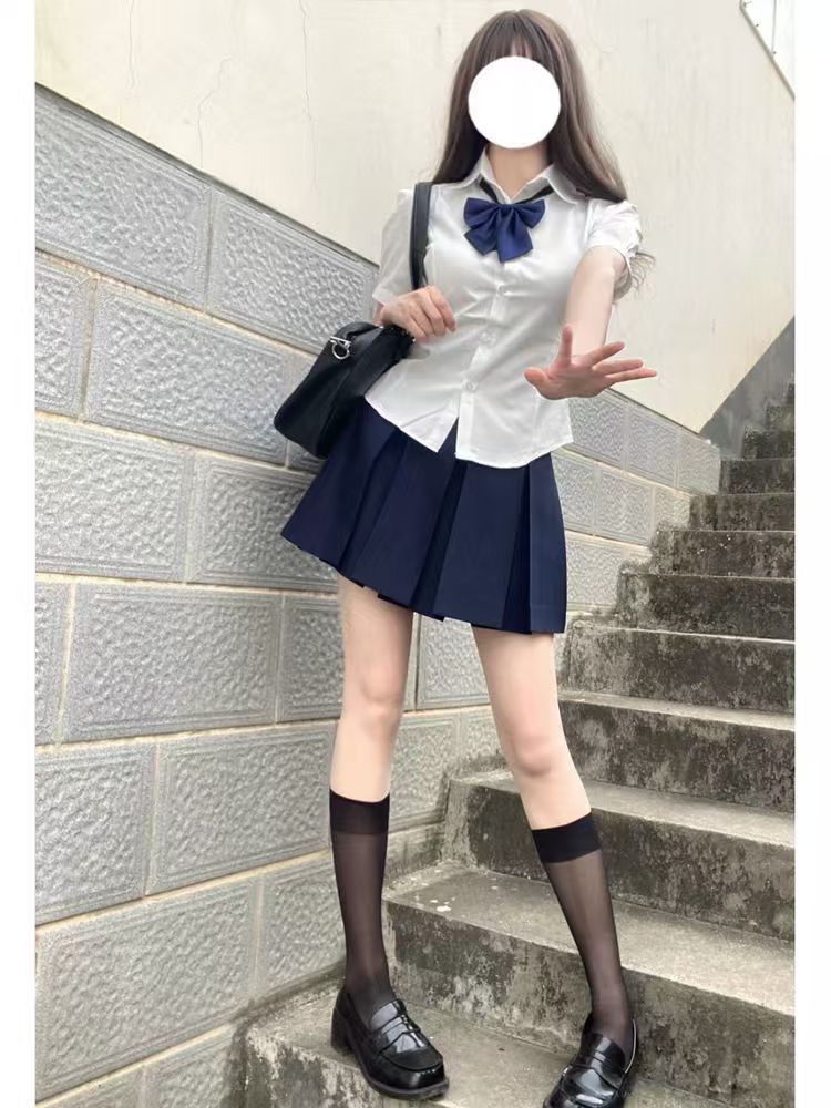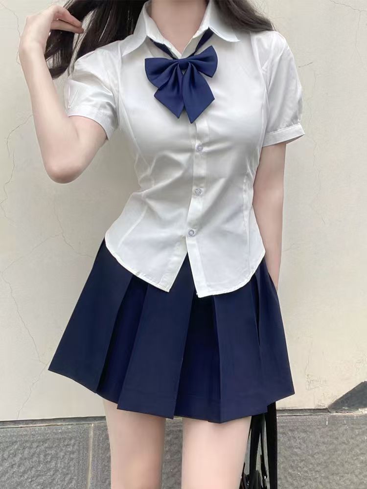 Женская короткая белая рубашка с V-образным вырезом, цельная вещь; Женская короткая белая рубашка с V-образным вырезом + темно-синий галстук; Темно-синяя плиссированная юбка цельная; Женская короткая белая рубашка с V-образным вырезом + темно-синий галстук + темно-синяя плиссированная юбка (костюм)