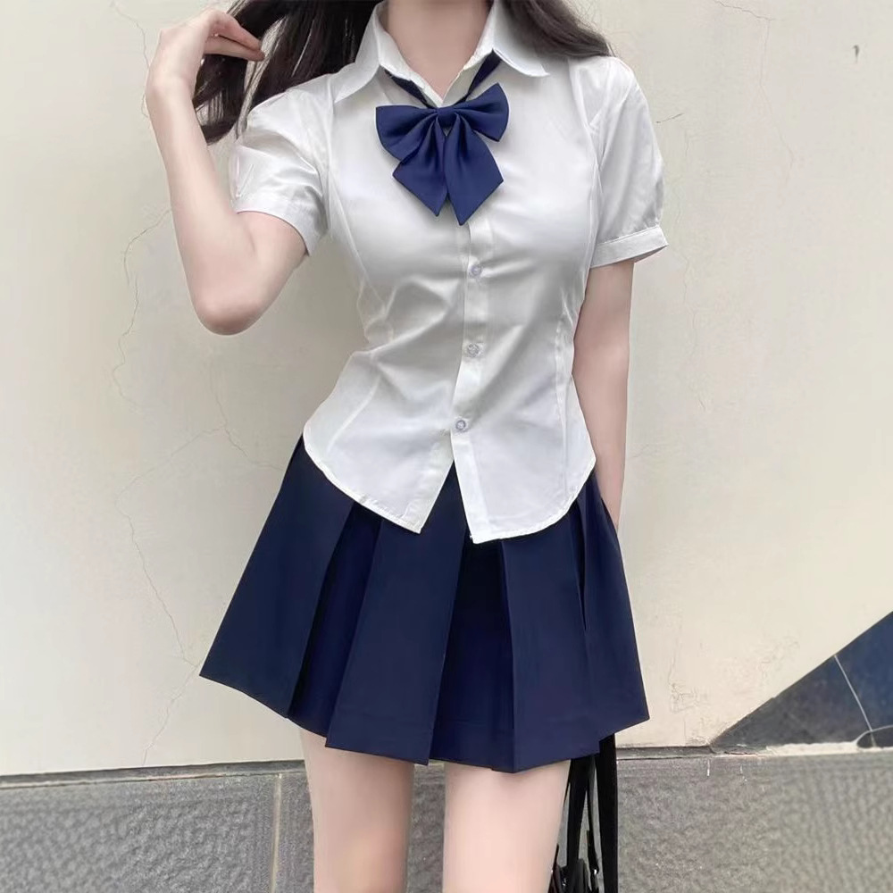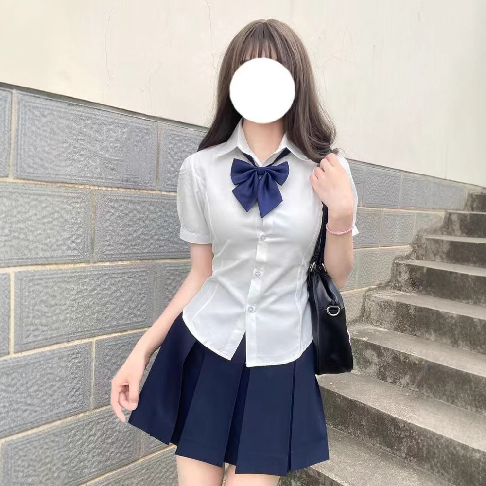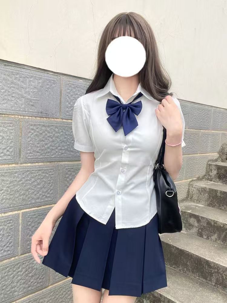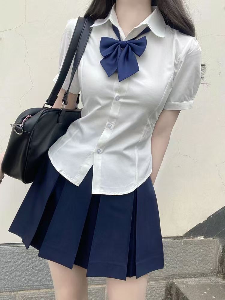 Женская короткая белая рубашка с V-образным вырезом, цельная вещь; Женская короткая белая рубашка с V-образным вырезом + темно-синий галстук; Темно-синяя плиссированная юбка цельная; Женская короткая белая рубашка с V-образным вырезом + темно-синий галстук + темно-синяя плиссированная юбка (костюм)