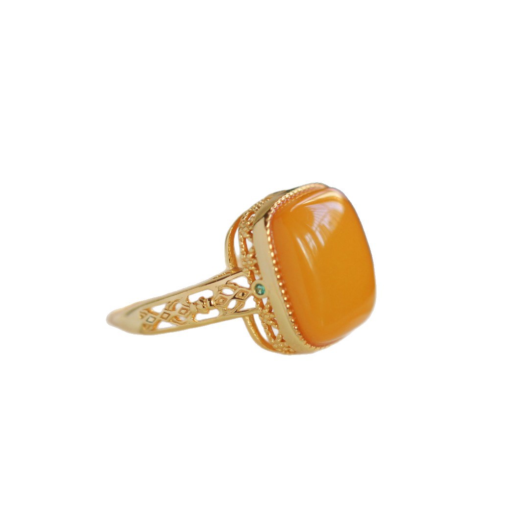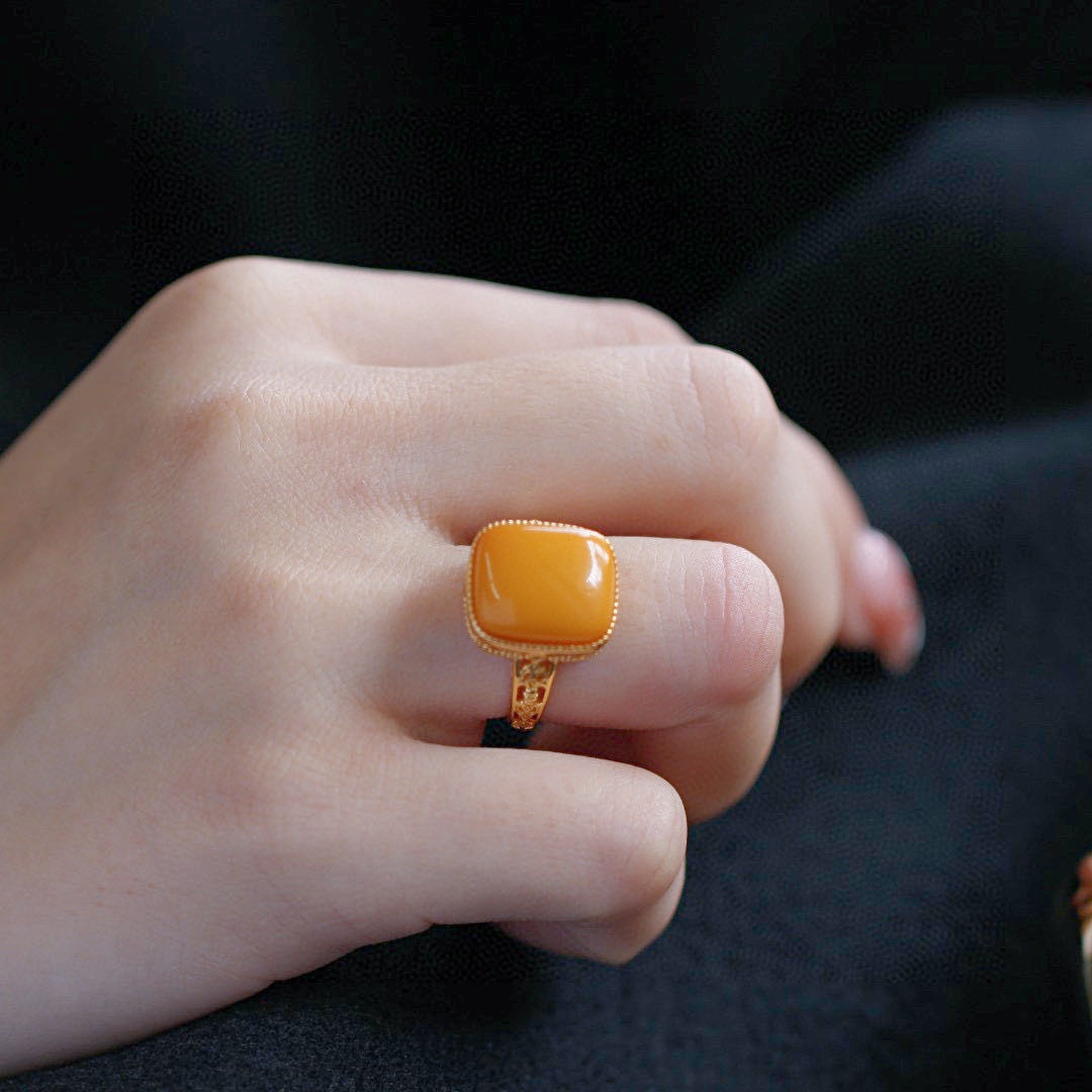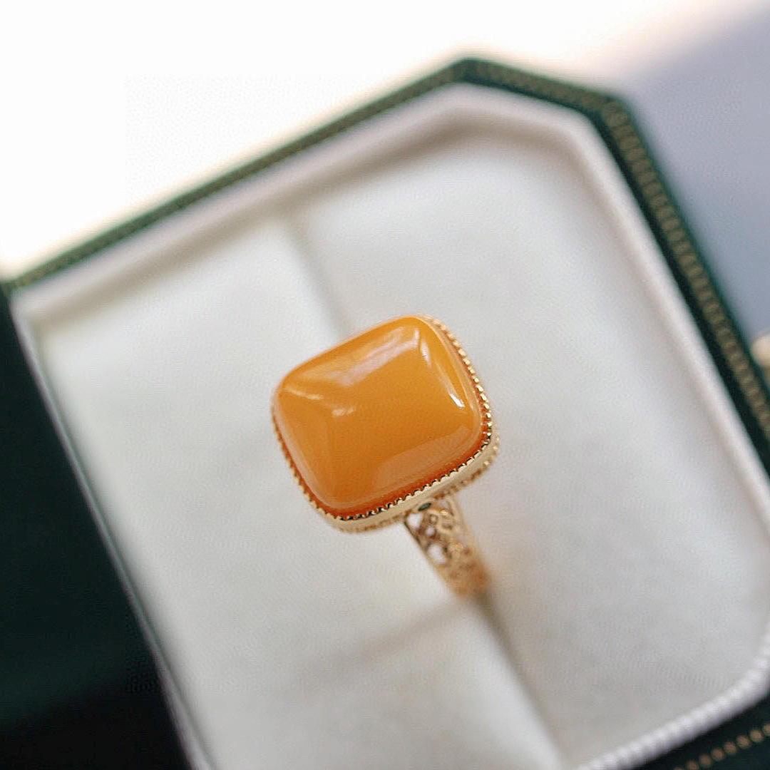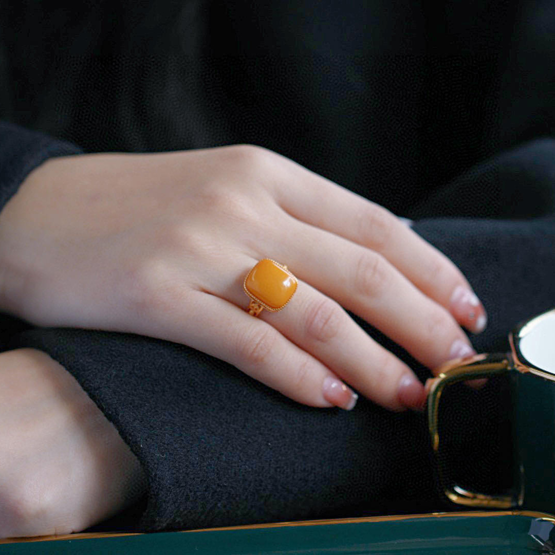 [Серебро S925] Кольцо с кубиком сахара из старого янтаря — около 12×14 мм; 【Серебро S925】Кольцо с янтарным кубиком сахара в стиле состаренности – приблизительно 10*10 мм