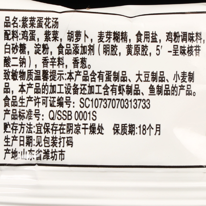 配料表:鸡蛋、紫菜、胡萝卜、麦芽糊精、食用盐、鸡粉调味料、白砂糖、淀粉、食品添加剂(明胶、黄原胶、5'-呈味核苷酸二钠)、香辛料、香葱等,以产品外包装实际信息为准。