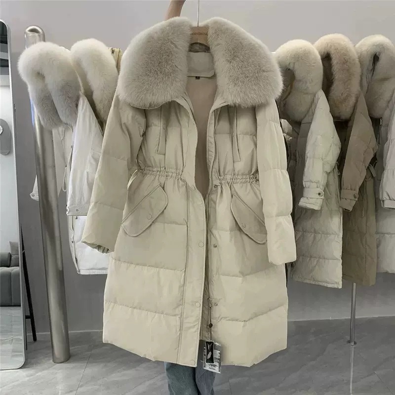 Пуховик женский средней длины, зима 2021, новинка лисы, большой меховой воротник, утолщенная куртка на талии, женская одежда оптом