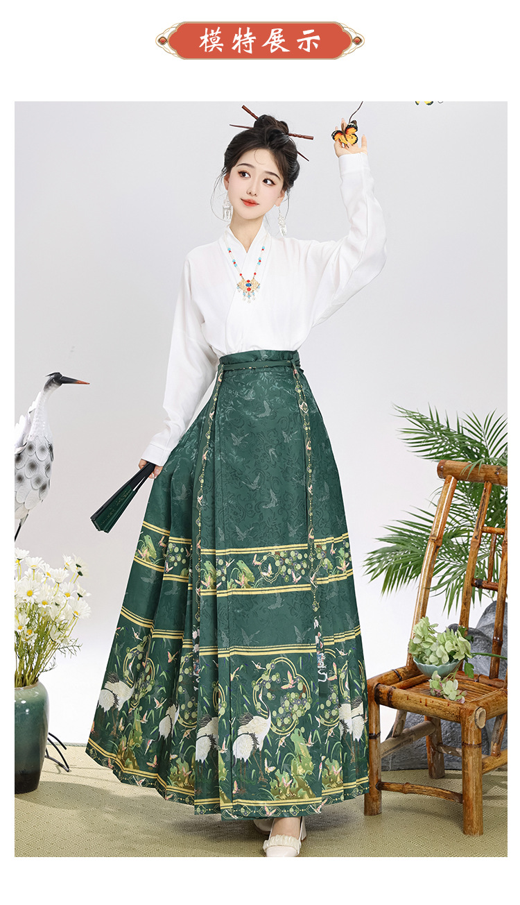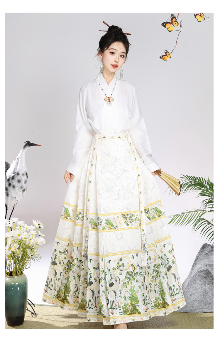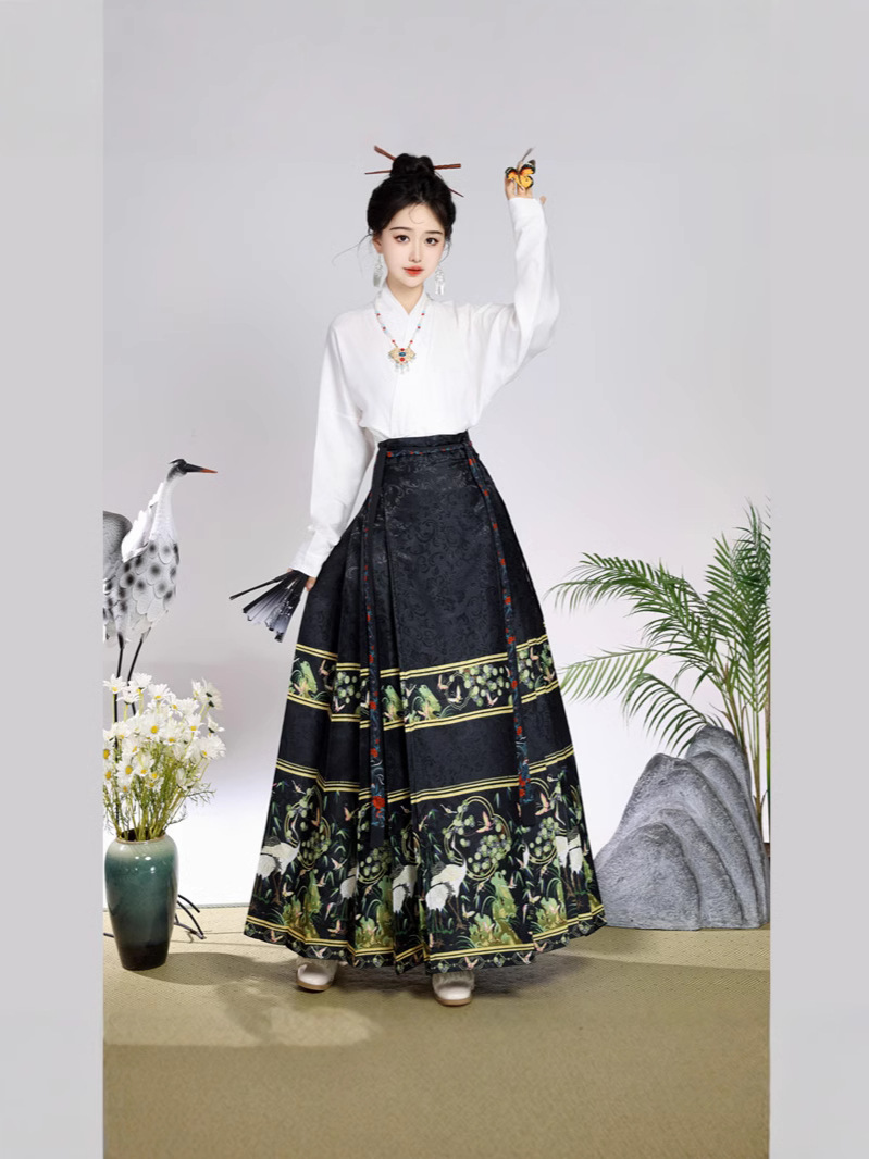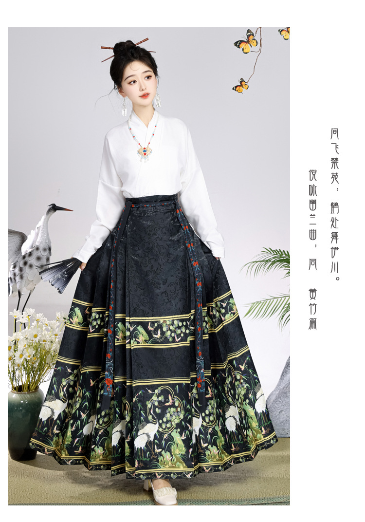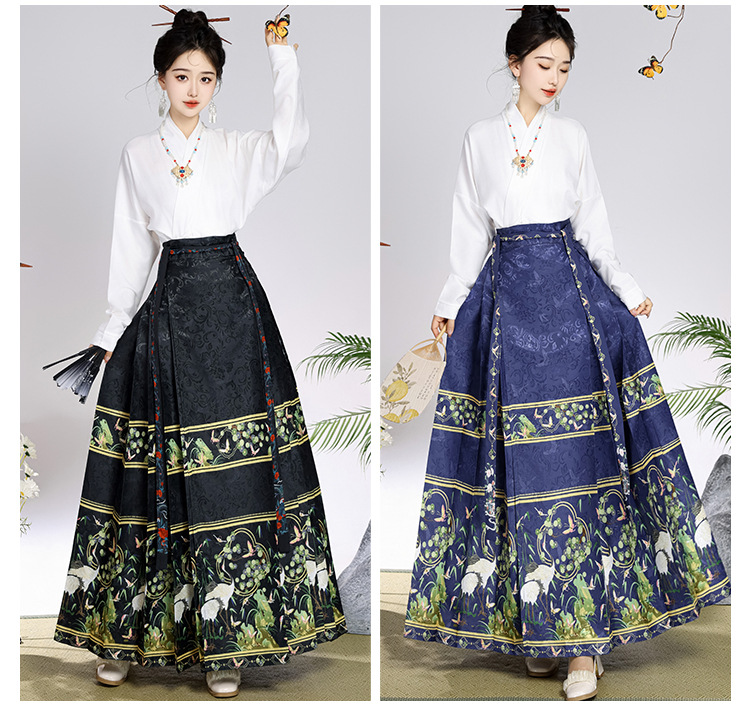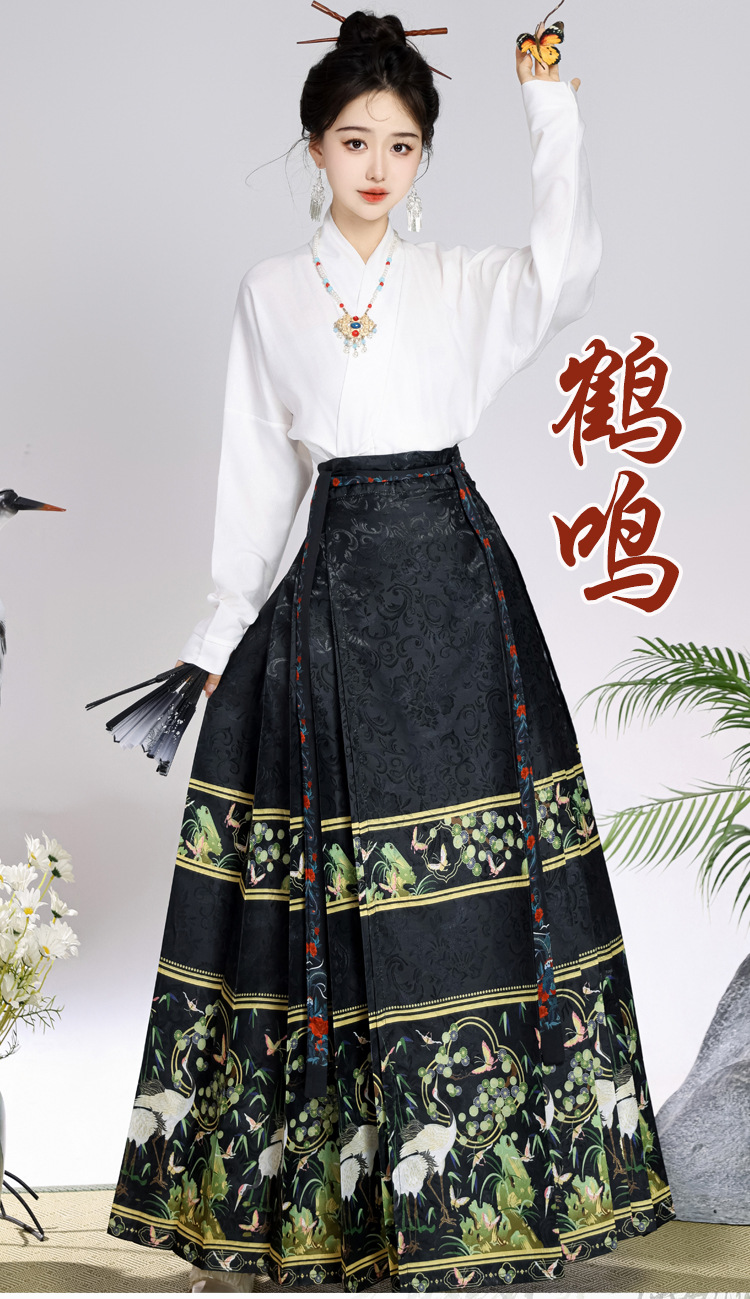 Юбка с черной лошадью Мин + белый топ; Юбка с зеленой лицом лошади Мин + белый топ; Синяя юбка с лицом лошади Мин + белый топ; Юбка He Ming белая лошади + белый топ; Юбка He Ming с одним черным конским лицом; Юбка He Ming с одним зеленым конским лицом; Юбка с одинарным синим конским лицом He Ming; Юбка He Ming с одним белым конским лицом