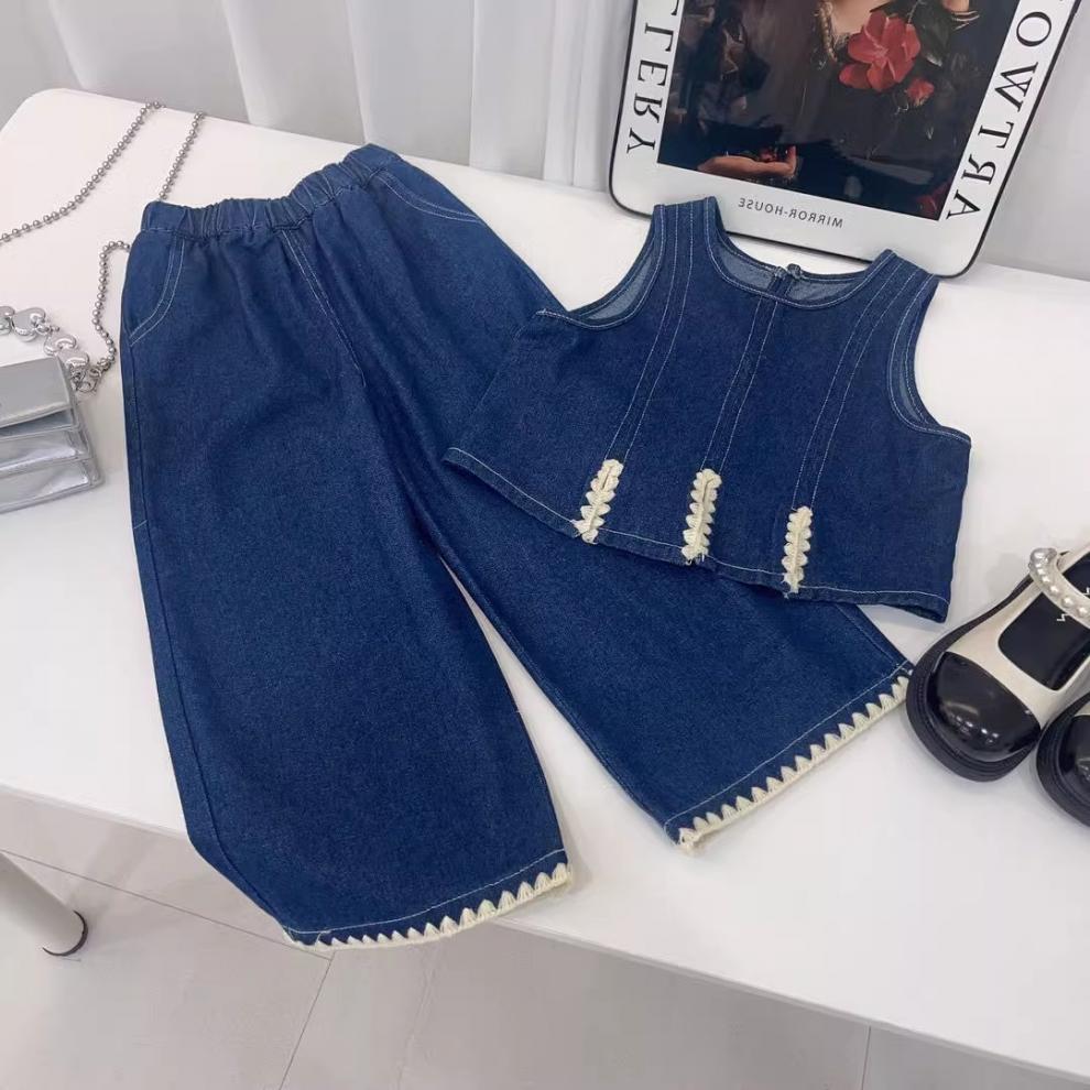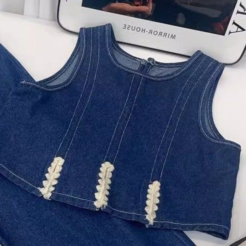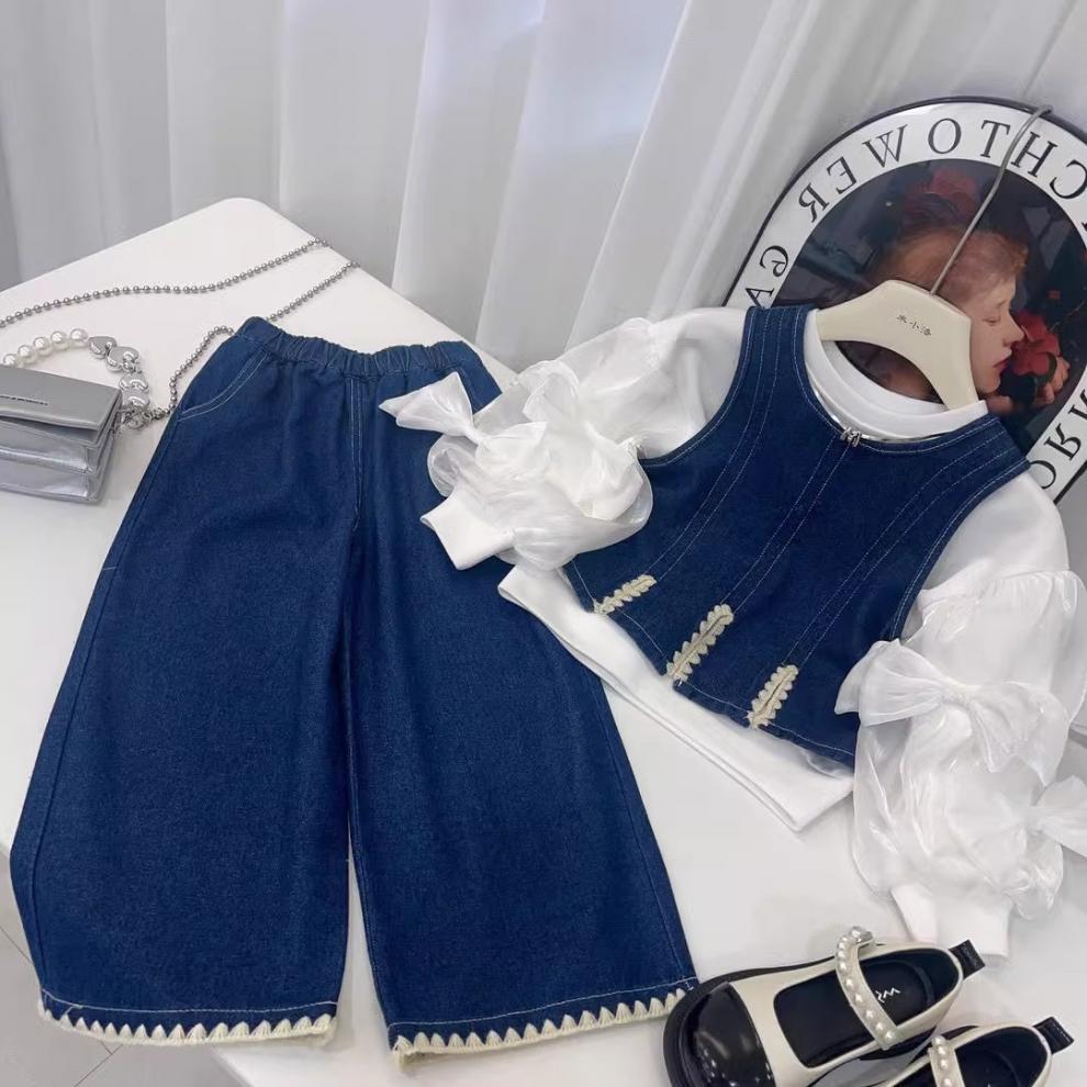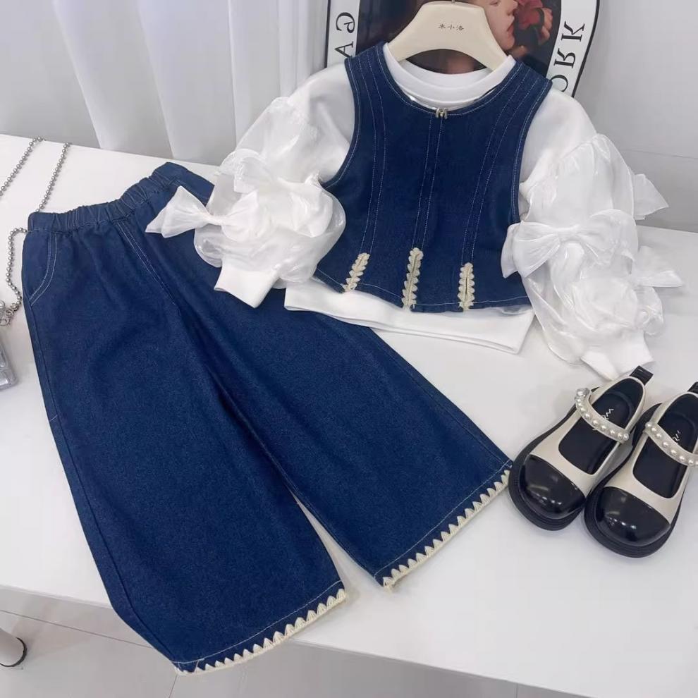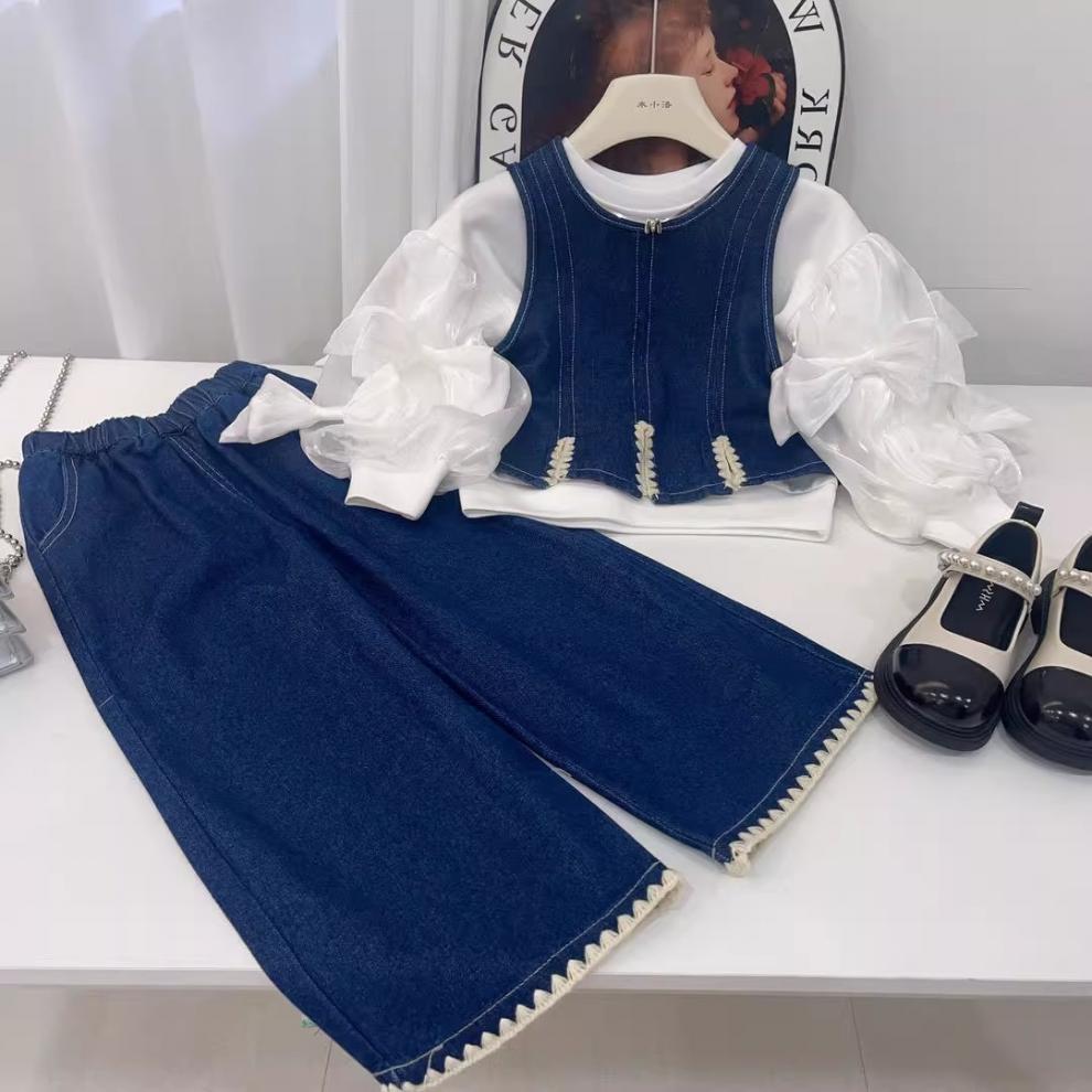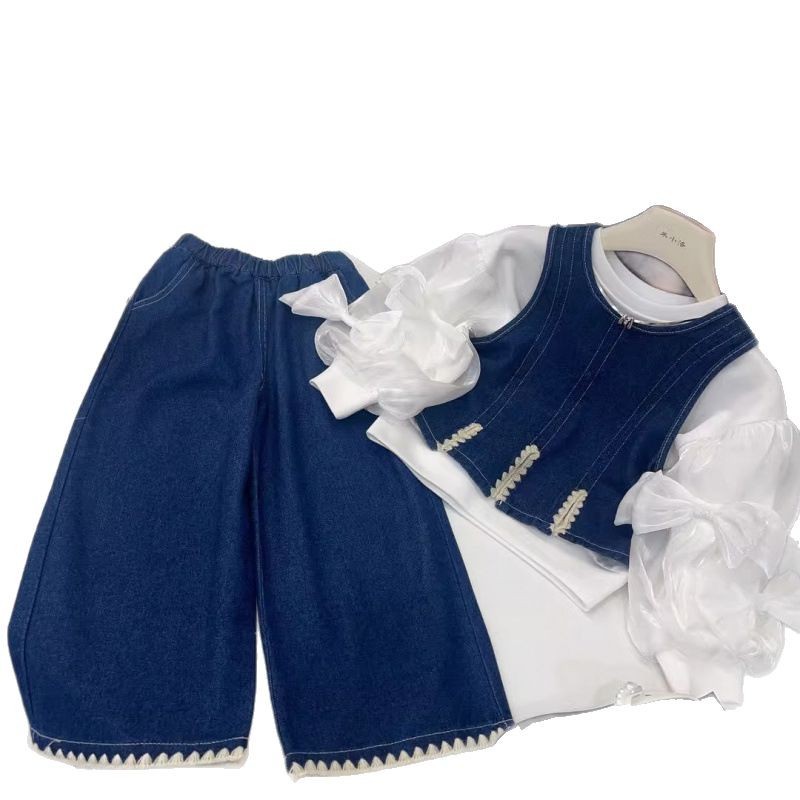 Девочка имитация джинсовой одежды из трех частей 2024 осень новая корейская девушка весна и осень иностранные детские широкие брюки