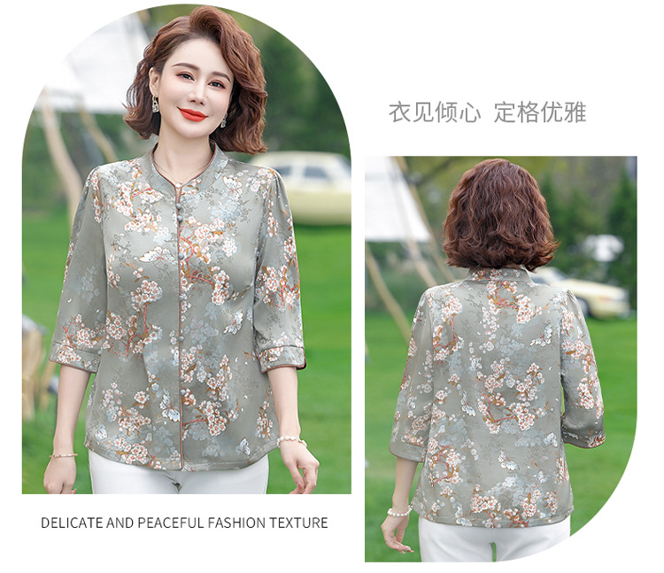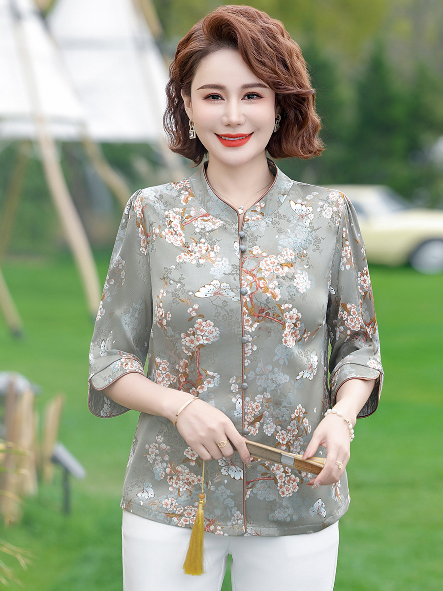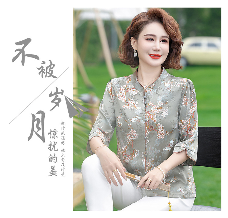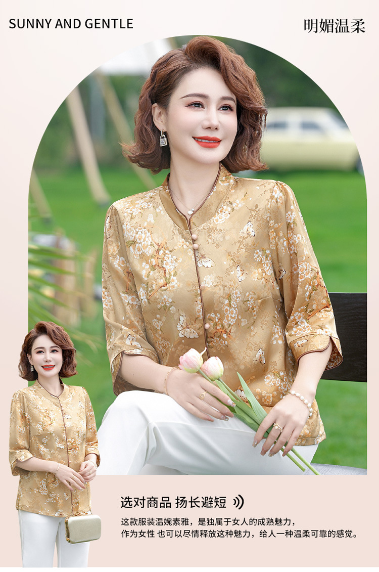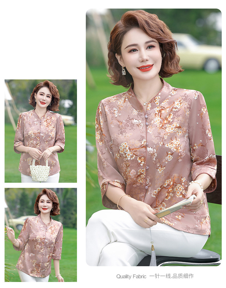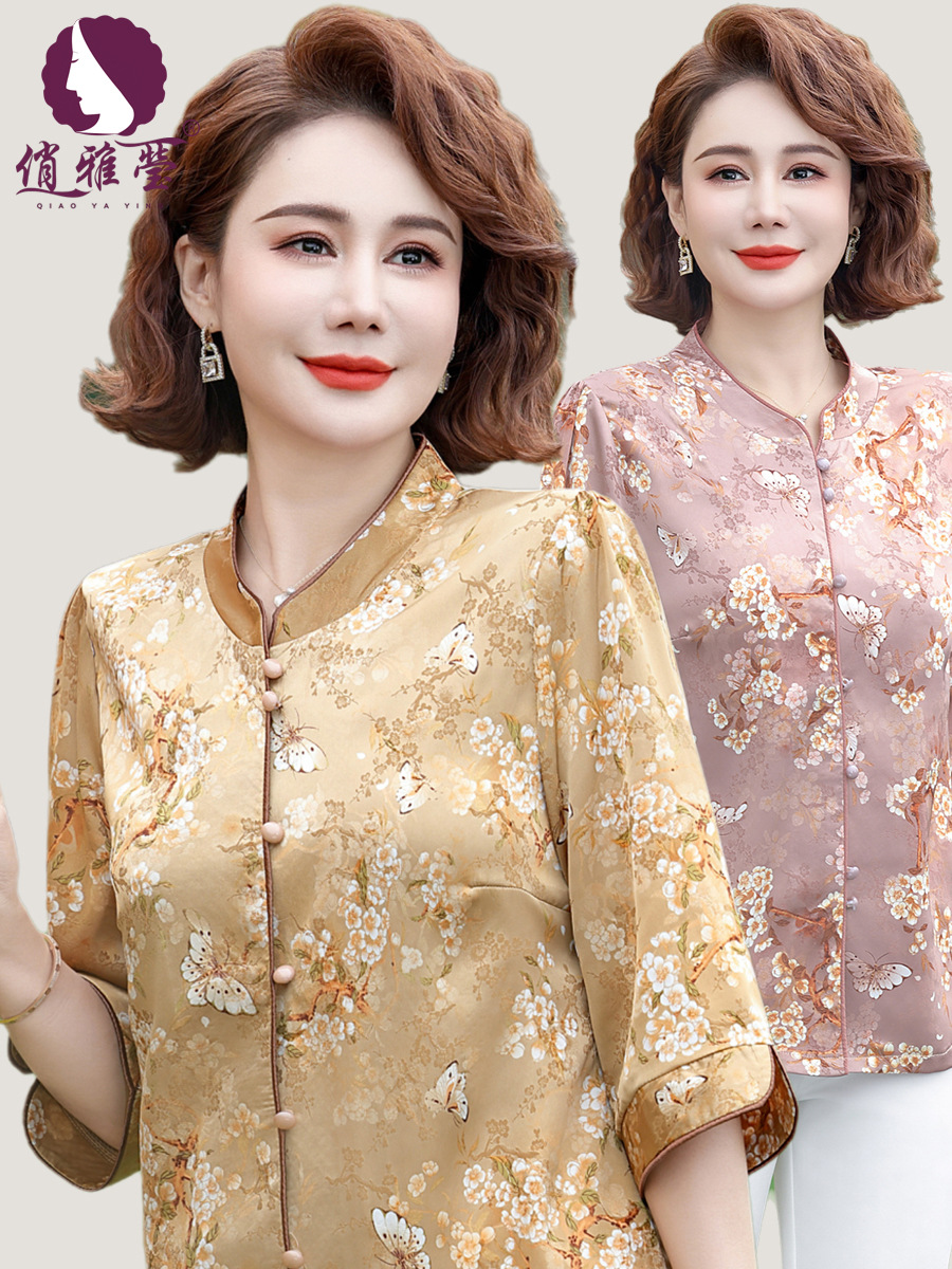 Элегантная женская футболка Qiaoyaying из искусственного шелка для женщин 50-60 лет, новая коллекция Весна/Лето 2025, с рукавом три четверти, с принтом, для мам