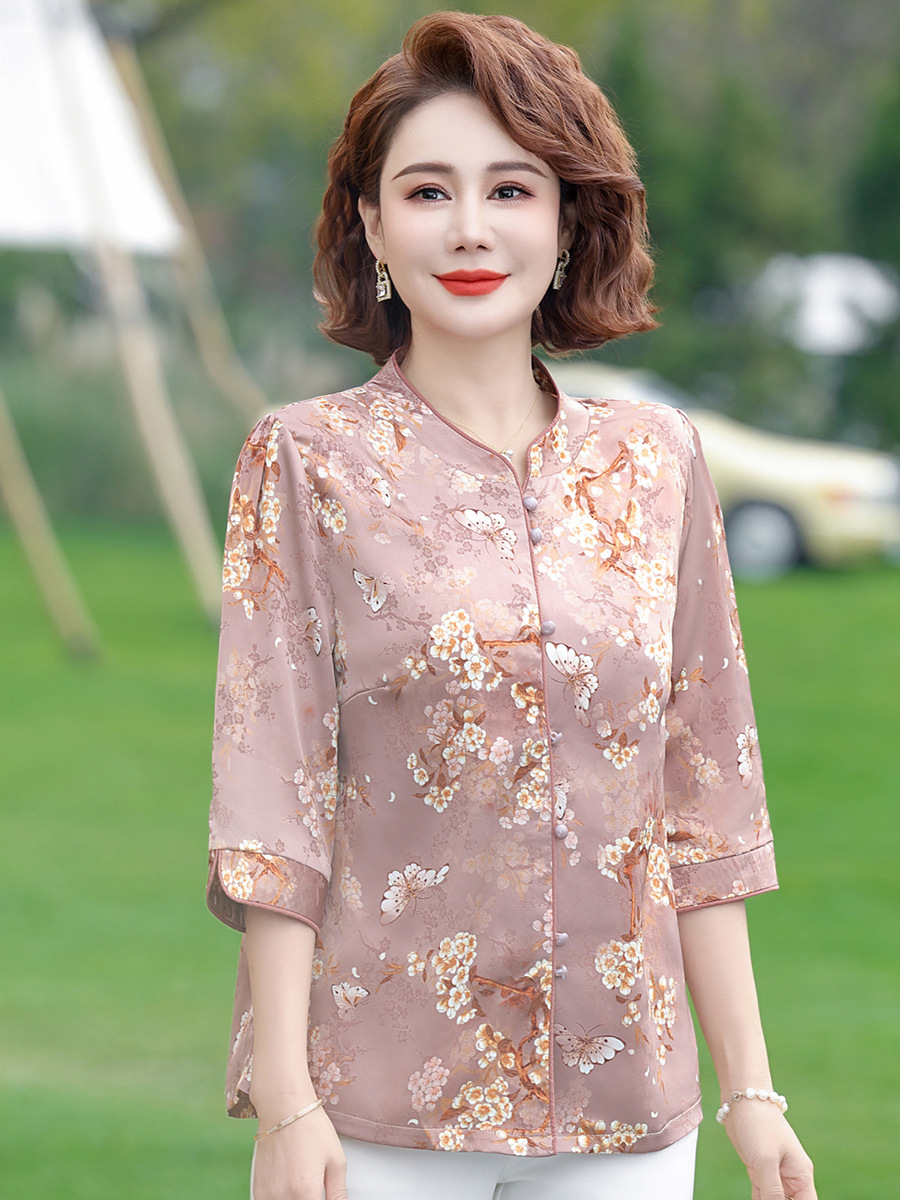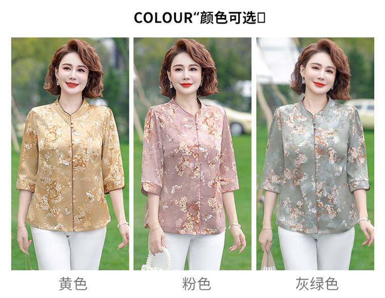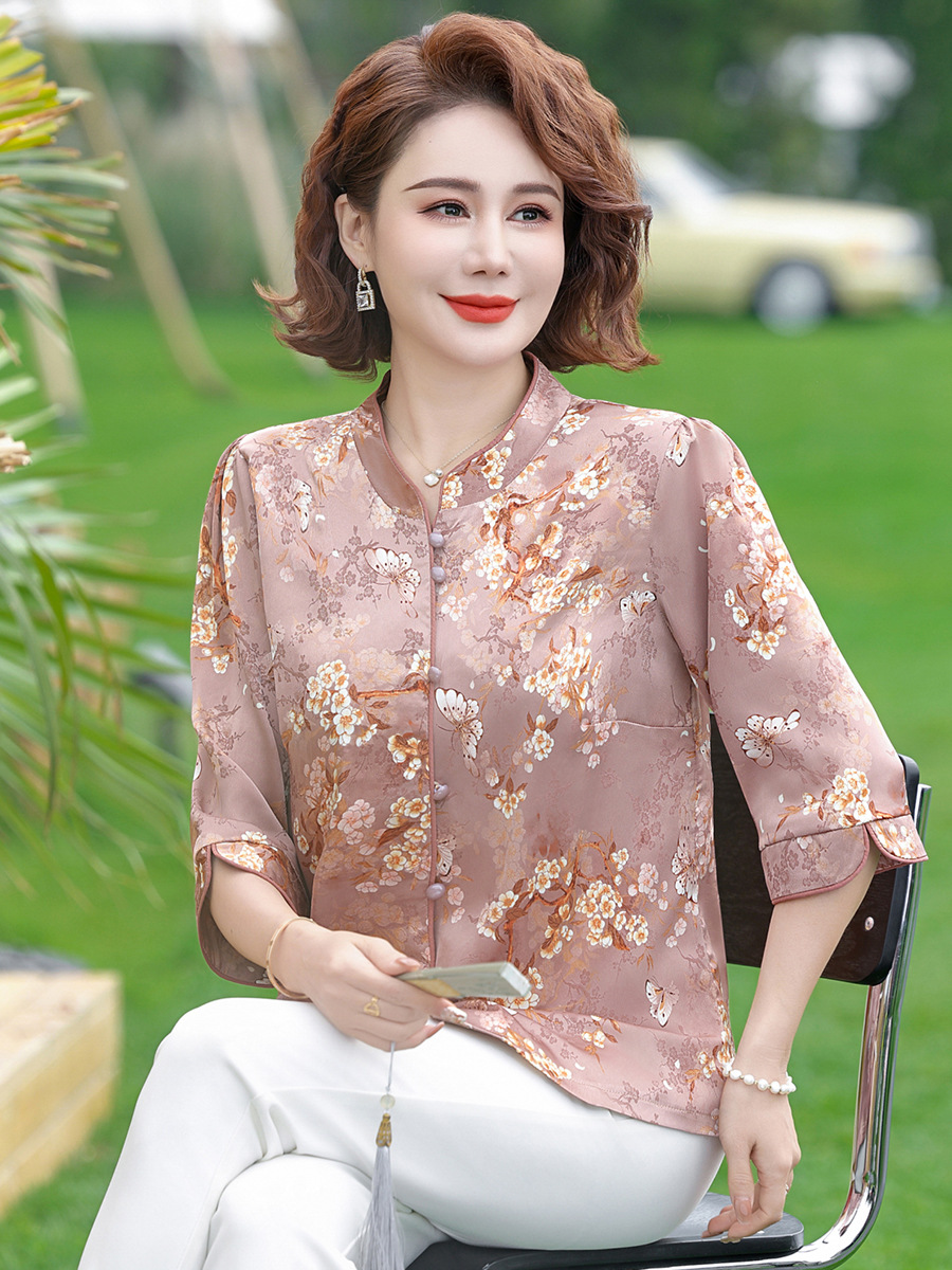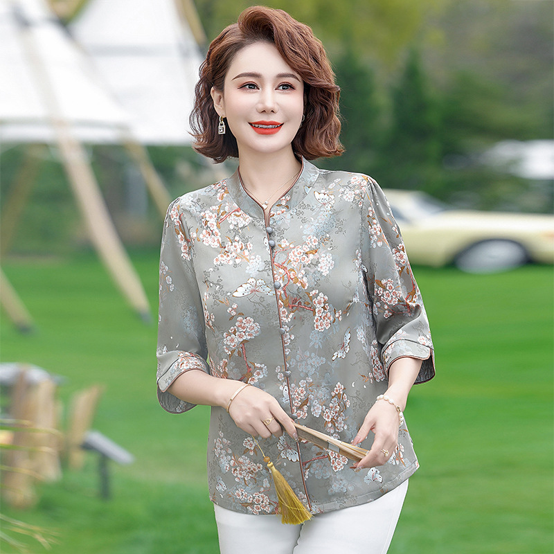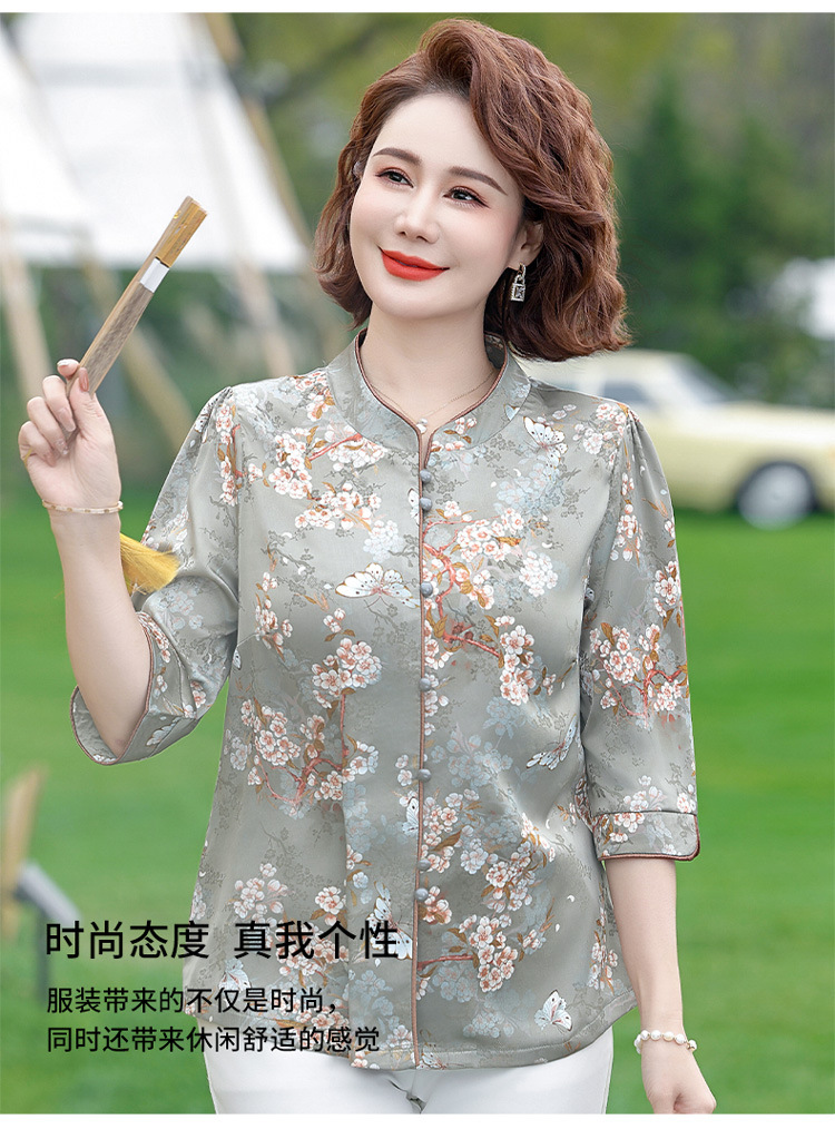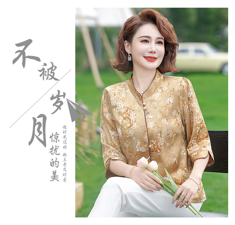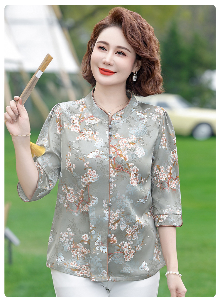 Элегантная женская футболка Qiaoyaying из искусственного шелка для женщин 50-60 лет, новая коллекция Весна/Лето 2025, с рукавом три четверти, с принтом, для мам
