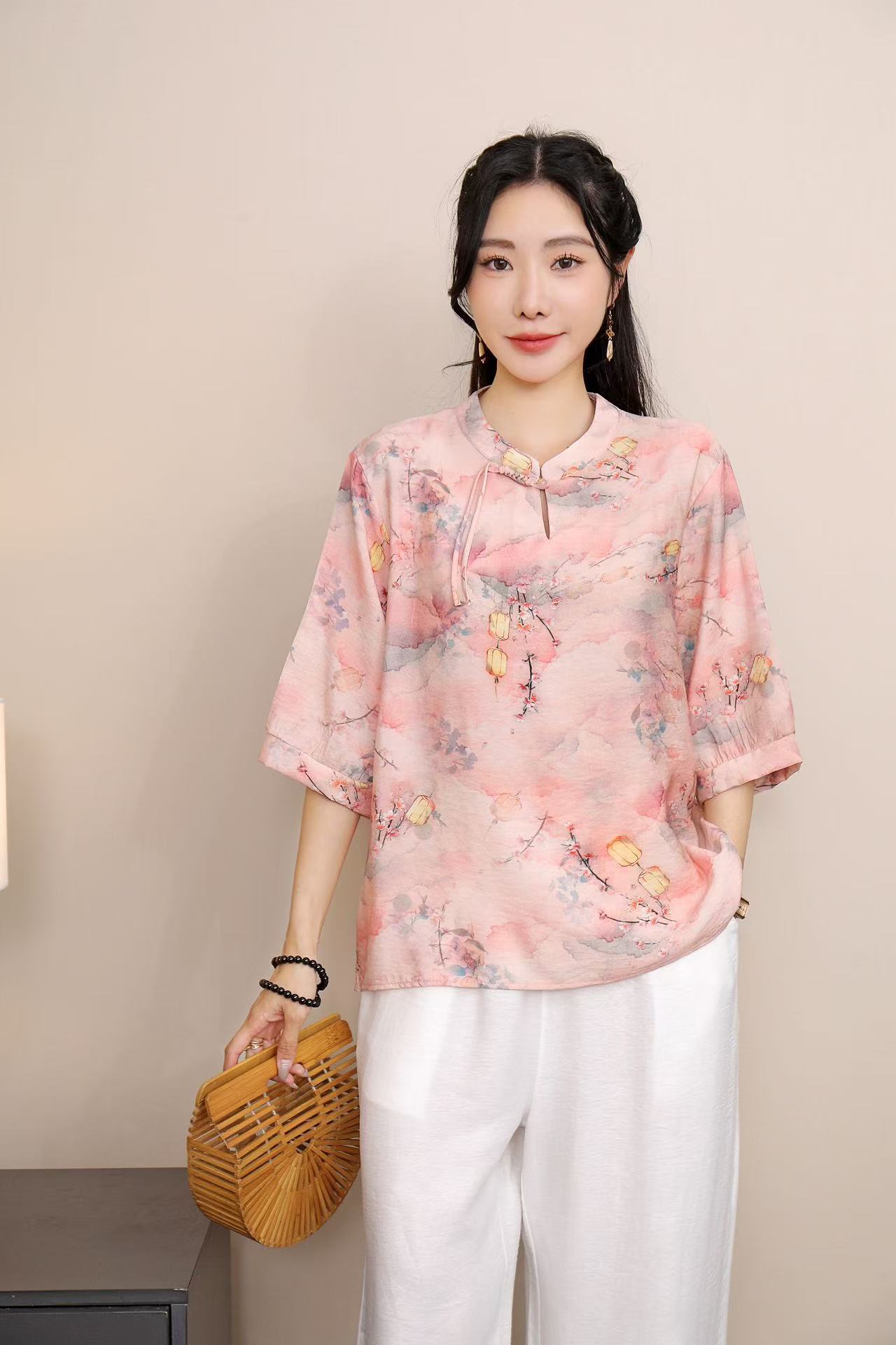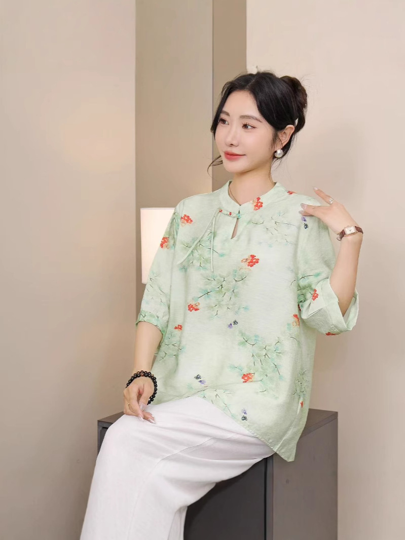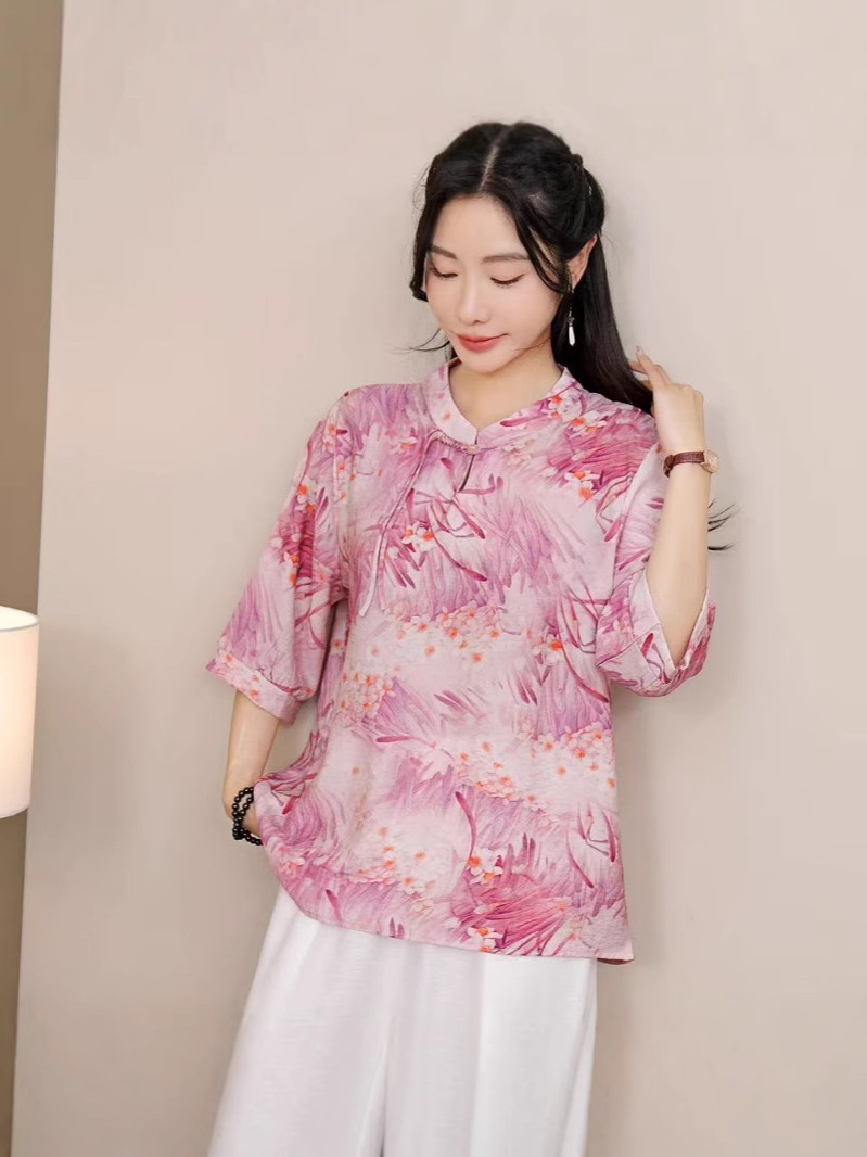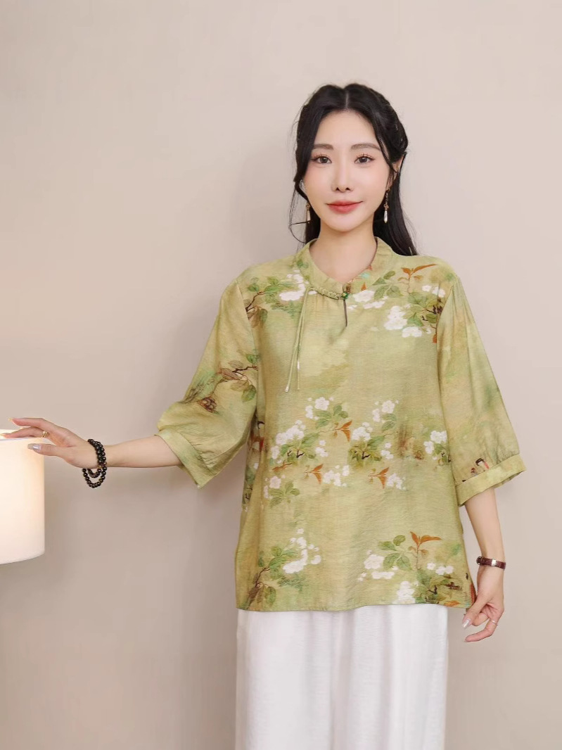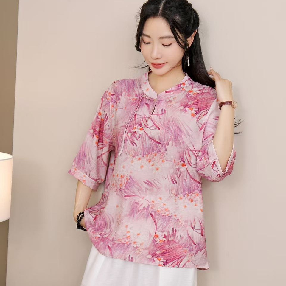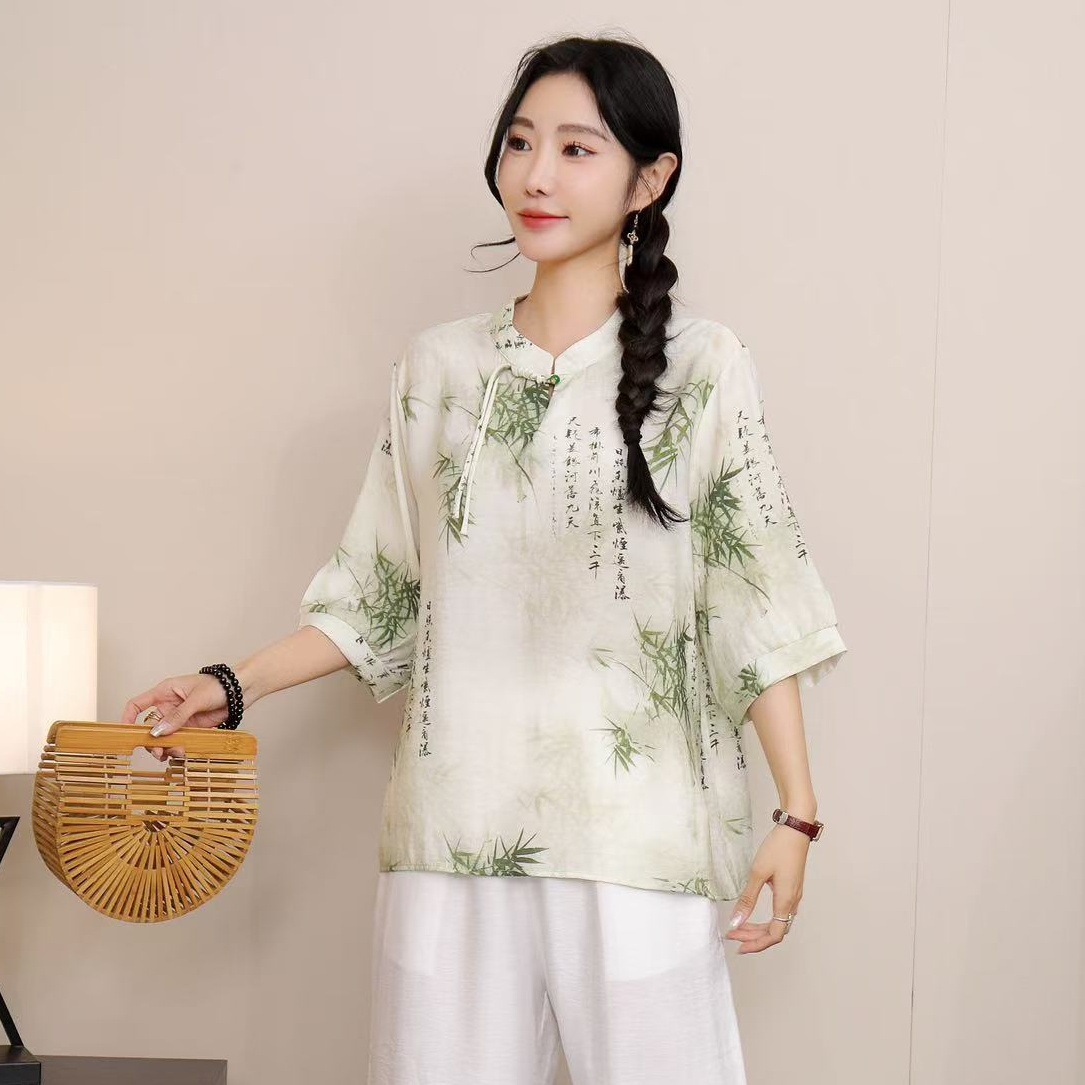 2025 Летняя женская одежда в китайском стиле улучшенная одежда Tang женский топ с короткими рукавами ретро литературный стиль этническая одежда рубашка