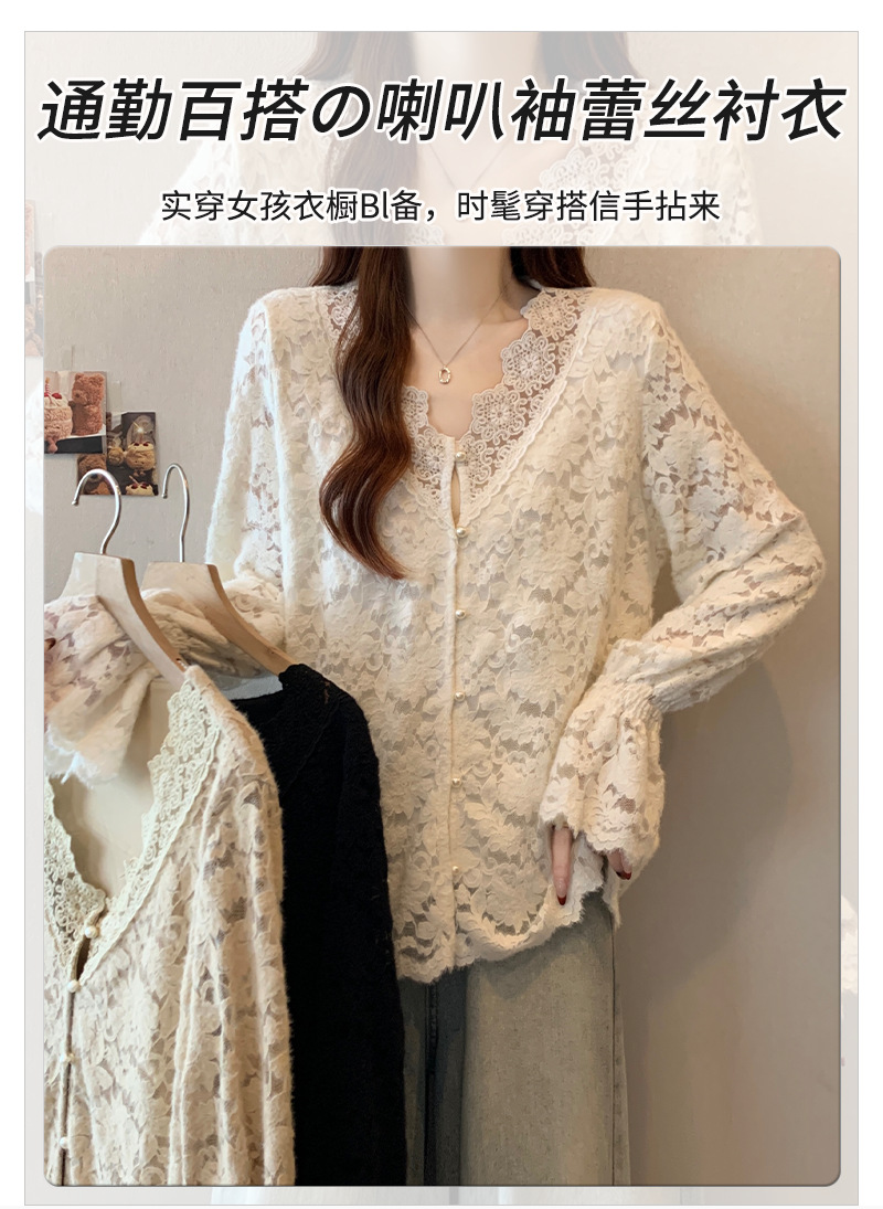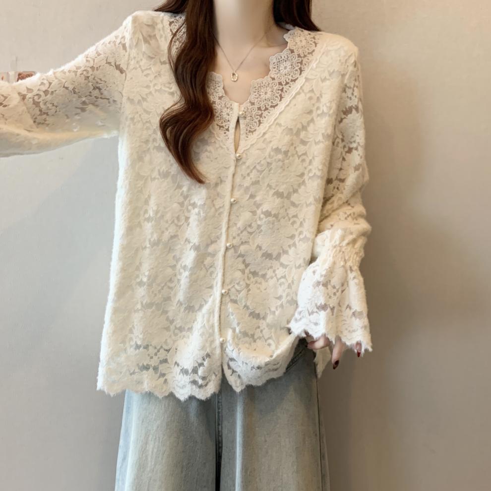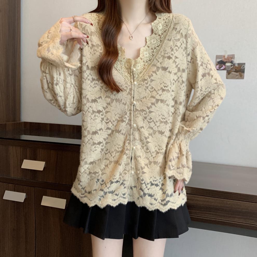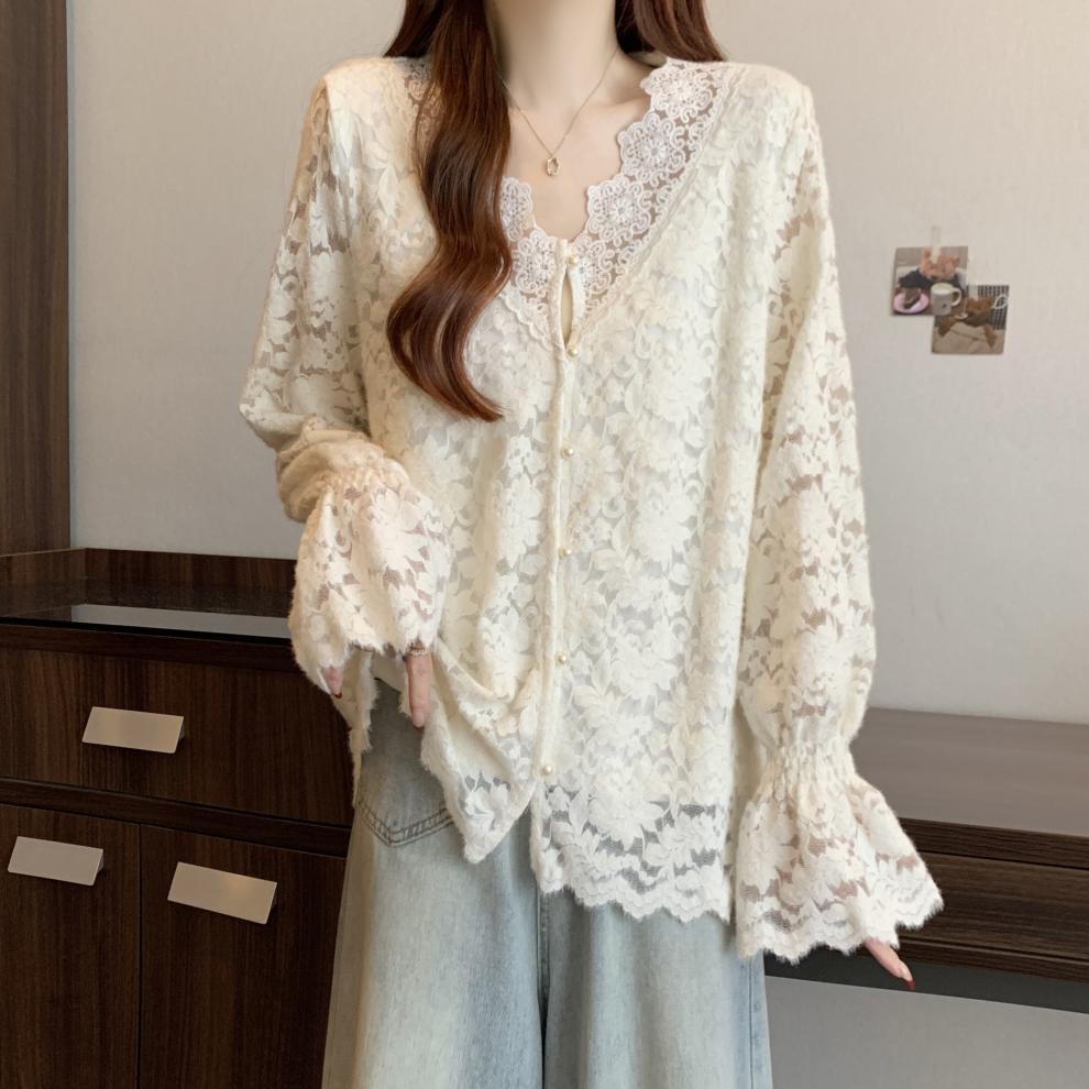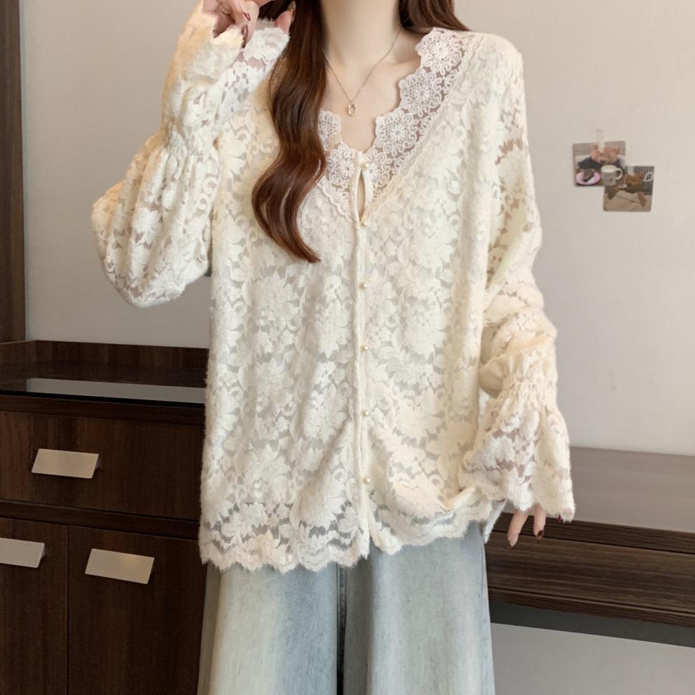 Женская одежда большого размера 2025 весна новая нишевые мода кружево V-образный вырез свободная блузка с длинными рукавами