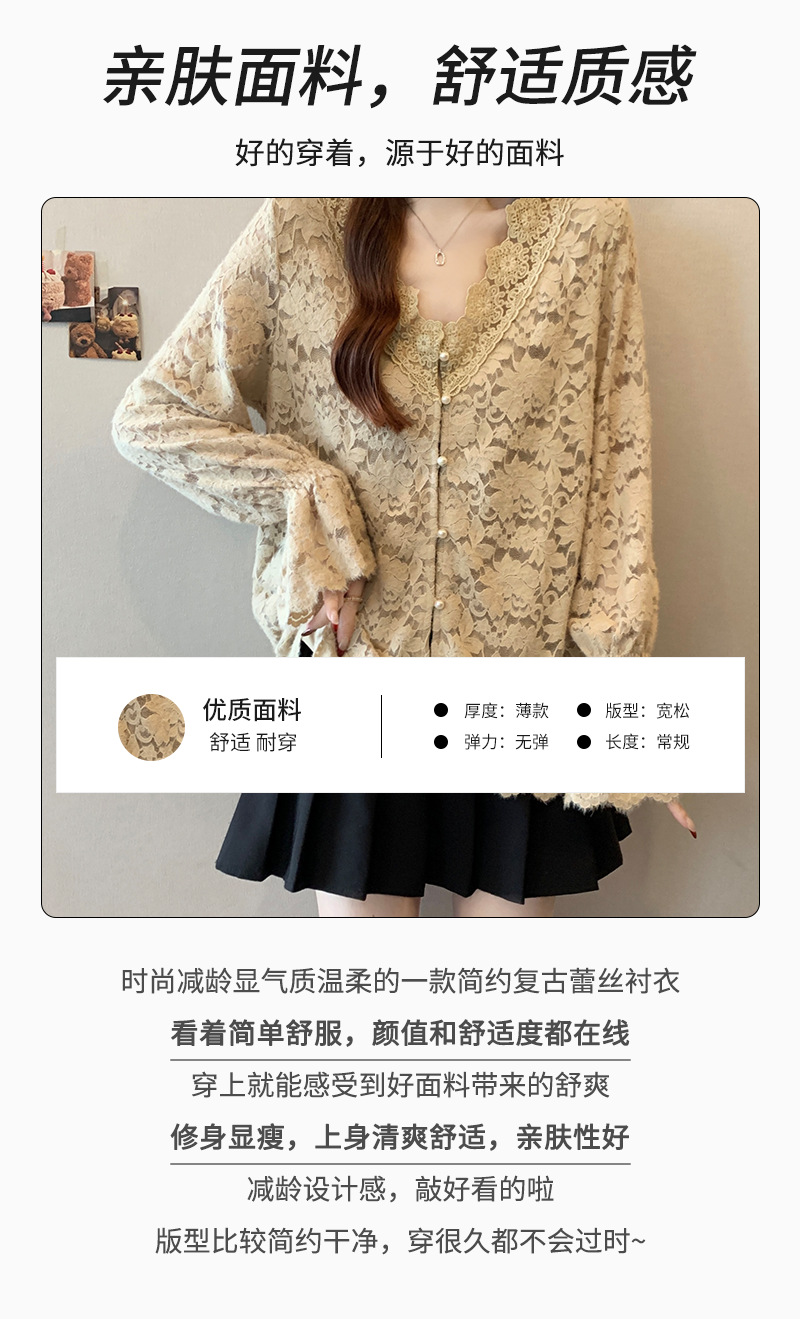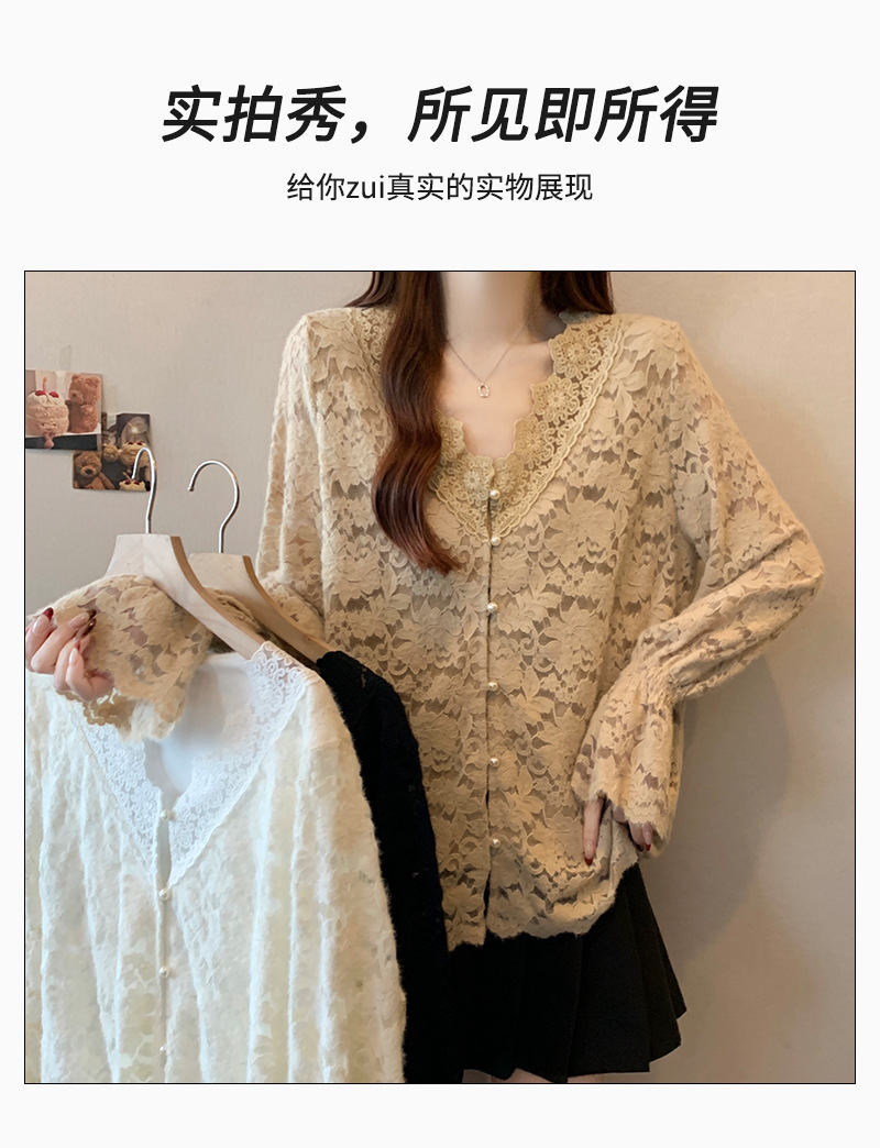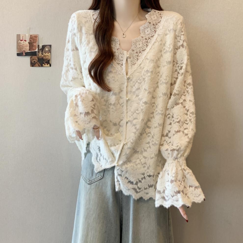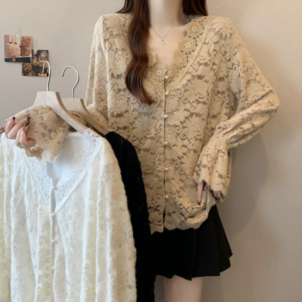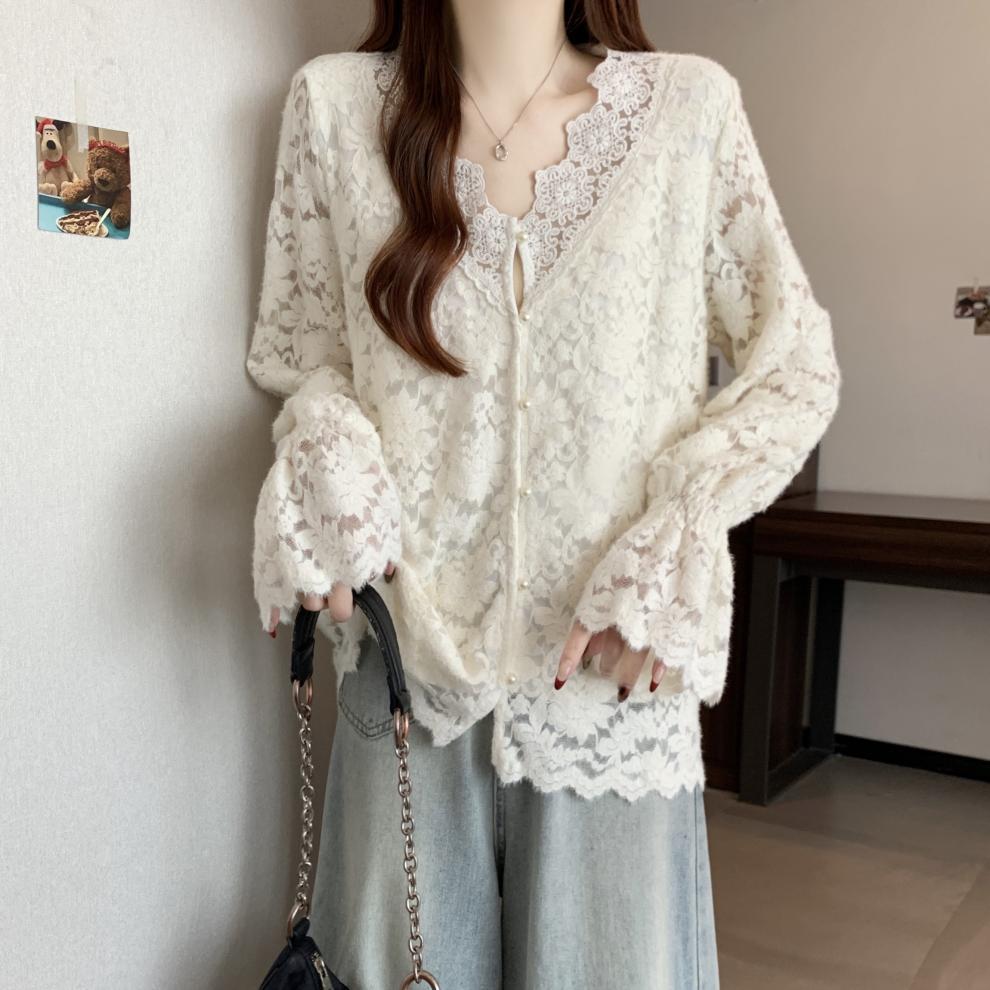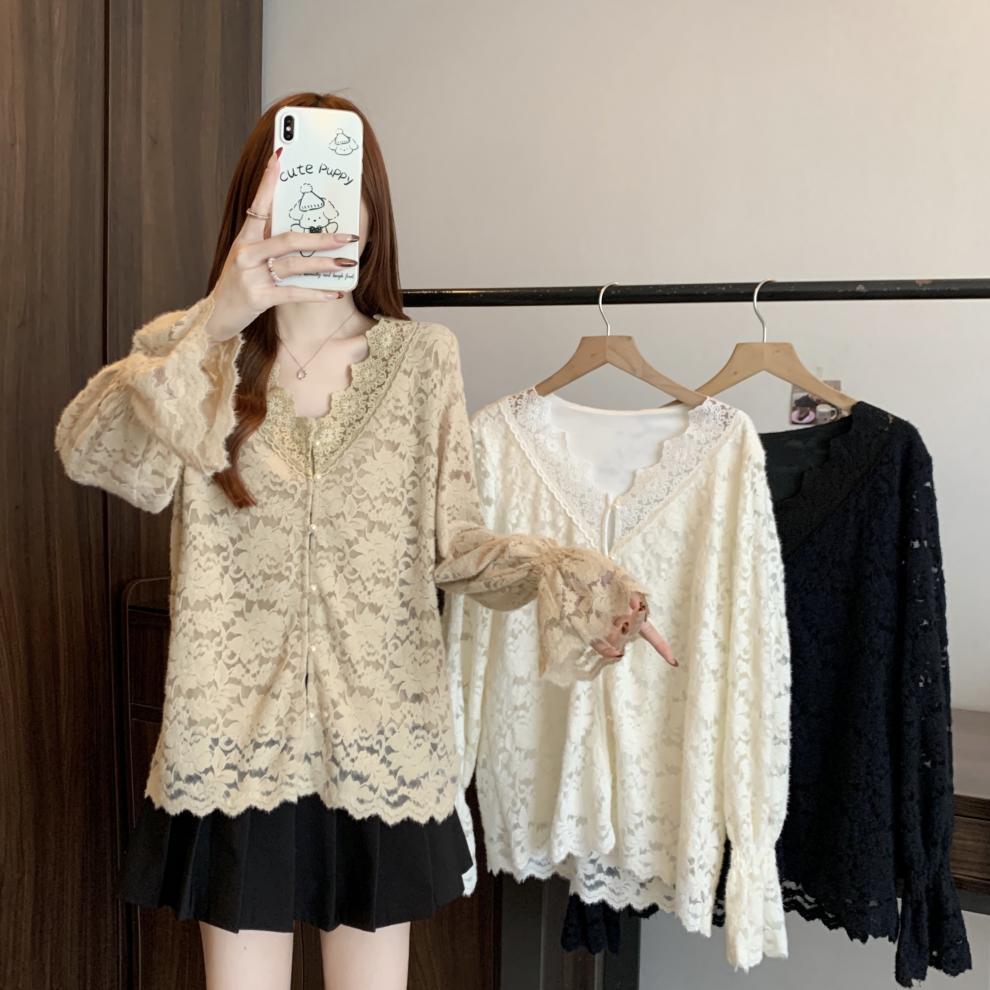 Женская одежда большого размера 2025 весна новая нишевые мода кружево V-образный вырез свободная блузка с длинными рукавами