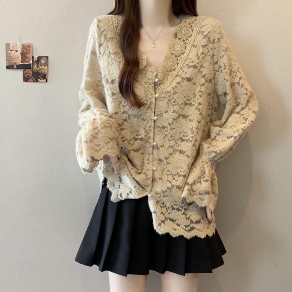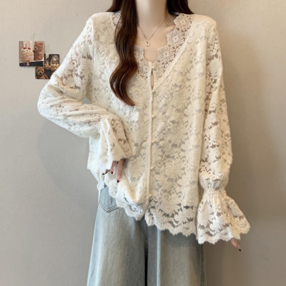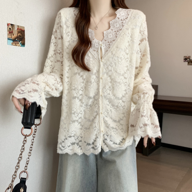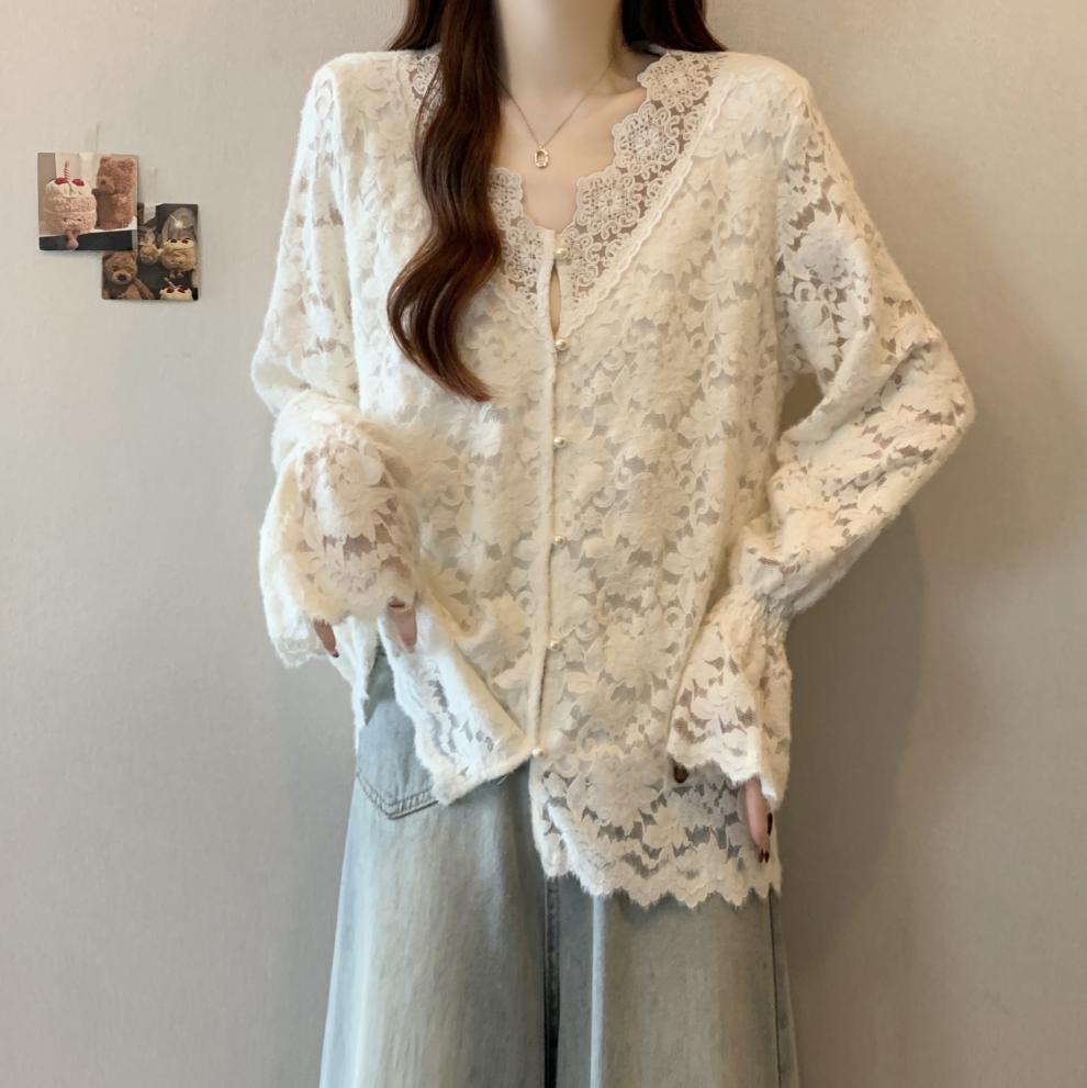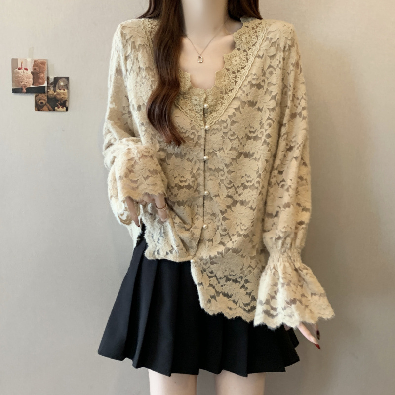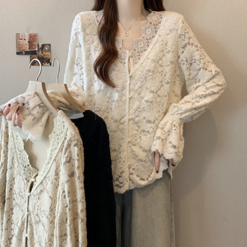 Женская одежда большого размера 2025 весна новая нишевые мода кружево V-образный вырез свободная блузка с длинными рукавами