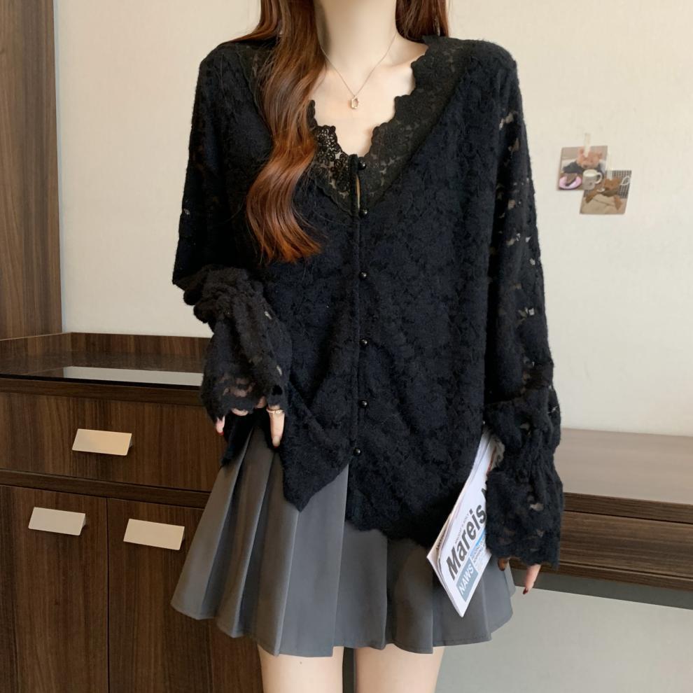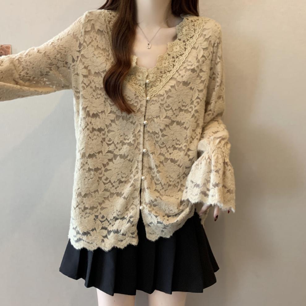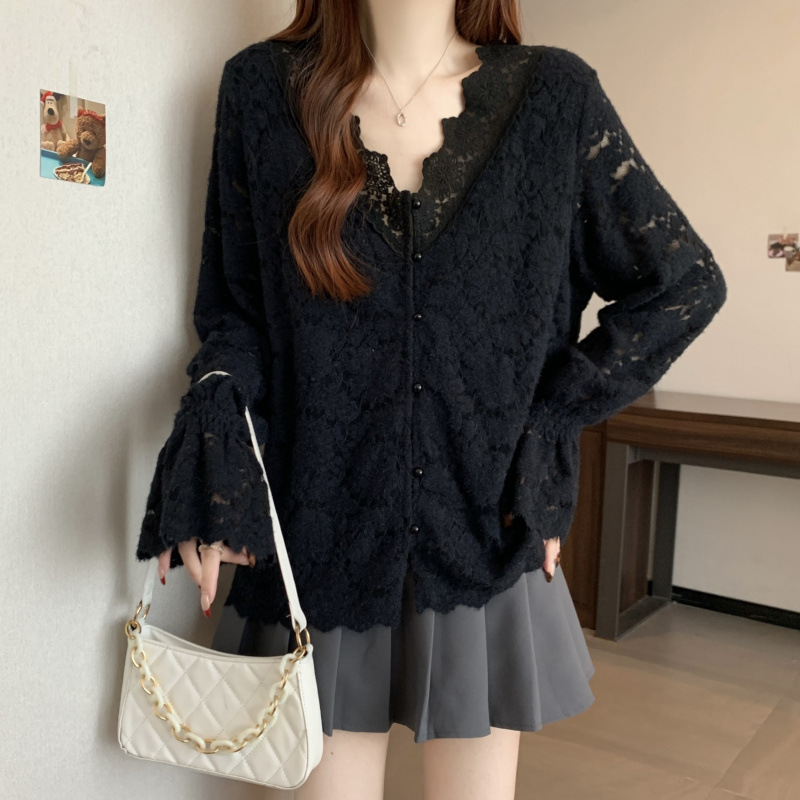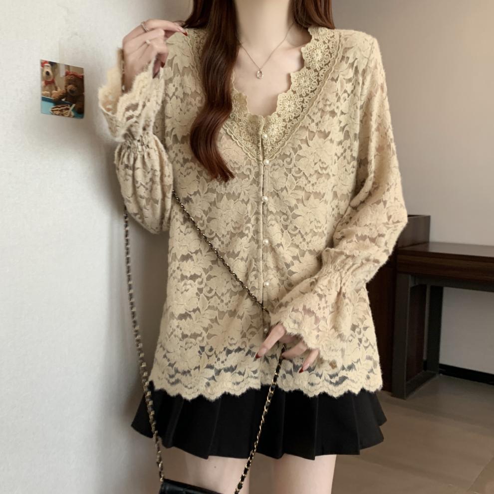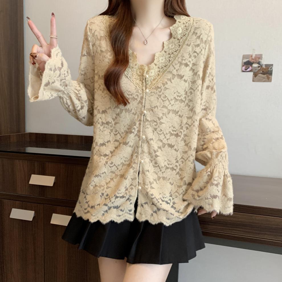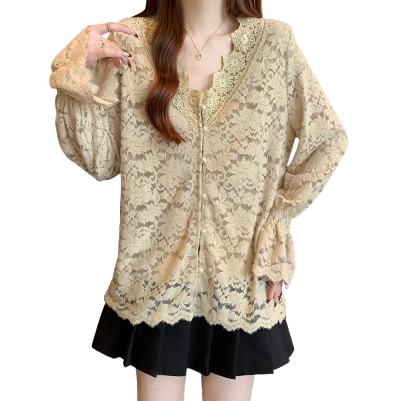 Женская одежда большого размера 2025 весна новая нишевые мода кружево V-образный вырез свободная блузка с длинными рукавами
