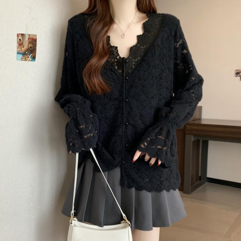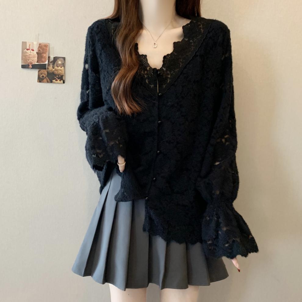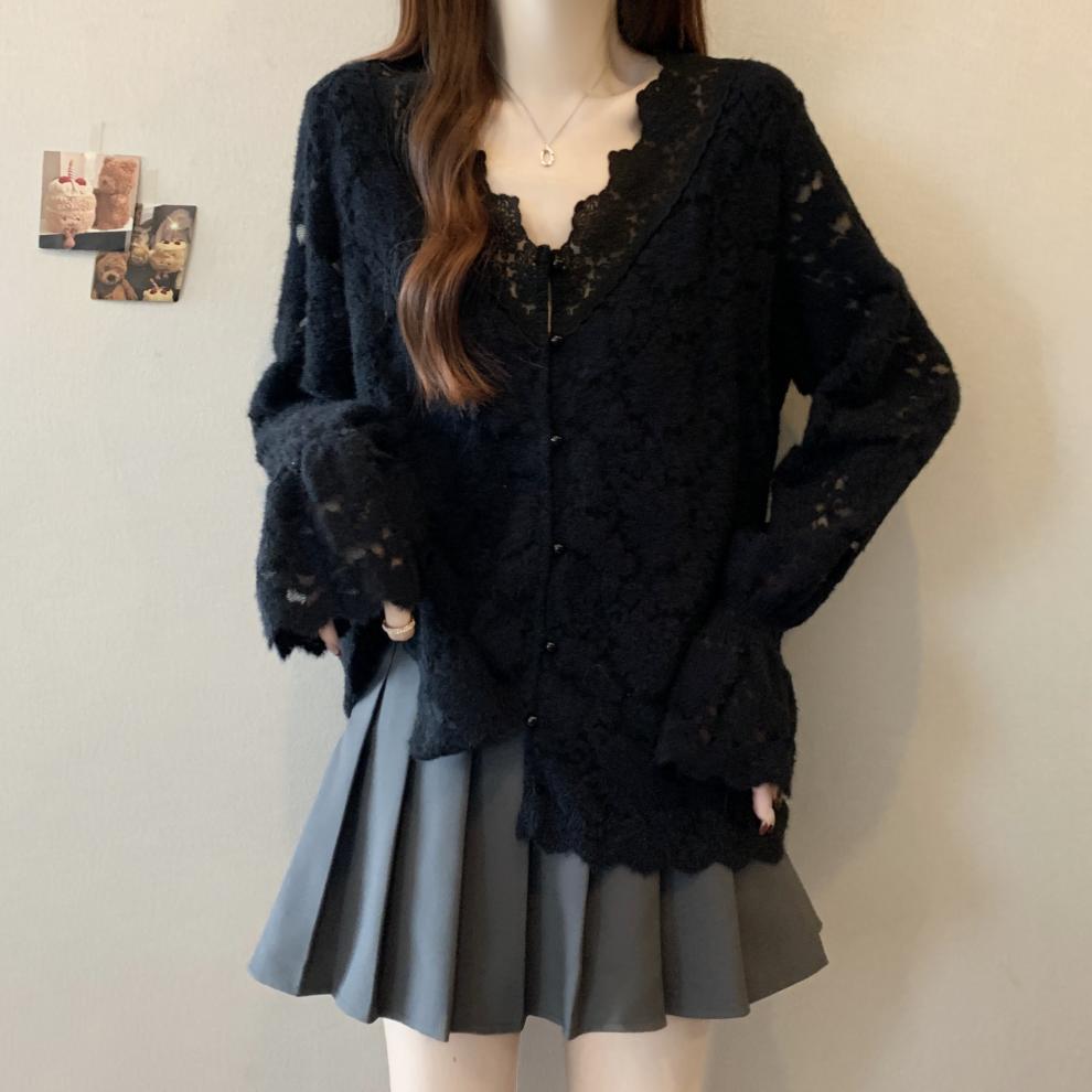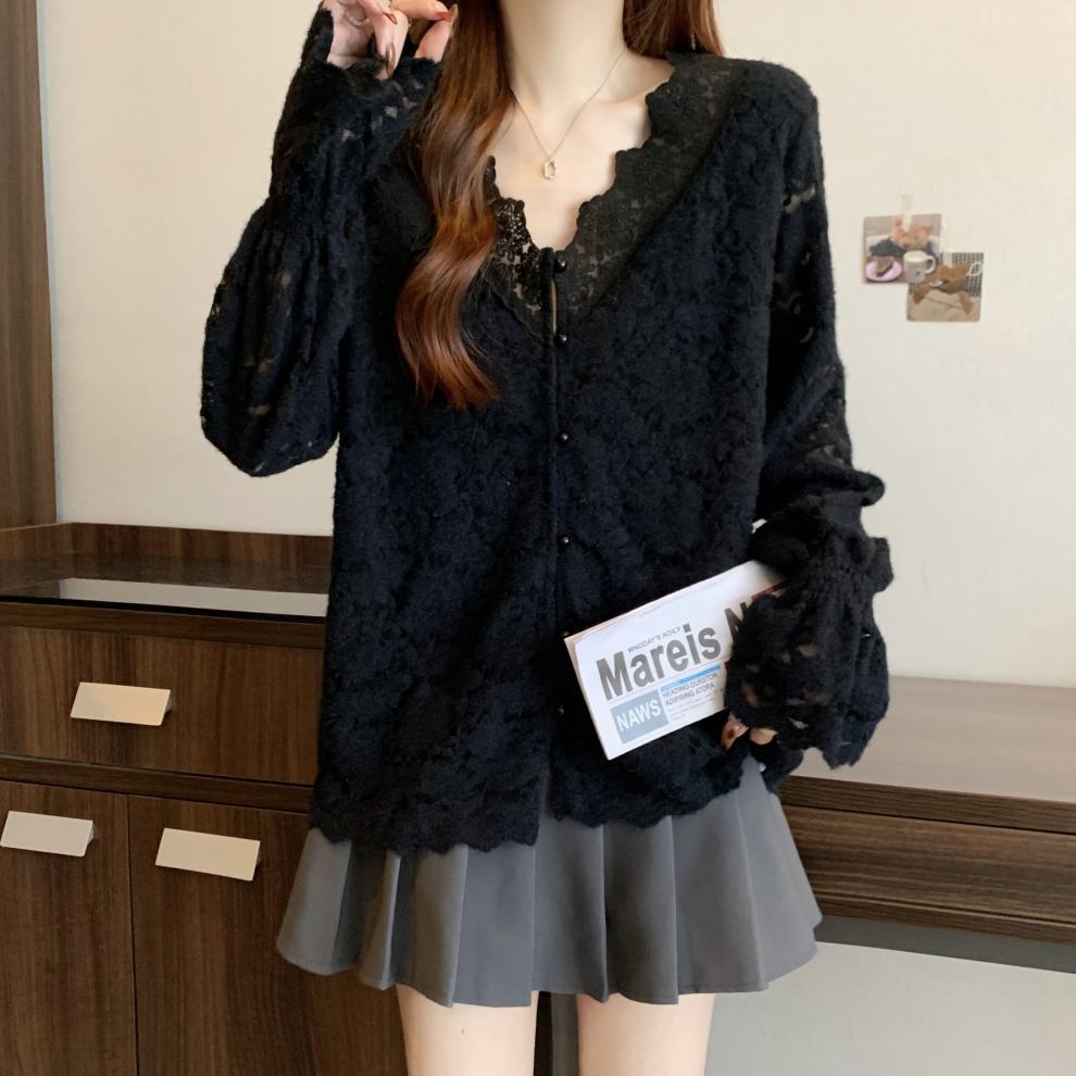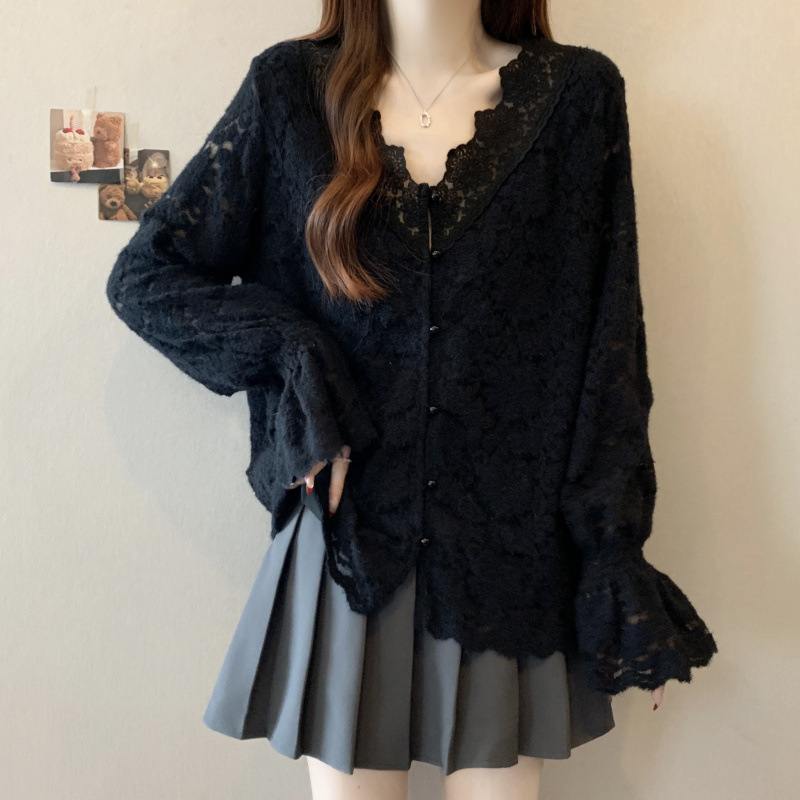 Женская одежда большого размера 2025 весна новая нишевые мода кружево V-образный вырез свободная блузка с длинными рукавами