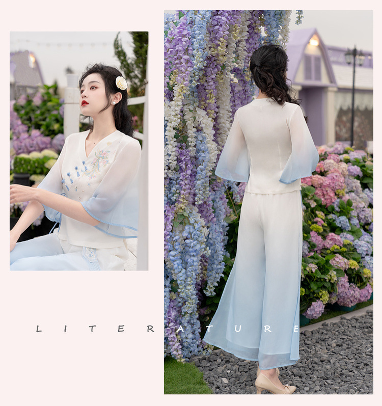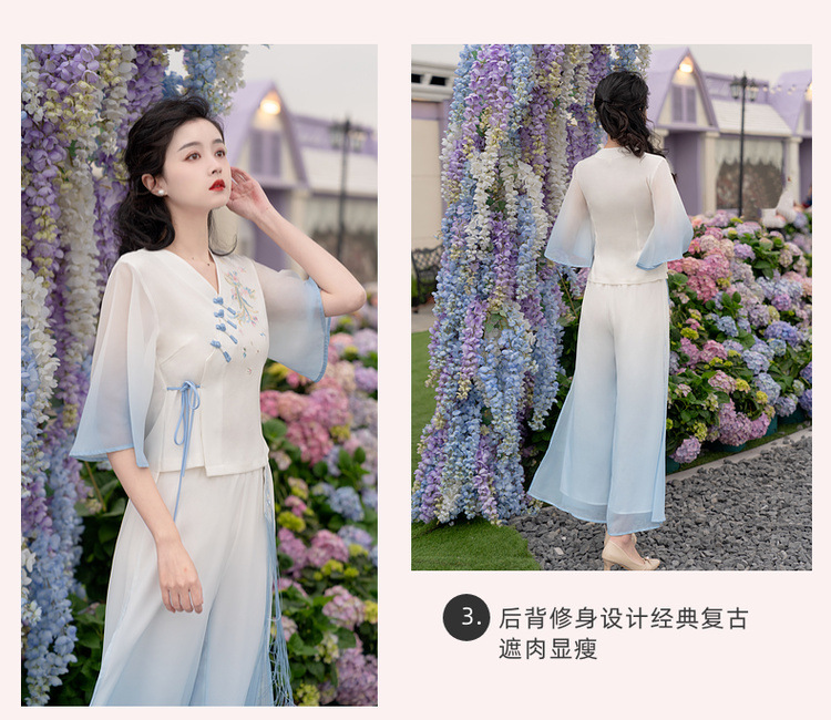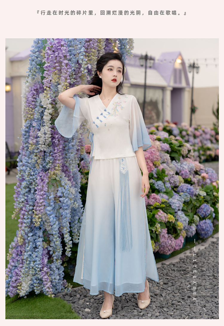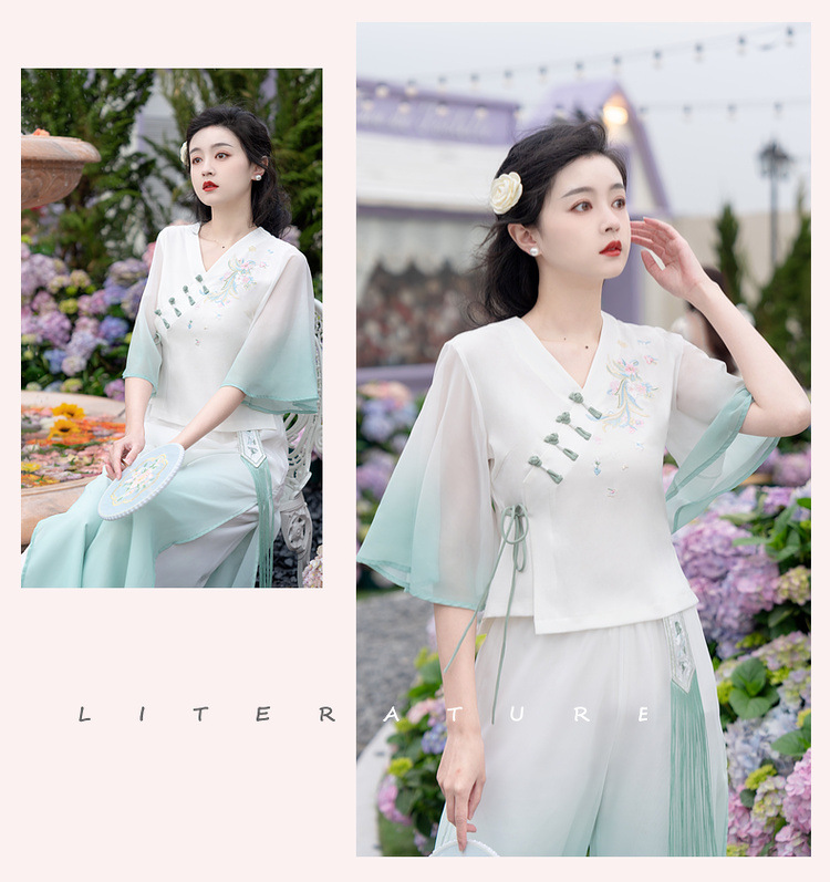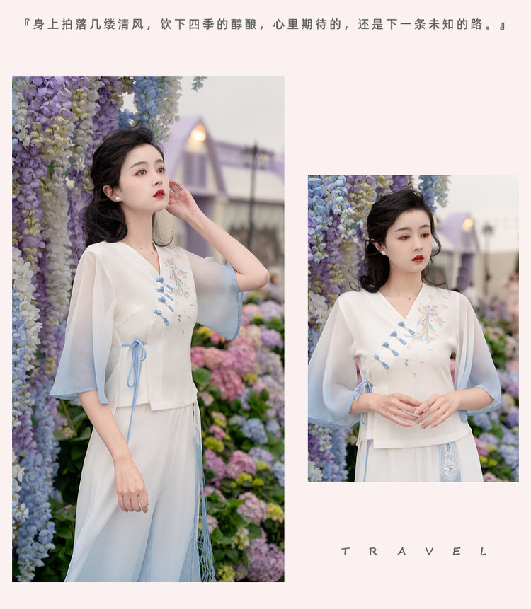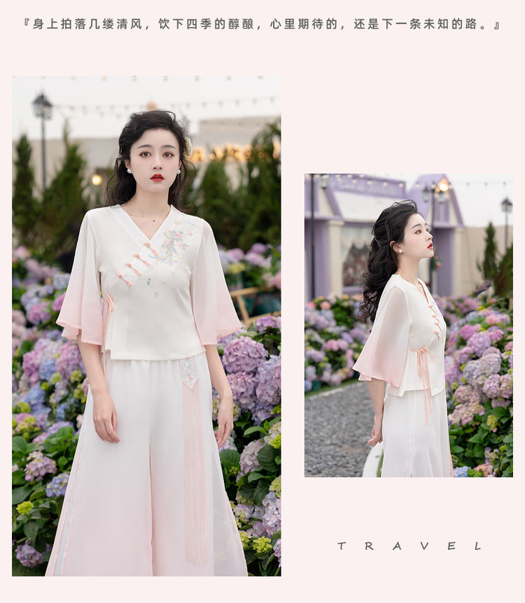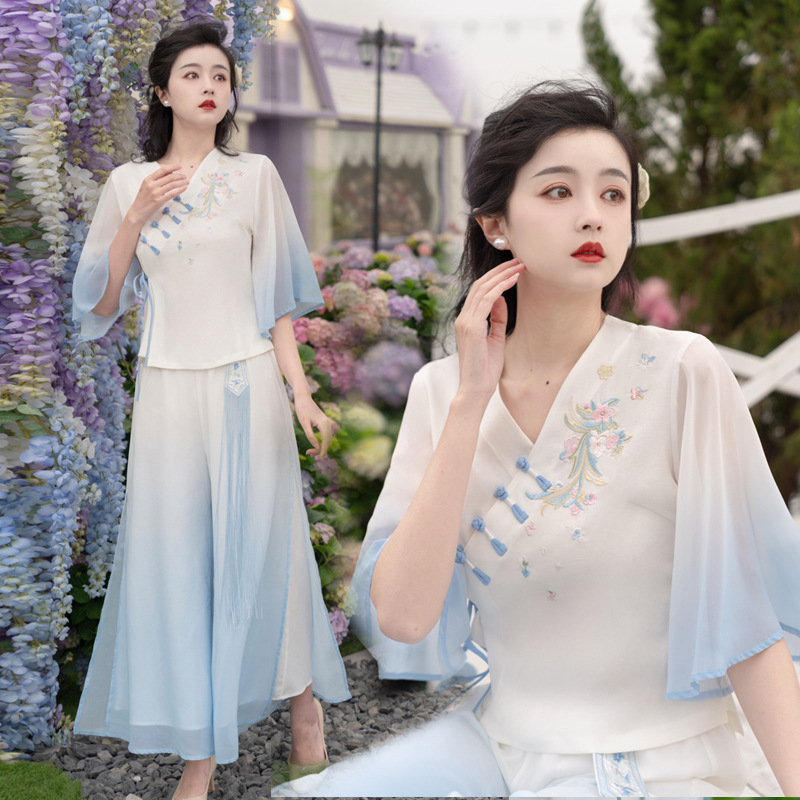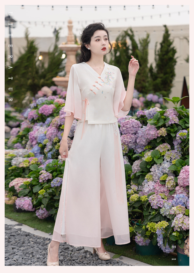 2025 лето новый литературный V-образный вырез пряжка с вышивкой из семи рукавов топ с вышивкой кисточкой с ремешком шифоновые широкие брюки