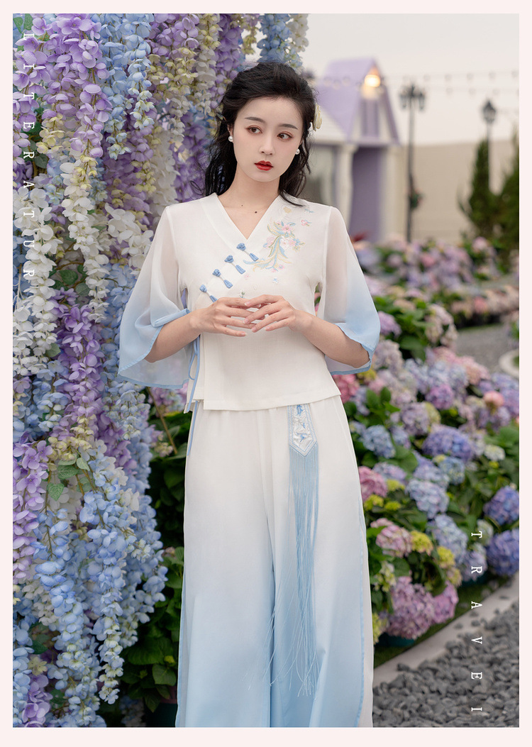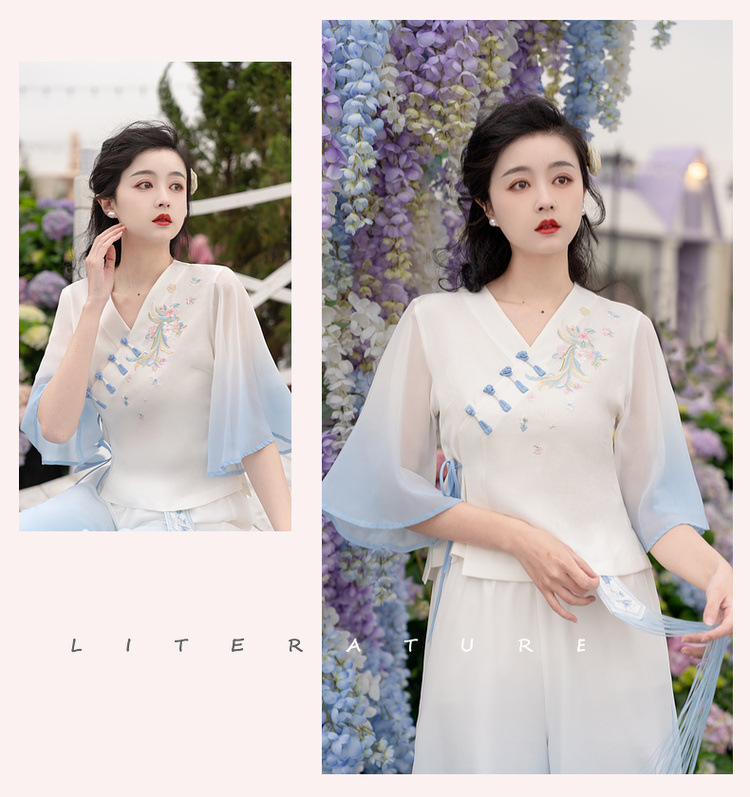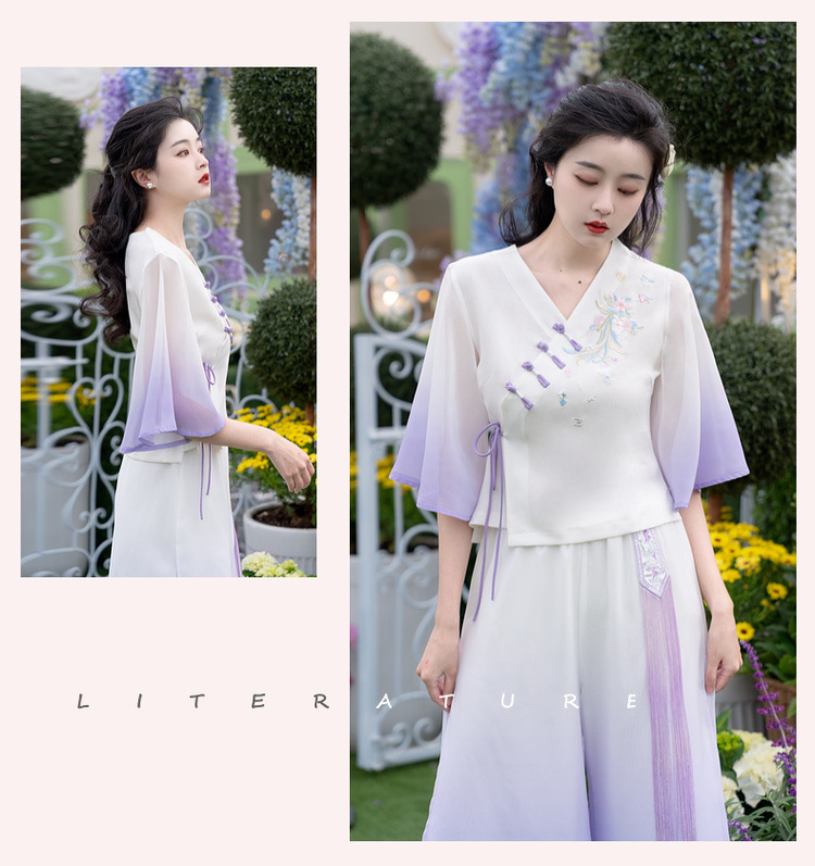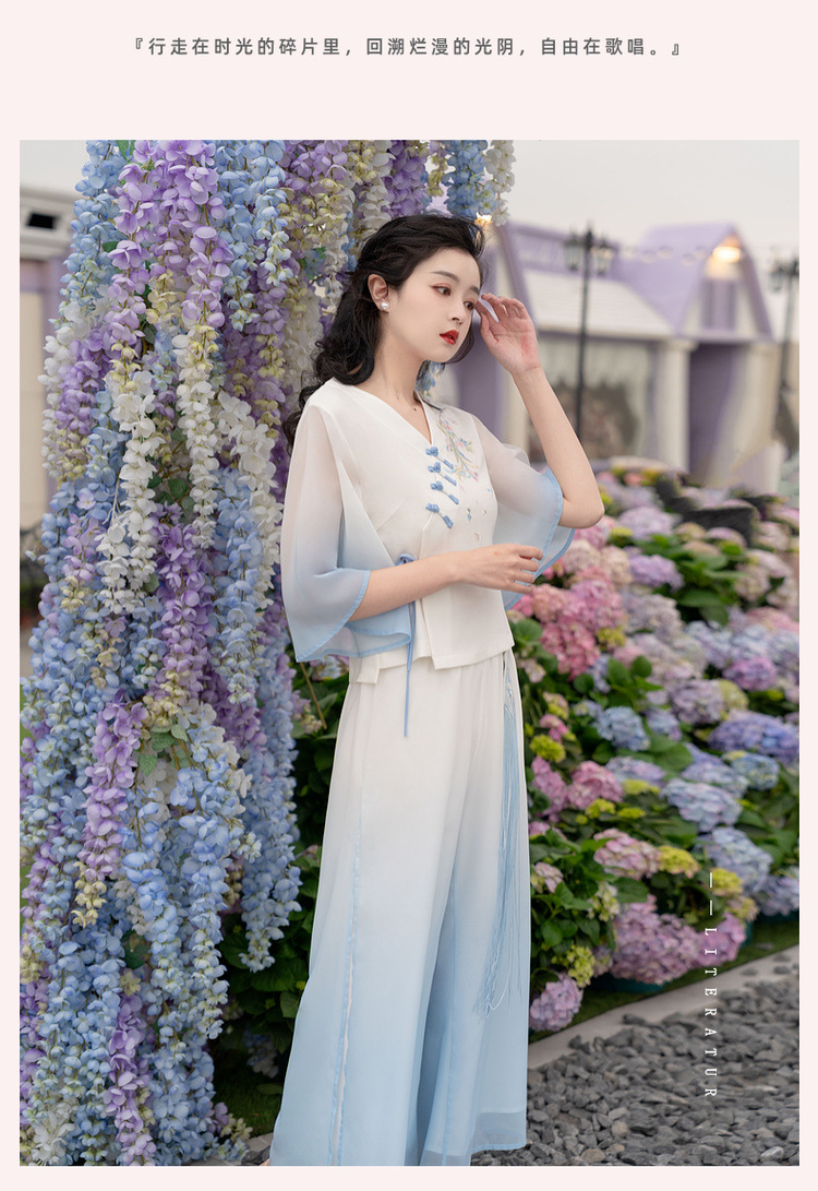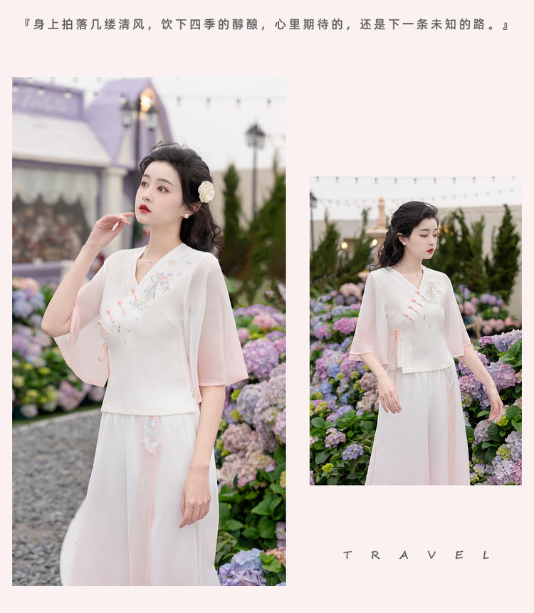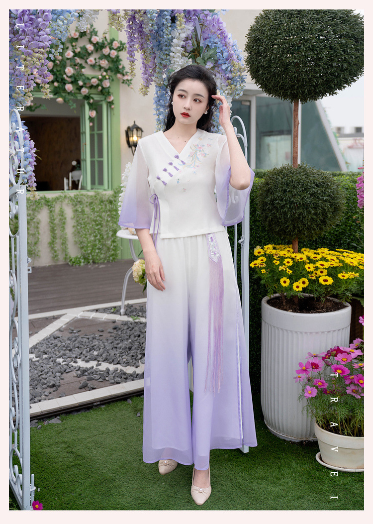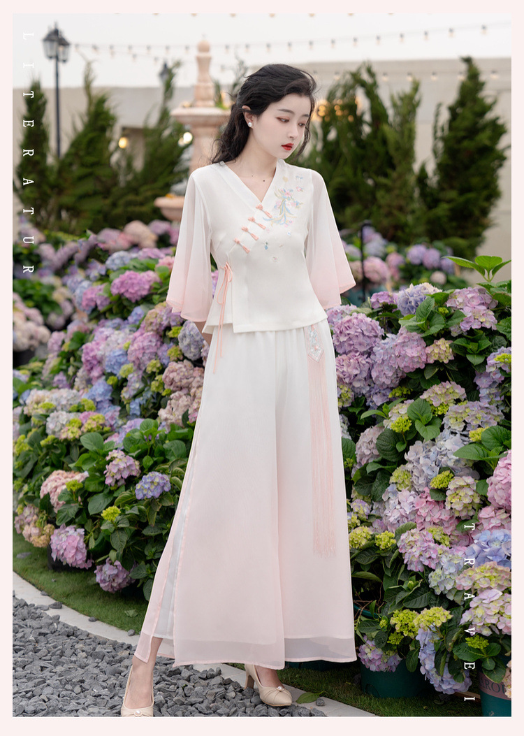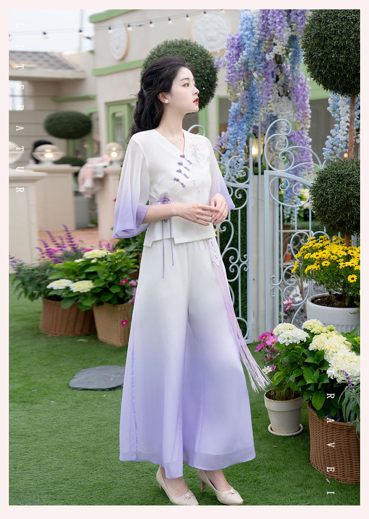 2025 лето новый литературный V-образный вырез пряжка с вышивкой из семи рукавов топ с вышивкой кисточкой с ремешком шифоновые широкие брюки