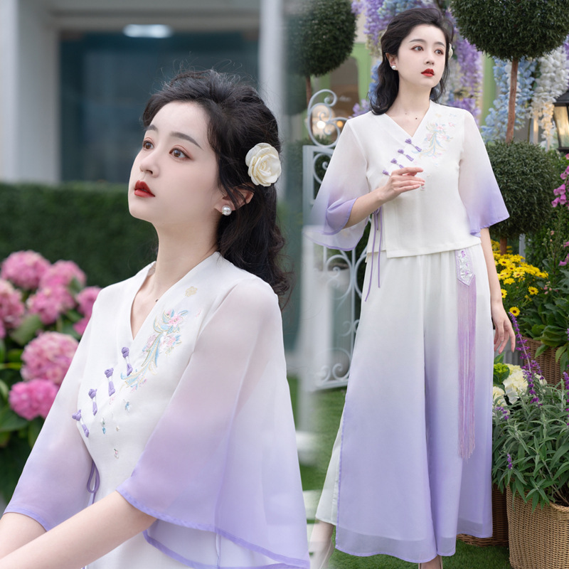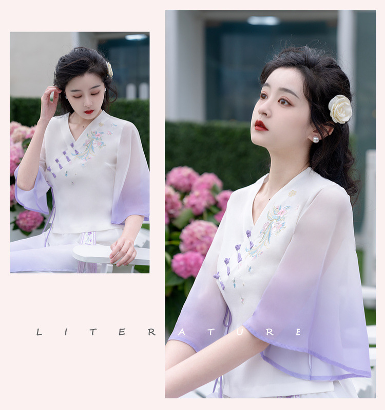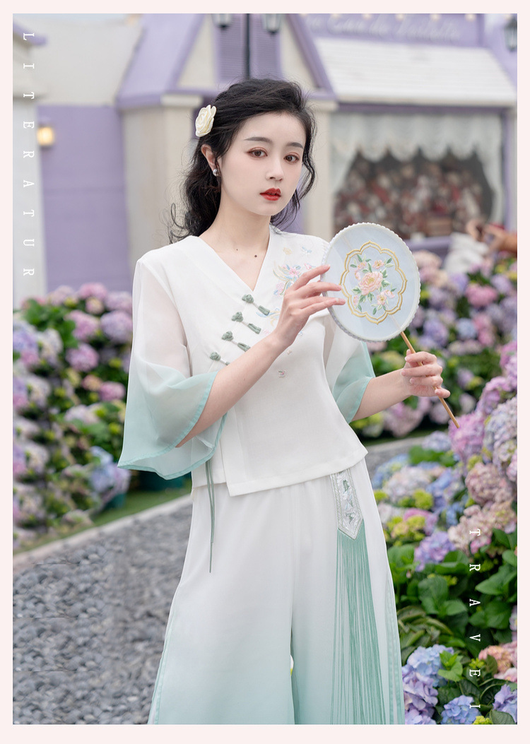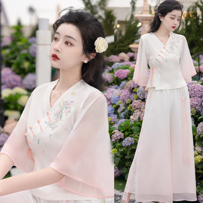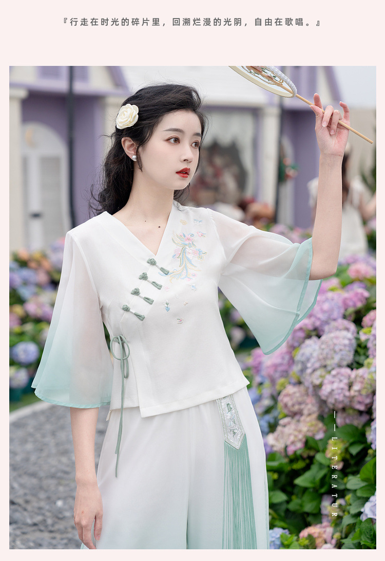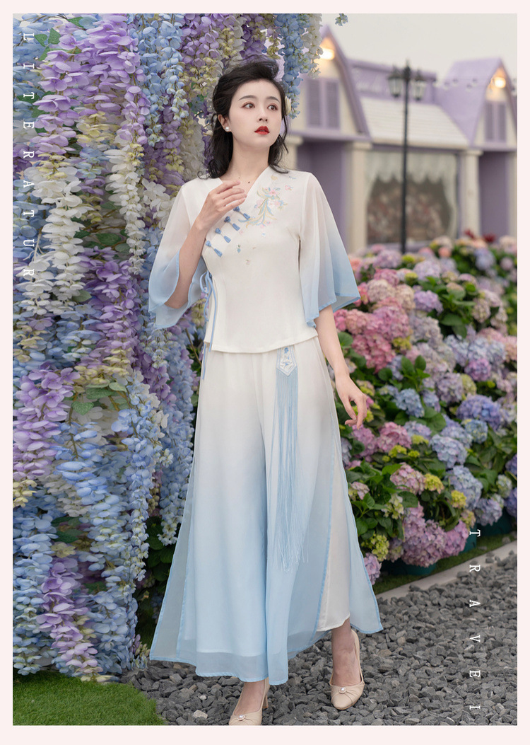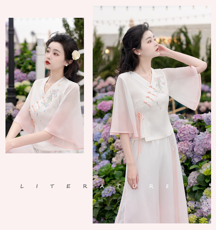 2025 лето новый литературный V-образный вырез пряжка с вышивкой из семи рукавов топ с вышивкой кисточкой с ремешком шифоновые широкие брюки