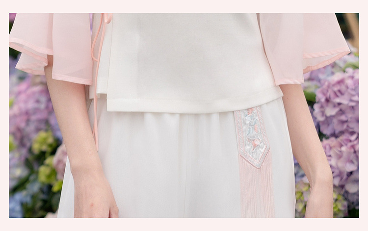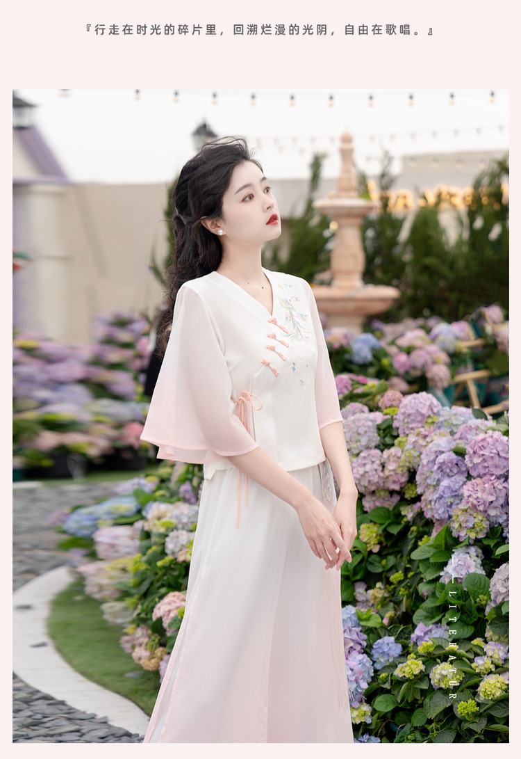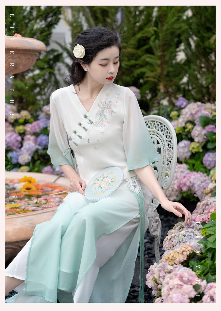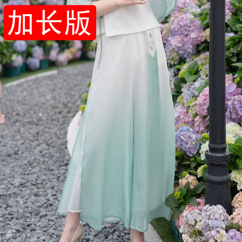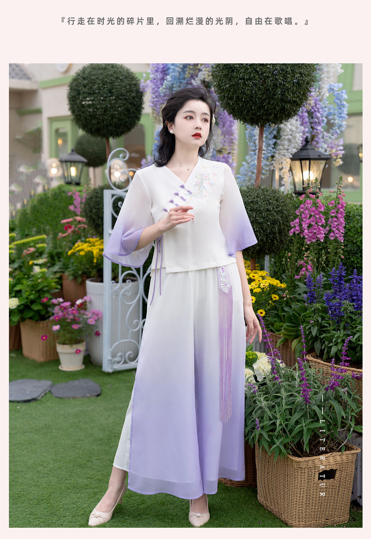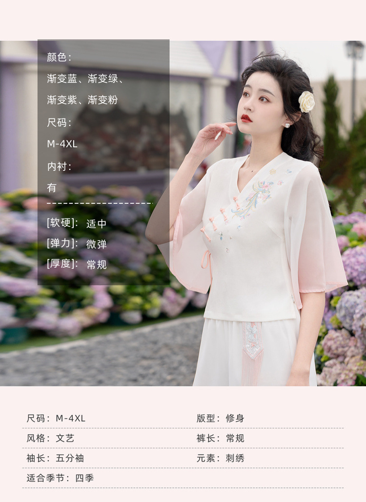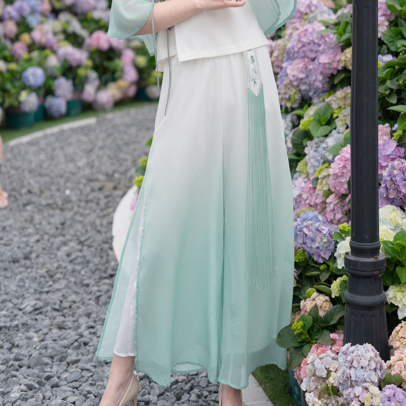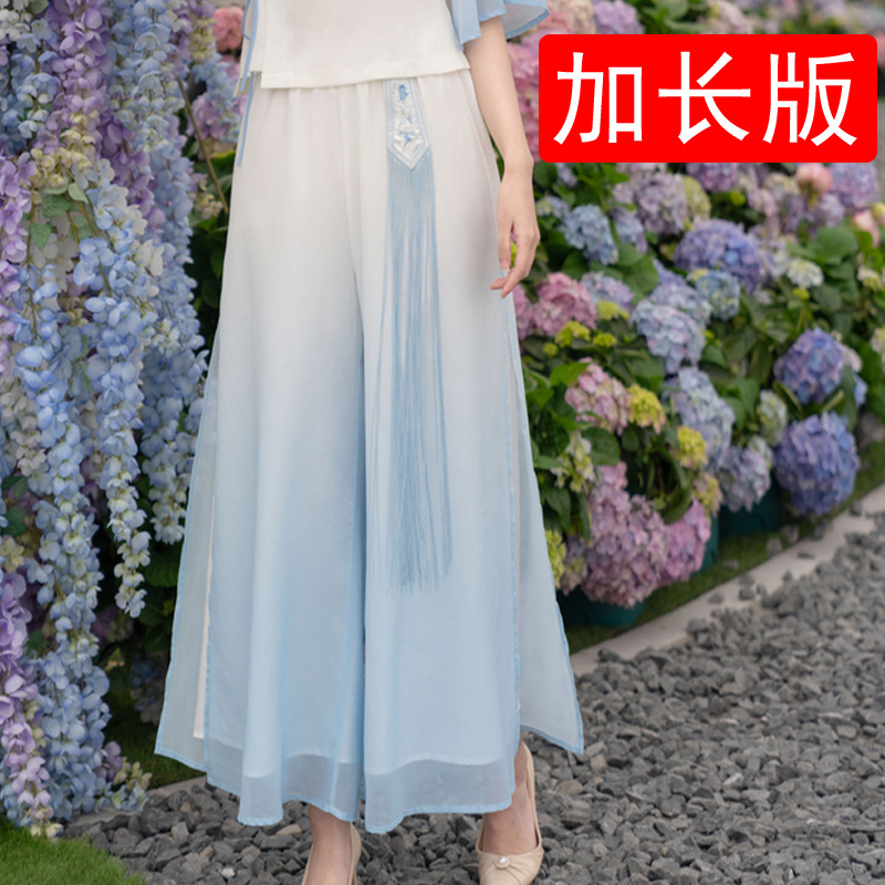 2025 лето новый литературный V-образный вырез пряжка с вышивкой из семи рукавов топ с вышивкой кисточкой с ремешком шифоновые широкие брюки