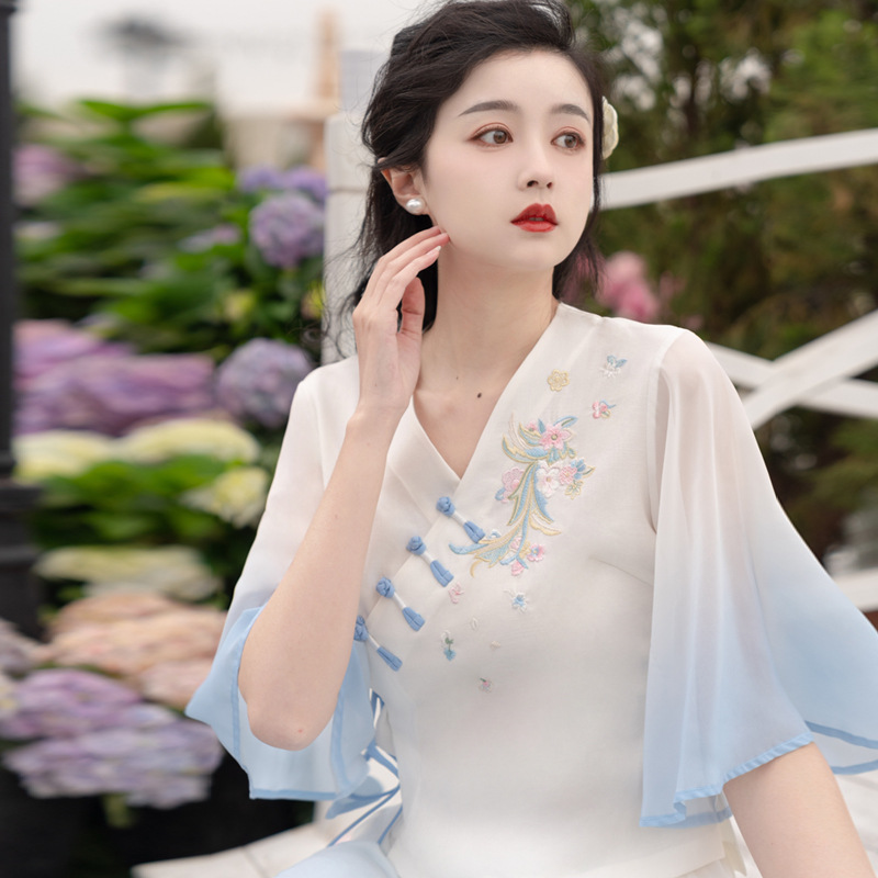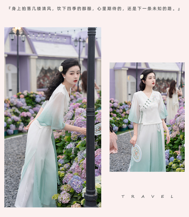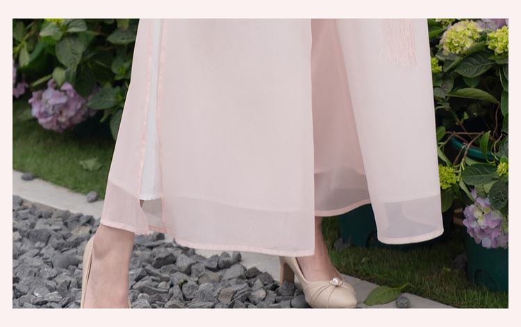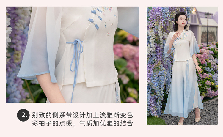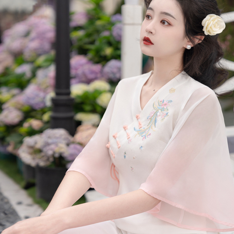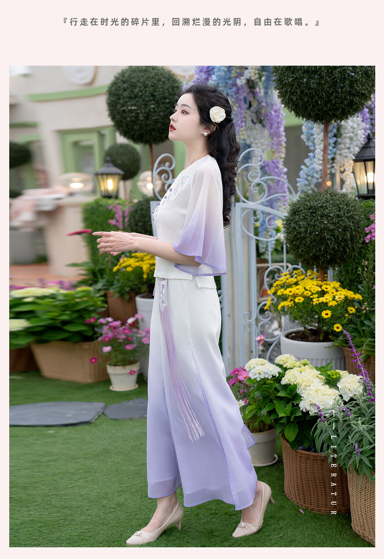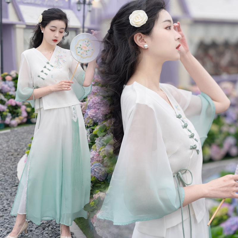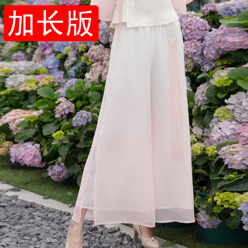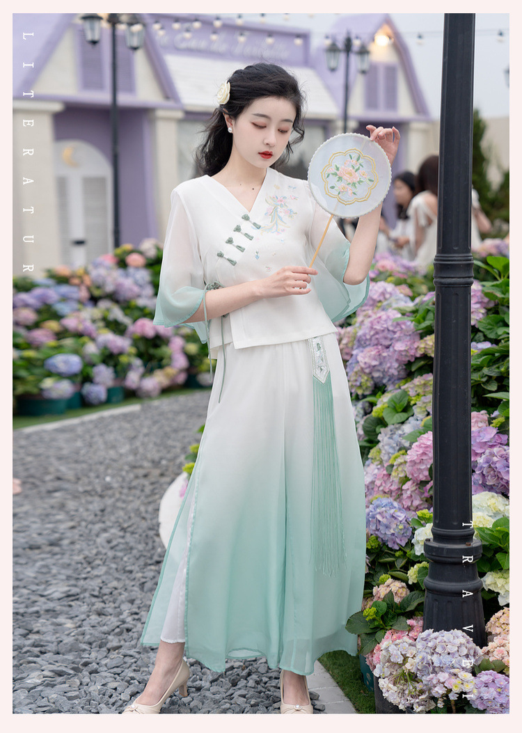 2025 лето новый литературный V-образный вырез пряжка с вышивкой из семи рукавов топ с вышивкой кисточкой с ремешком шифоновые широкие брюки
