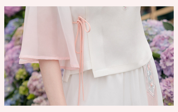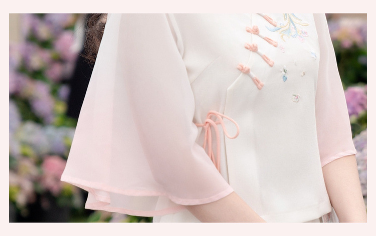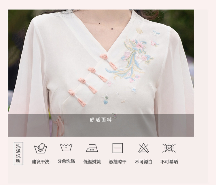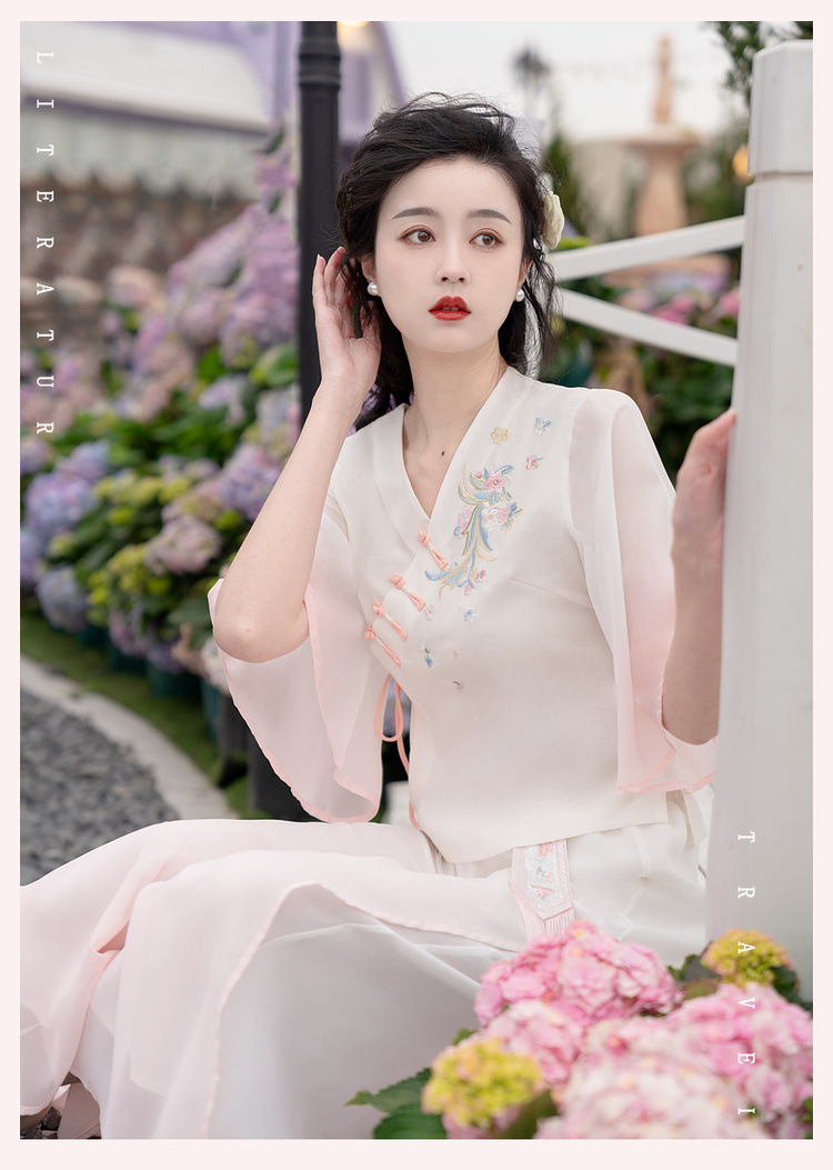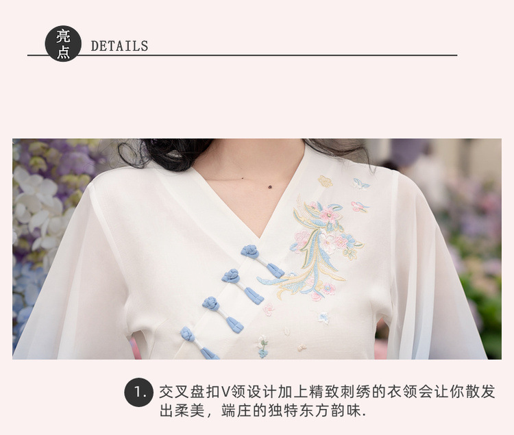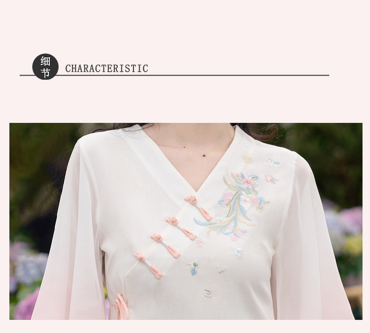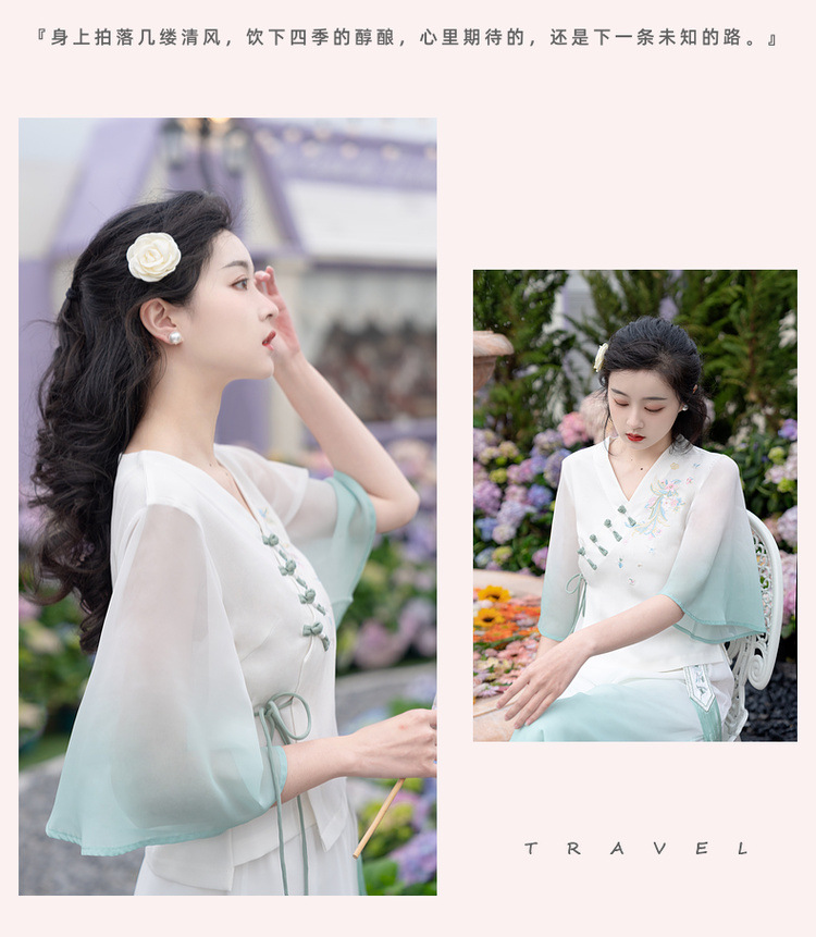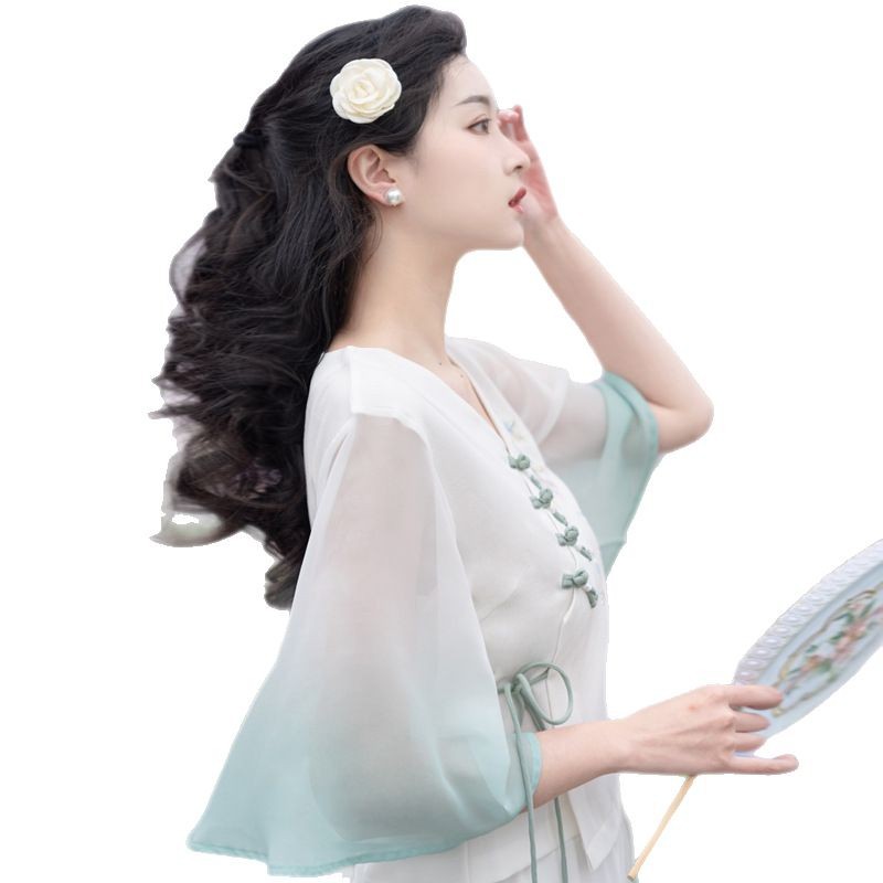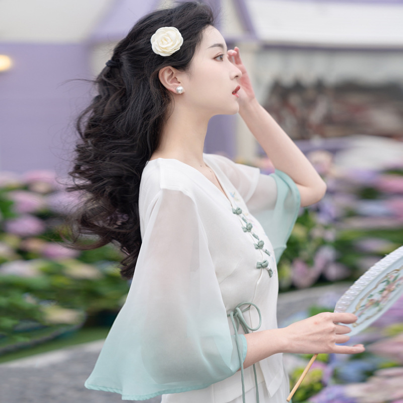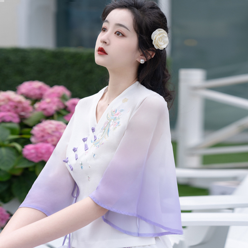 2025 лето новый литературный V-образный вырез пряжка с вышивкой из семи рукавов топ с вышивкой кисточкой с ремешком шифоновые широкие брюки