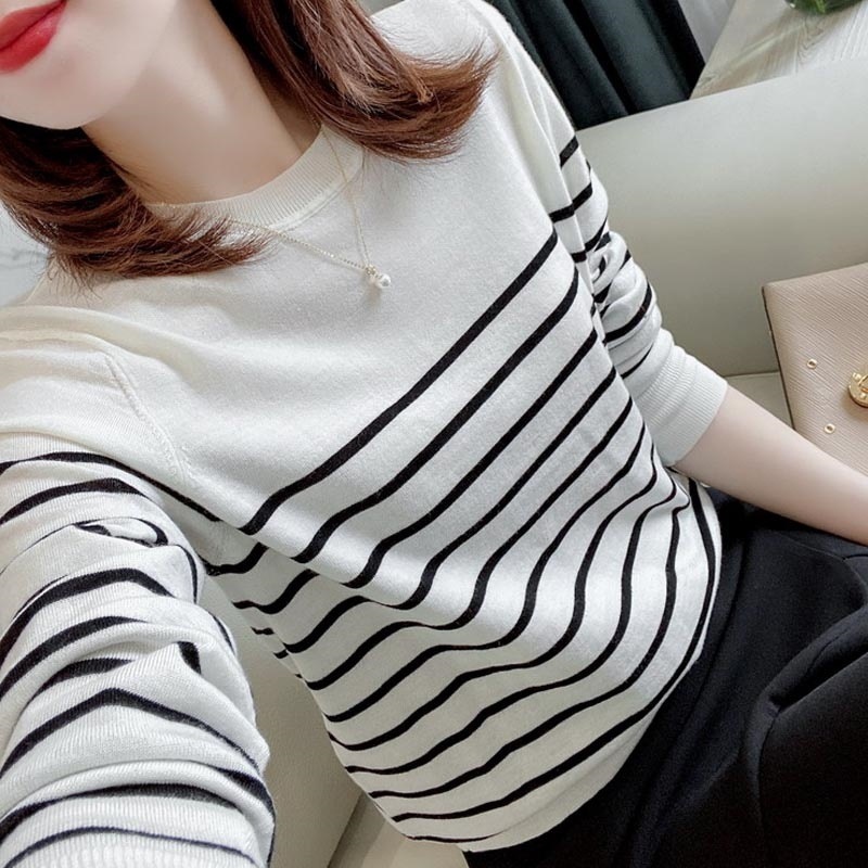 Женский трикотаж в черно-белую полоску в корейском стиле, новая женская рубашка 2025 года, пуловер с длинными рукавами, осенне-зимний трикотажный топ