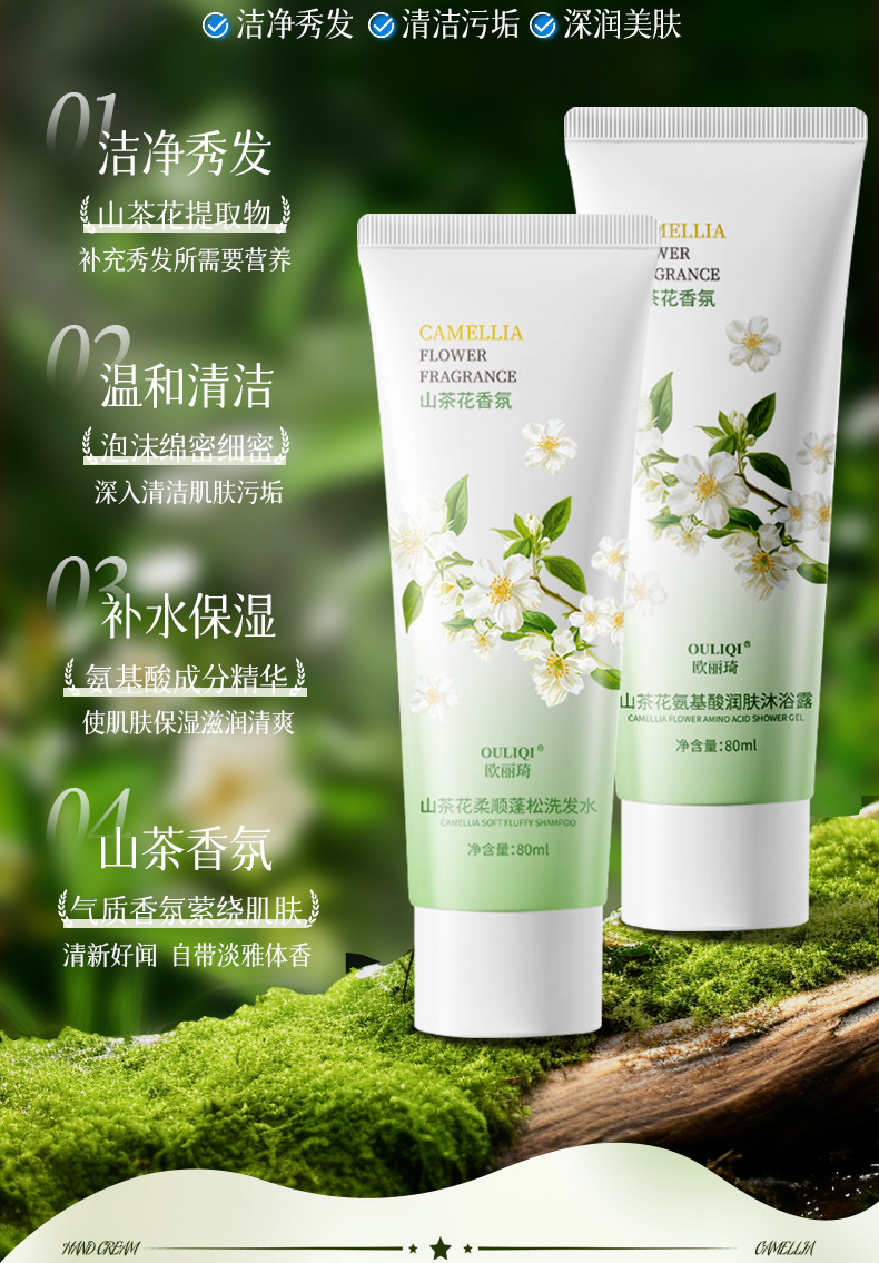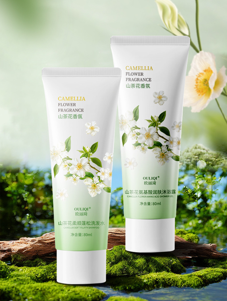 Гель для душа Ouliqi Camellia 500мл (Зеленый); Шампунь Ou Liqi Camellia 500мл (зеленый); Гель для душа Ouliqi Camellia 80мл; Шампунь Ouliqi Камелия 80мл
