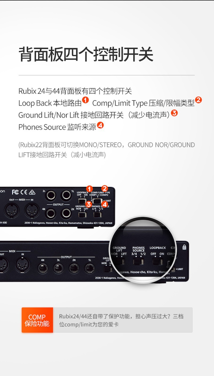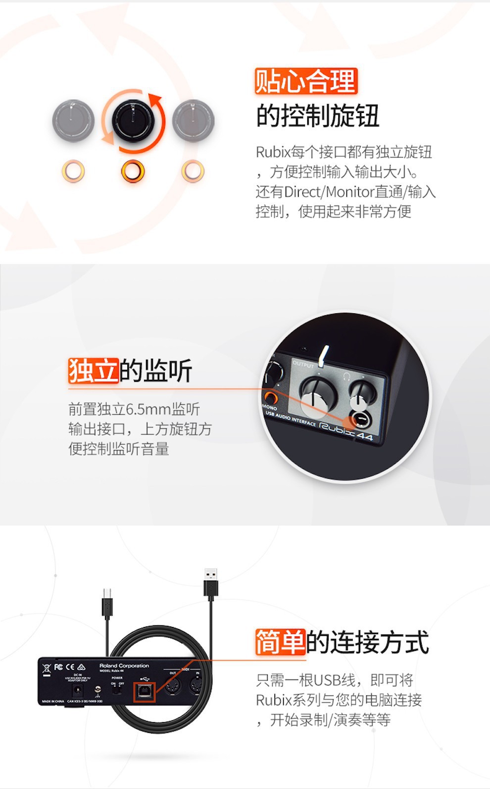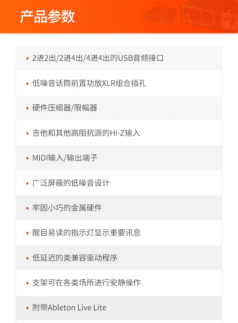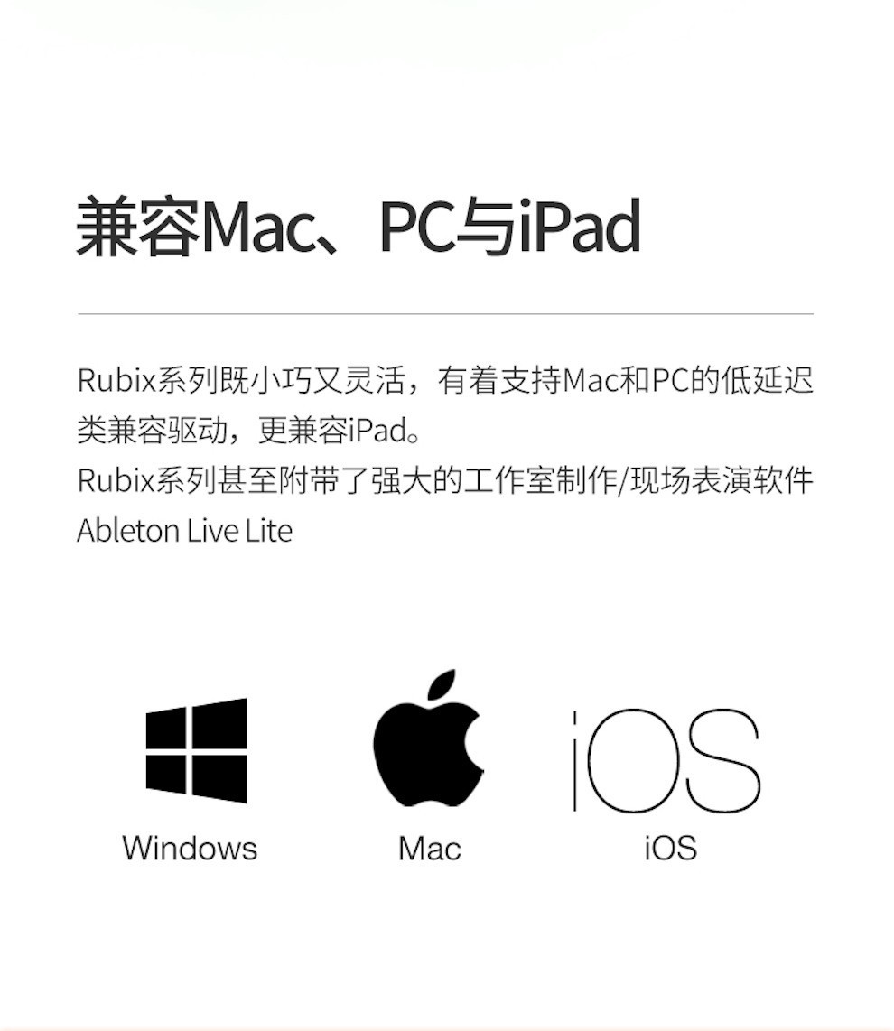 包裹清单 包裹清单 • Rubix22 USB声卡 1只 • USB连接线 1条 • 说明书 1份 • 2进2出 USB 音频接口 • 2低噪音麦克风前置功放XLR组合插孔 • 吉他和其他高阻抗源Hi-z 输入 • MIDI 输入输出端口 • 广泛屏蔽,低噪音设计 • 坚固紧凑的金属结构 • 醒目易读的指示灯显示重要讯息 • 低延迟类兼容驱动程序 • 附带 Ableton Live Lite