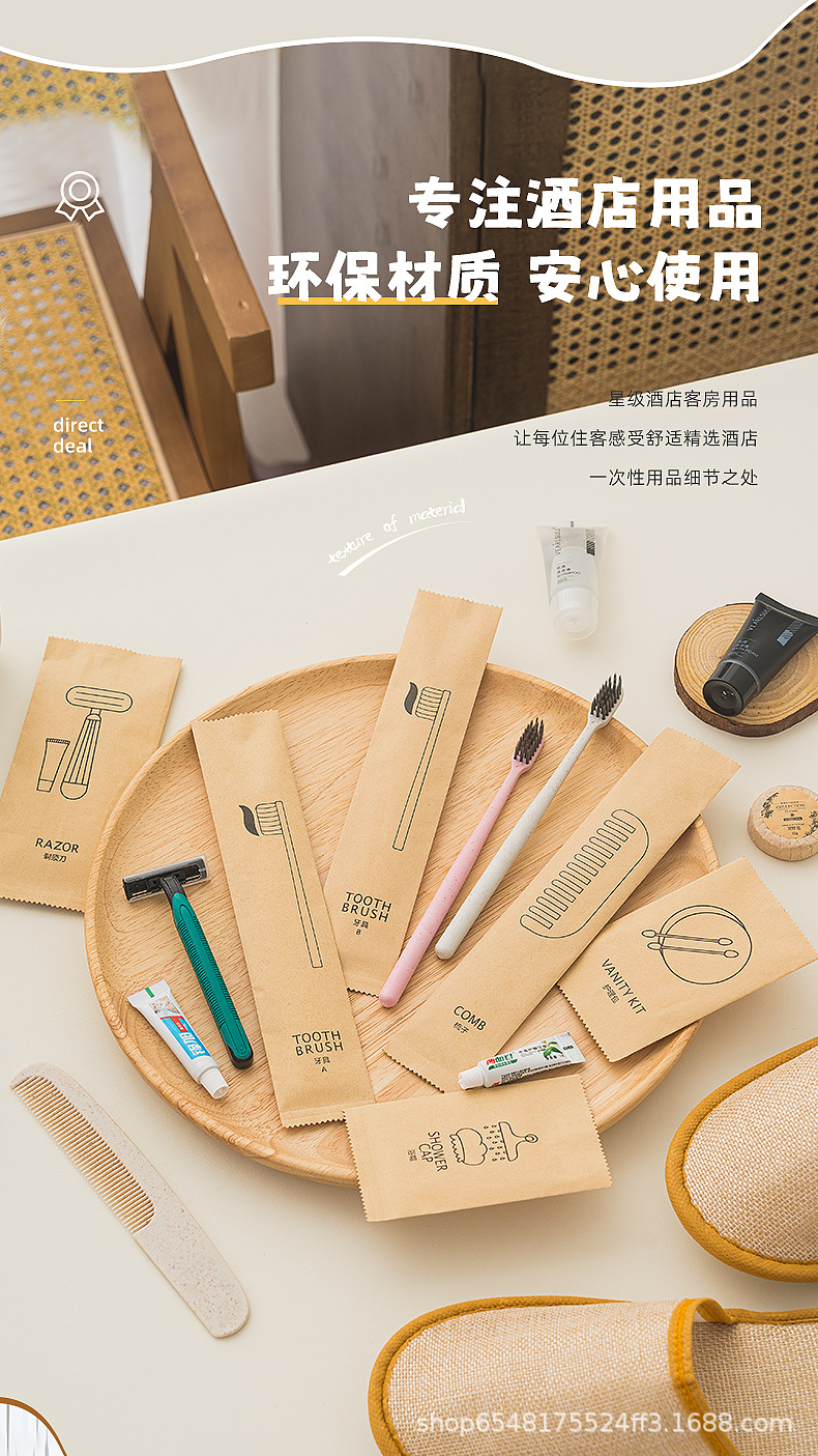 Полный набор одноразовых туалетных принадлежностей для отелей и гостиниц, включающий зубные щетки, зубную пасту, расчески и дорожные тапочки, доступный для оптовой покупки.