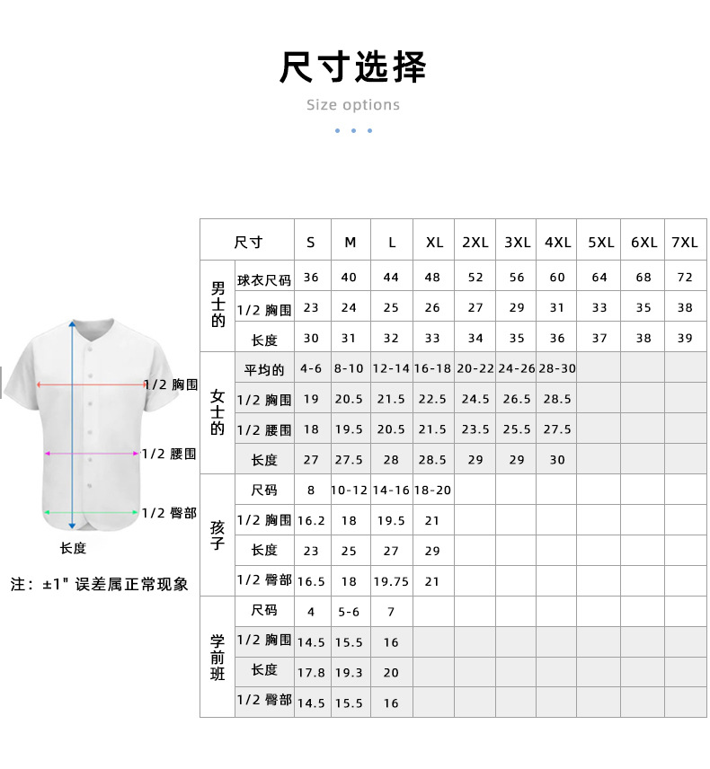 S、M、L、XL、2XL、3XL、4XL、5XL、6XL、7XL