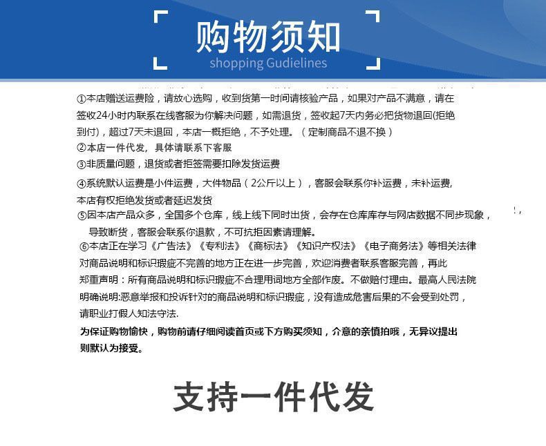 送随机小礼品一份开票另加税点,详情咨询客服! 开票另加税点,详情咨询客服! 1=本店支持一件代发,一件也可!!!偏远地区运费太高的买家,请咨询客服询问是否包邮!!! 2=页面 库存可能无法与仓库实时同步,批发数量较多的亲们,请联系客服确认库存,无货会及时通知。 3=如果您选择的是【定制产品】,定制一经销售,不退不换哦,请谅解。 4=境外退件不在售后范围,拒绝受理境外退回的报关邮件。 5=需要礼盒/彩盒请自行联系客服了解,或选择礼盒装。否则一律普通包裹出货。 6=包邮说明:偏远地区与个别商品的批发单不在包邮范围(具体偏远地区运费与批发单运费以商谈结果为准)