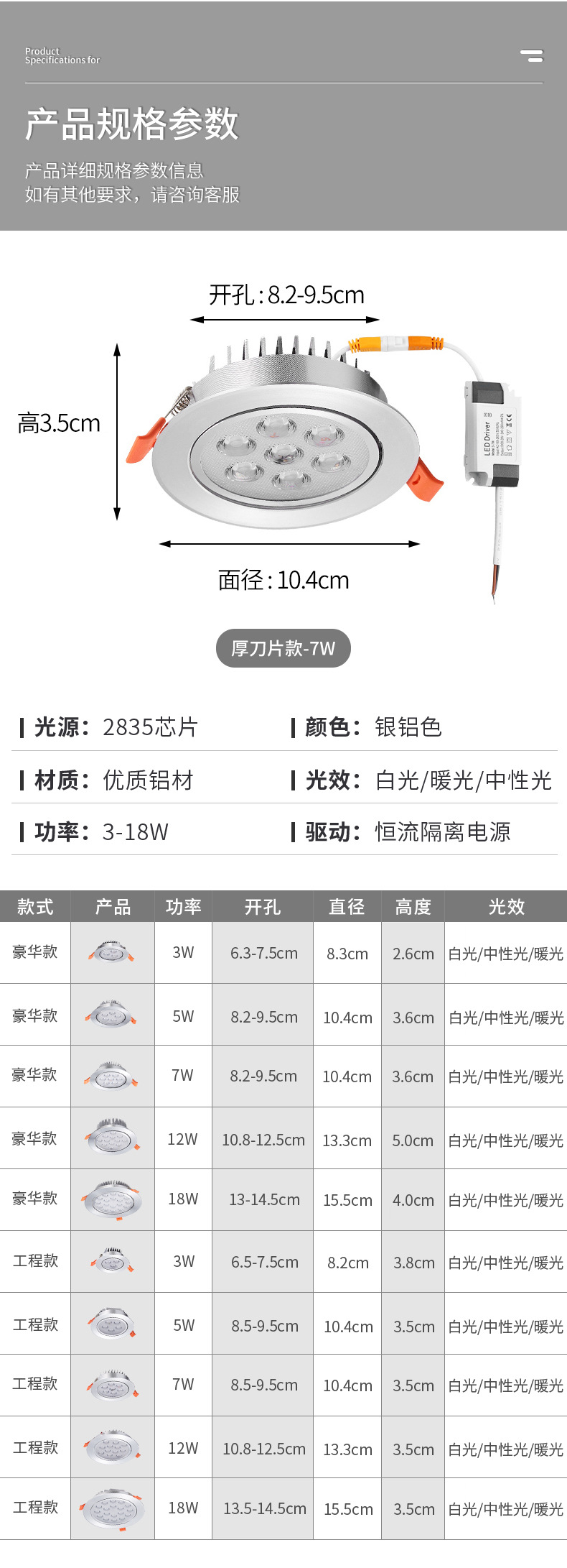 [1 год без привода] Диаметр поверхности 3 Вт 8,2 см, отверстие 6,3-7,5 см; Маленькая роскошная модель мощностью 3 Вт с диаметром поверхности 6,5 см [отверстие 5,5,5 см]; Маленькая инженерная модель мощностью 3 Вт с диаметром поверхности 6,5 см [отверстие 5,5,5 см]; Роскошная модель 3 Вт с диаметром поверхности 8,3 см [отверстие 6,3-7,5 см]; Инженерная модель 3 Вт с диаметром поверхности 8,2 см [отверстие 6,5,5 см]; Роскошная модель мощностью 5 Вт с диаметром поверхности 10,4 см [отверстие 8,2-9,5 см]; Инженерная модель мощностью 5 Вт с диаметром поверхности 10,4 см [отверстие 8,2-9,5 см]; Роскошная модель мощностью 7 Вт с диаметром поверхности 10,4 см [отверстие 8,2-9,5 см]; Инженерная модель мощностью 7 Вт с диаметром поверхности 10,4 см [отверстие 8,2-9,5 см]; Роскошная модель мощностью 9 Вт с диаметром поверхности 13,3 см [отверстие 11-1,5 см]; Инженерная модель мощностью 9 Вт с диаметром поверхности 13,3 см [отверстие 11-1,5 см]; Роскошная модель мощностью 12 Вт с диаметром поверхности 13,3 см [отверстие 11-1,5 см]; Инженерная модель мощностью 12 Вт с диаметром поверхности 13,3 см [отверстие 11-1,5 см]; Роскошная модель 18 Вт с диаметром поверхности 15,5 см [отверстие 13-1,5 см]; Инженерная модель 18 Вт с диаметром поверхности 15,5 см [отверстие 13-1,5 см]; Вы можете связаться со службой поддержки клиентов для настройки или OEM.