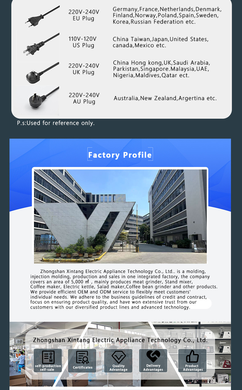 Мясорубка европейского стандарта 220 В.; Мясорубка австралийского стандарта 220 В.; Мягсорубка стандарта США 110 В.; Мясорубка британского стандарта 220 В