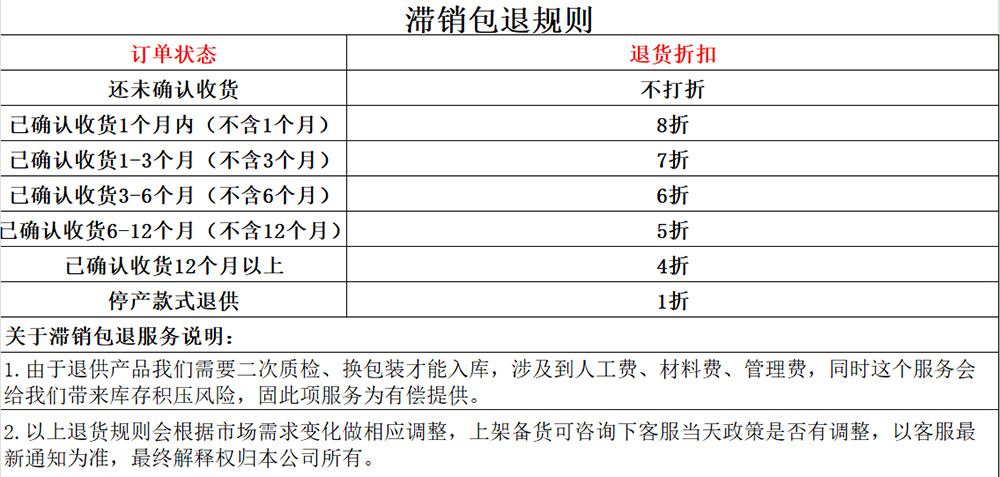 2.跟我们合作放心备货,滞销包退。(参考滞销包退规则)