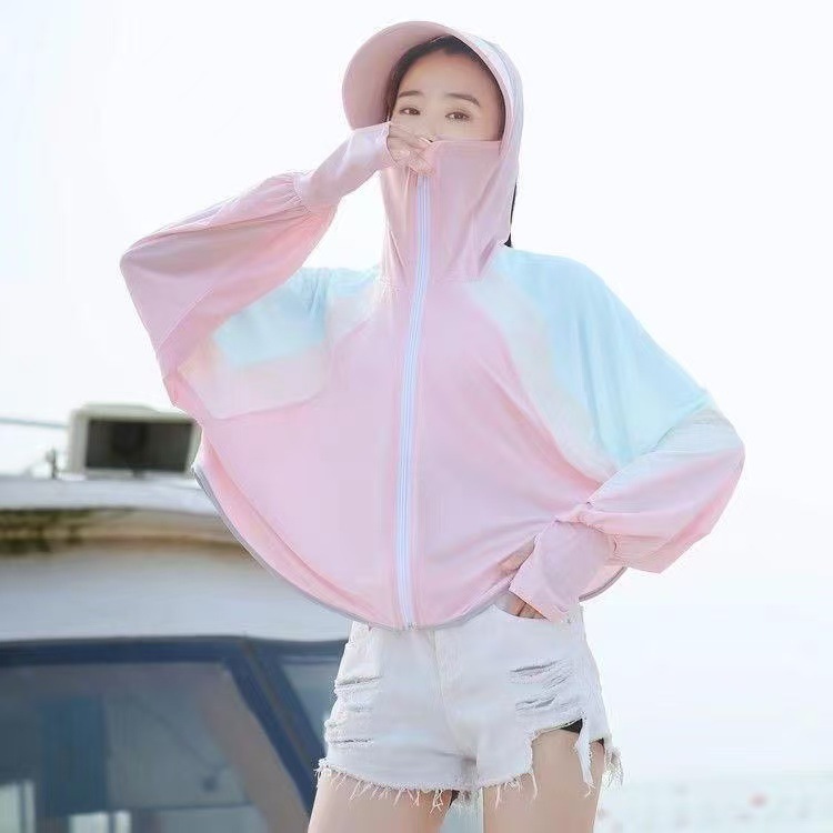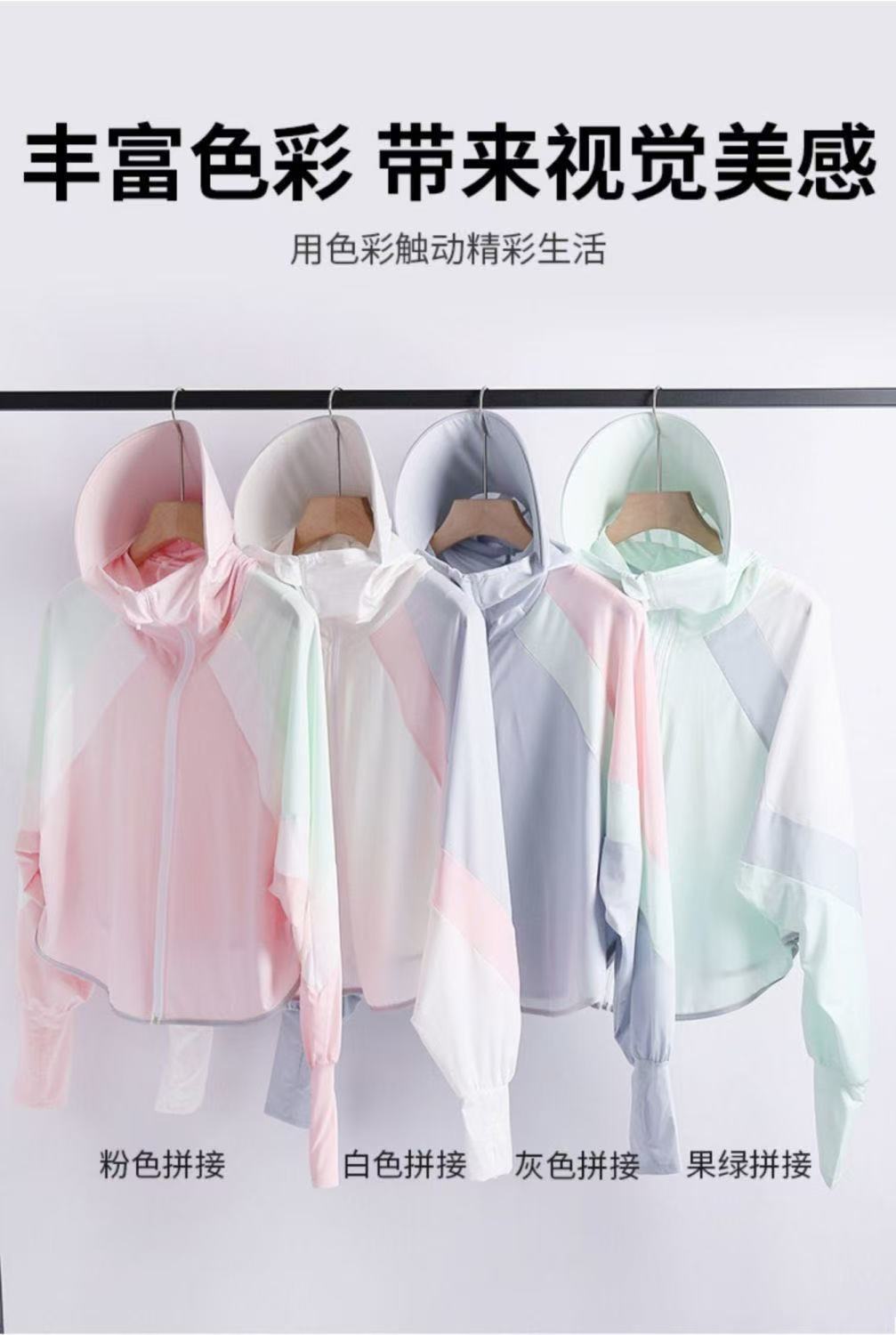 Новая одежда контрастного цвета для защиты от солнца – белая.; Новая солнцезащитная одежда контрастного цвета - серая.; Новая одежда контрастного цвета для защиты от солнца-розового цвета.; Новая солнцезащитная одежда контрастного цвета – светло-зеленая.
