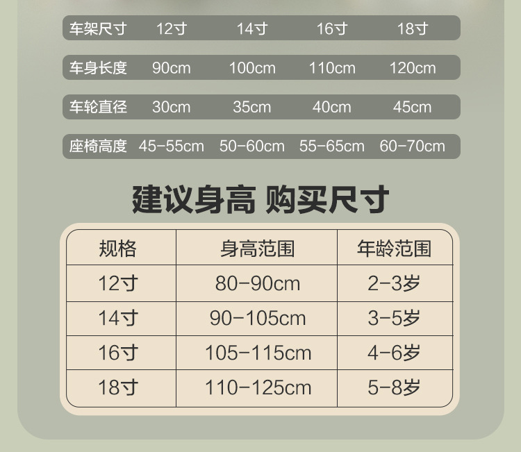 12inch [Рекомендуемая высота 80-95 см]; 14inch [Рекомендуемая высота 90-105 см]; 16inch [Рекомендуемая высота 100-115 см]; 18inch [Рекомендуемая высота 110-130 см]