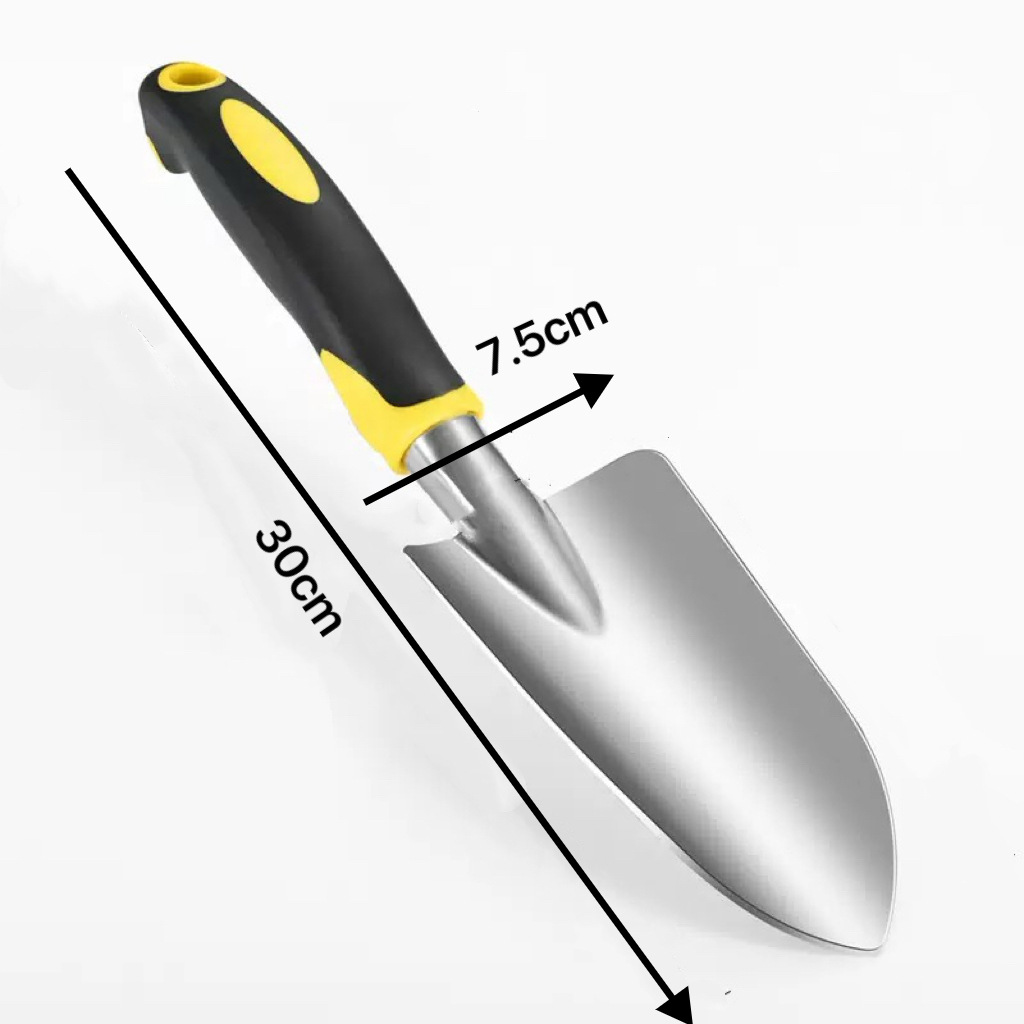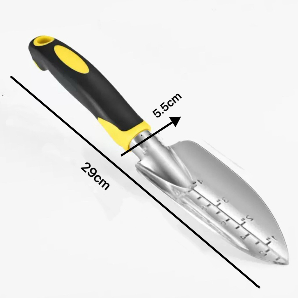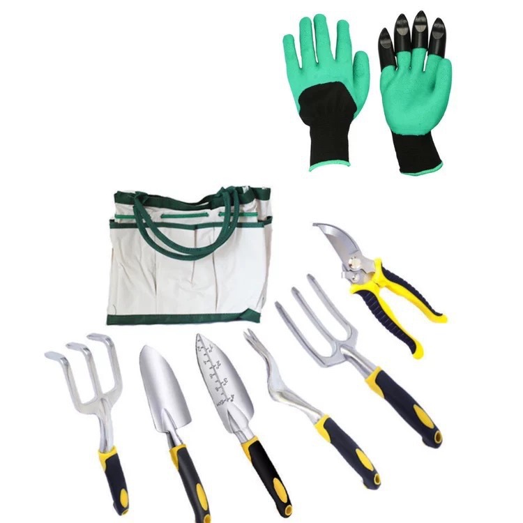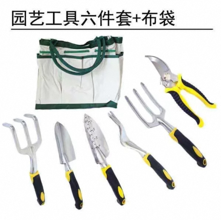 Широкая лопата с черной и желтой ручкой; Узкая лопата с черной и желтой ручкой; Черно-желтая ручка трехзубая; Грабли с черной и желтой ручкой; Подъемник корней с черной и желтой ручкой; Набор из шести предметов с черно-желтой ручкой + тканевая сумка; Белая оксфордская сумка; Секаторы с черно-желтой ручкой; Набор из шести предметов с черно-желтой ручкой + тканевый мешок + 1 пара садовых перчаток