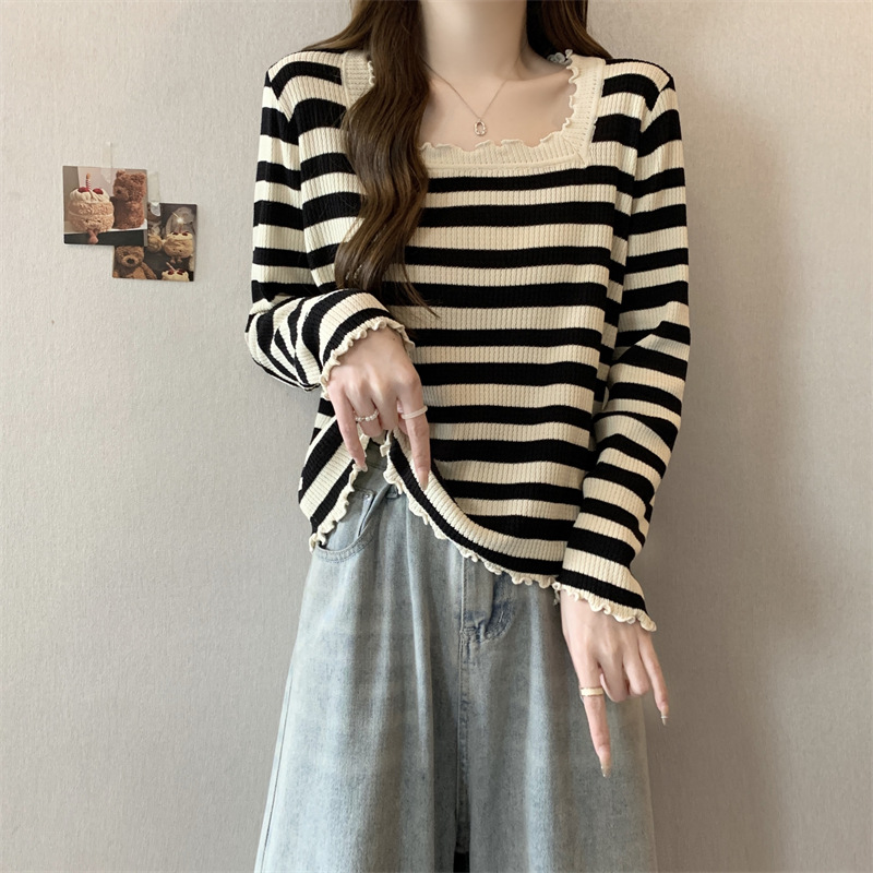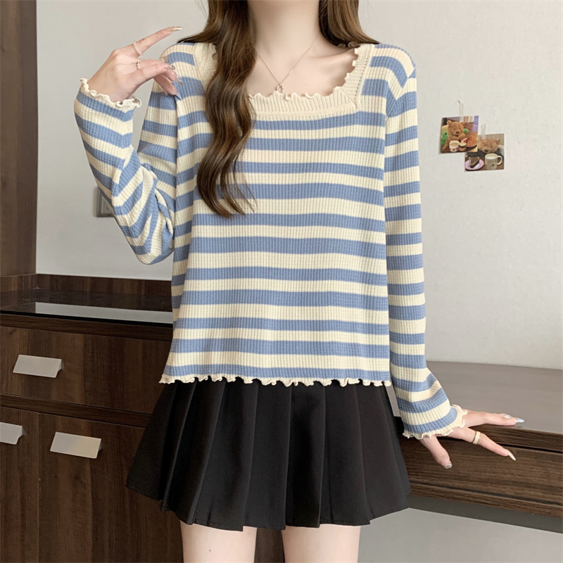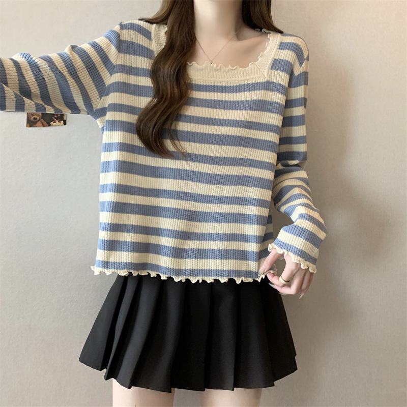 Женская одежда большого размера 2025 весна и осень новая толстая сестра с квадратным вырезом в полоску футболка с длинным рукавом, покрывающий живот, вязаный топ