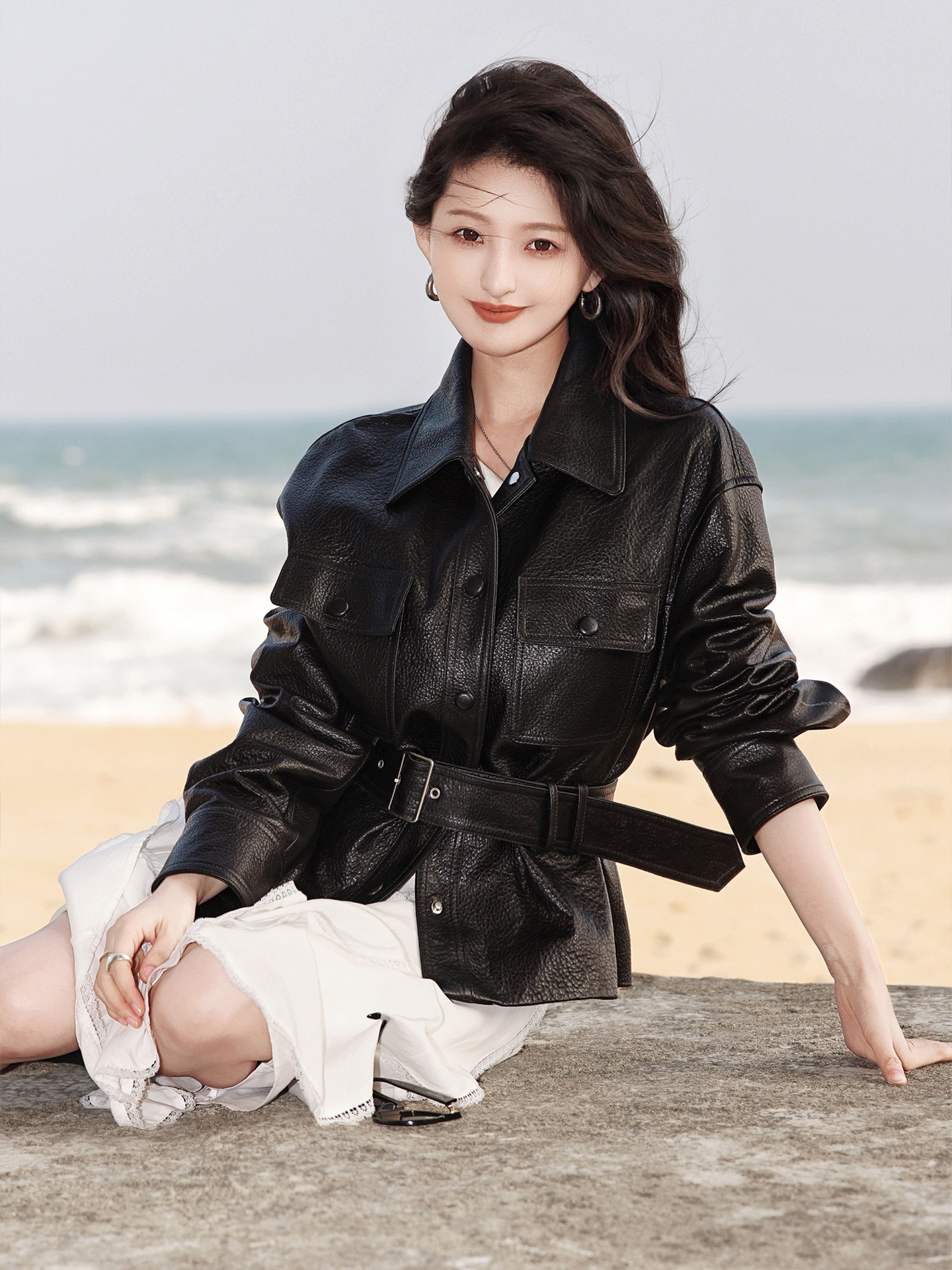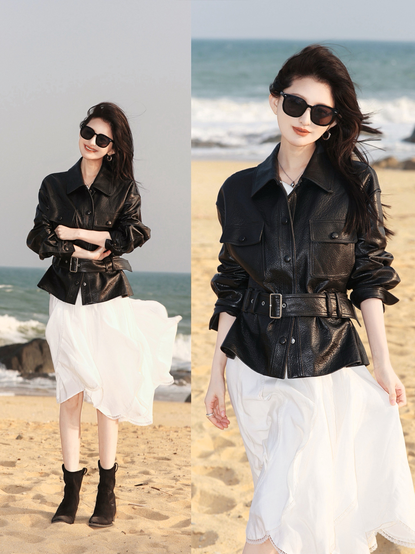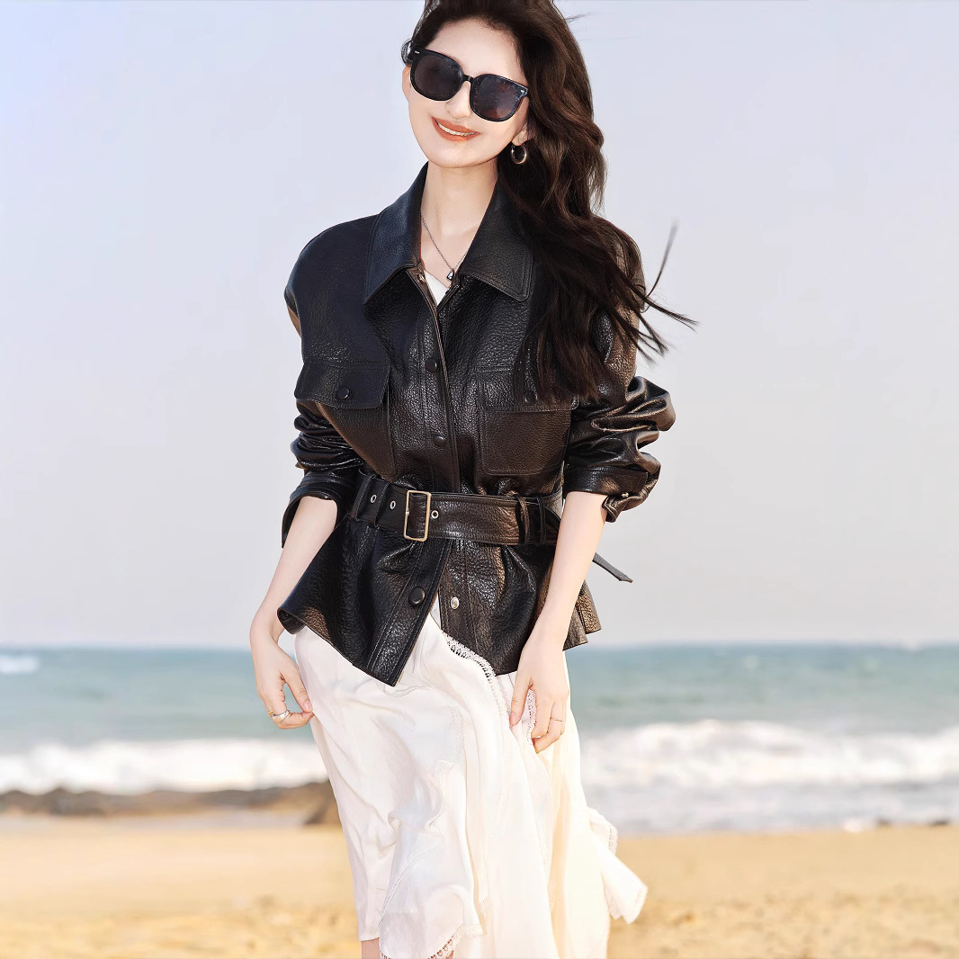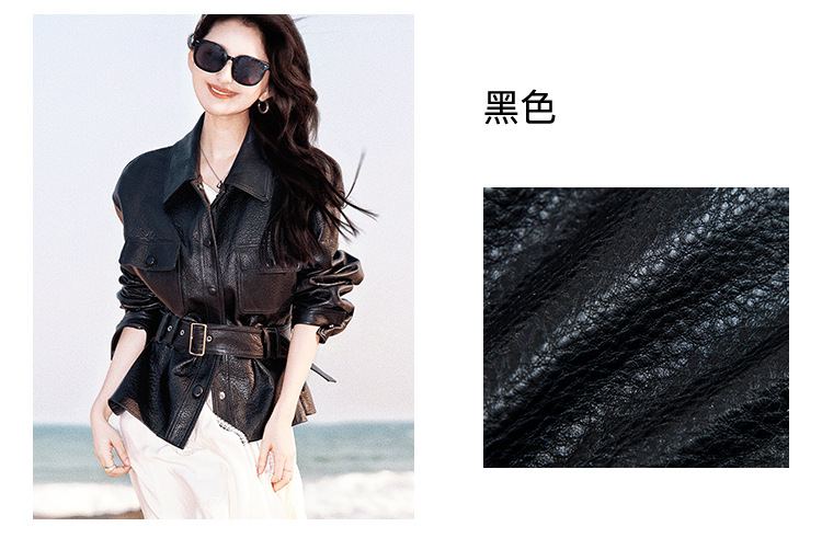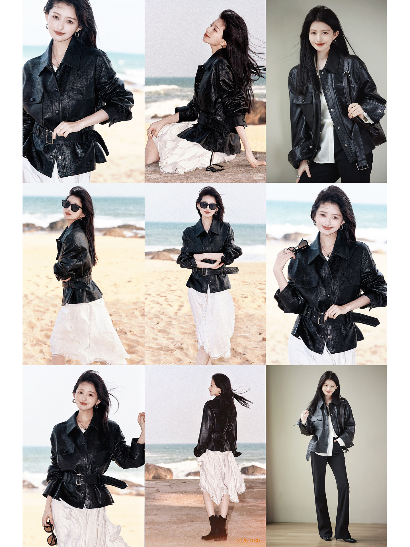 Европейские товары 2025 весна новая овечья кожа пенистая куртка классная кожаная куртка Song Jia с тем же темпераментом мотоциклетная кожаная куртка