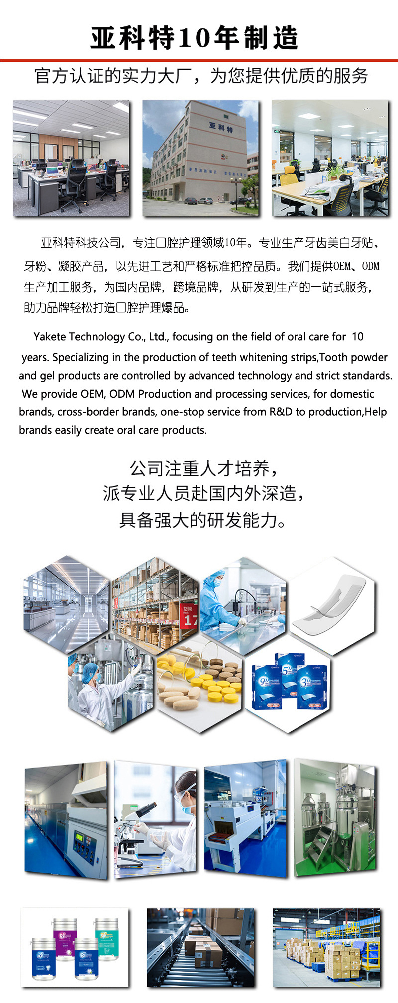 工厂公告通知 本厂经营:(个人护理产品系列)1:牙齿美白牙贴、2:牙粉、3:美白凝胶套装、4:牙齿美白牙膏 全产品系列支持:国内品牌、跨境海外品牌:OEM定制代加工贴牌服务 Our factory specializes in: (Personal Care Products Series) 1: Teeth Whitening Strips; 2: Tooth Powder; 3: Whitening Kits; 4: Teeth Whitening Toothpaste We support the entire product series for: Domestic brands, cross-border overseas brands: OEM custom processing and private label |