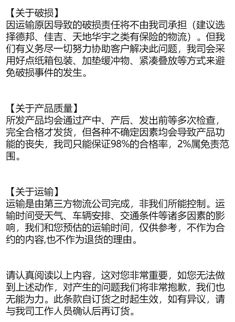 (4)本产品支持一件代发,不指定快递,非质量问题,退货需扣发货运费。如遇运费价格错误,请联系客服修改!感谢支持!