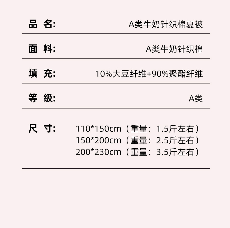 Одно летнее одеяло: 110*150 см (ок. 0.75kg шт.); Одно летнее одеяло: 150*200 см (ок. 1.25kg шт.); Одноместное летнее одеяло: 200*230 см (ок. 1.75kg шт.)