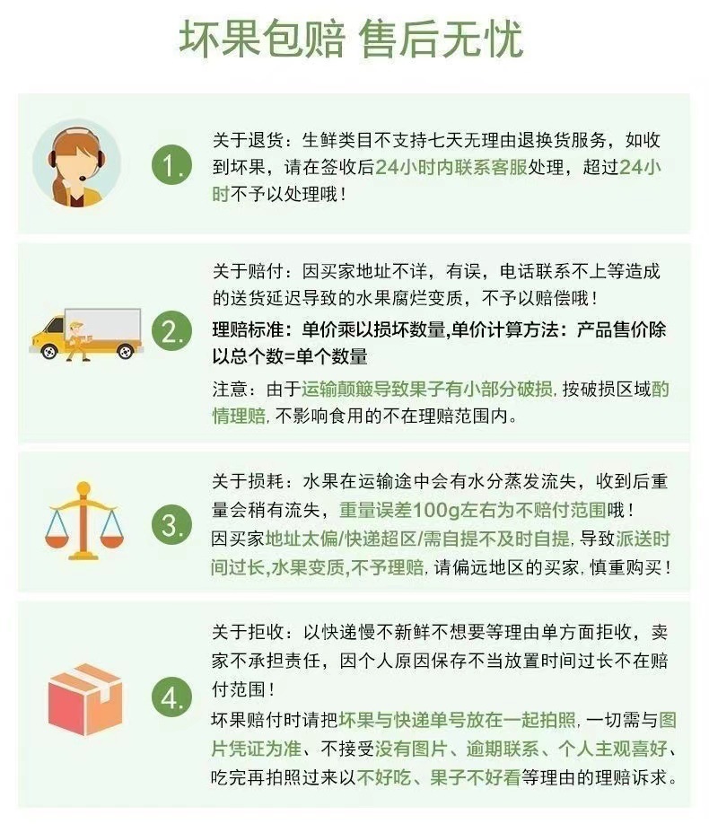 售后说明:生鲜产品请及时签收,签收24小时内,坏果烂果提供与面单合拍照片处理。未及时签收,或者签收24小时后不处理坏果烂果。