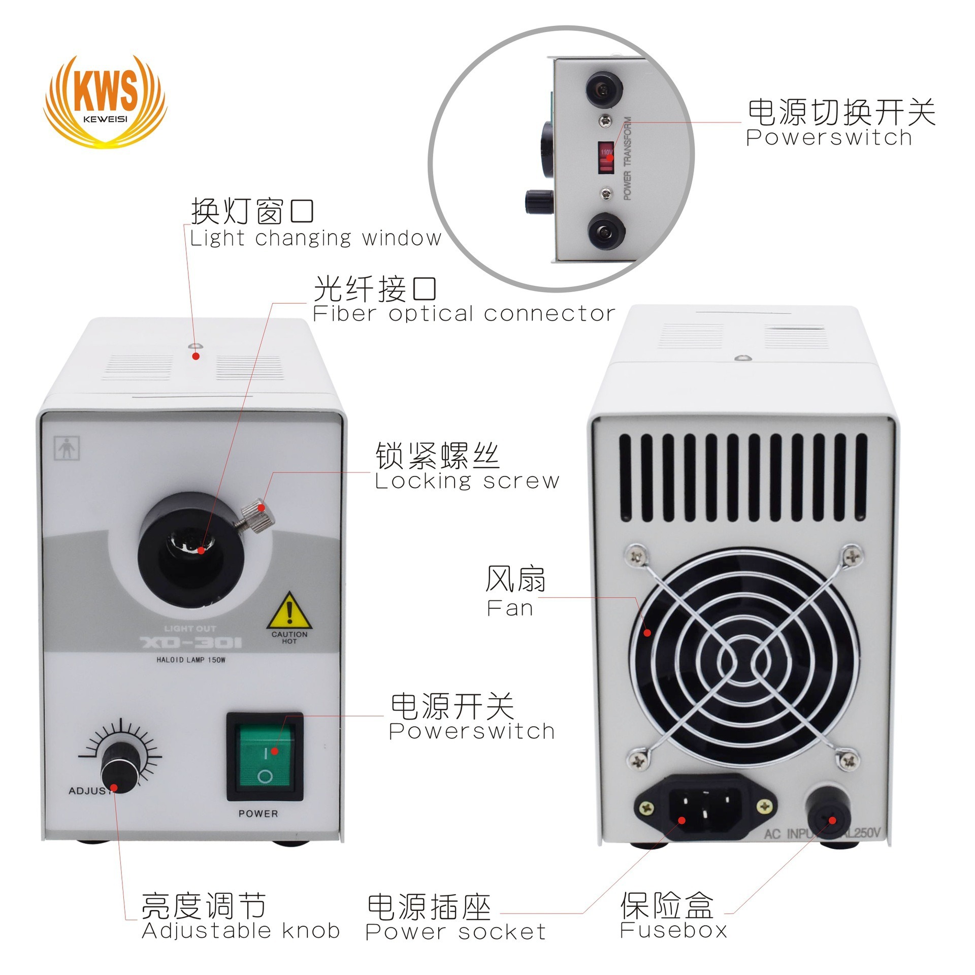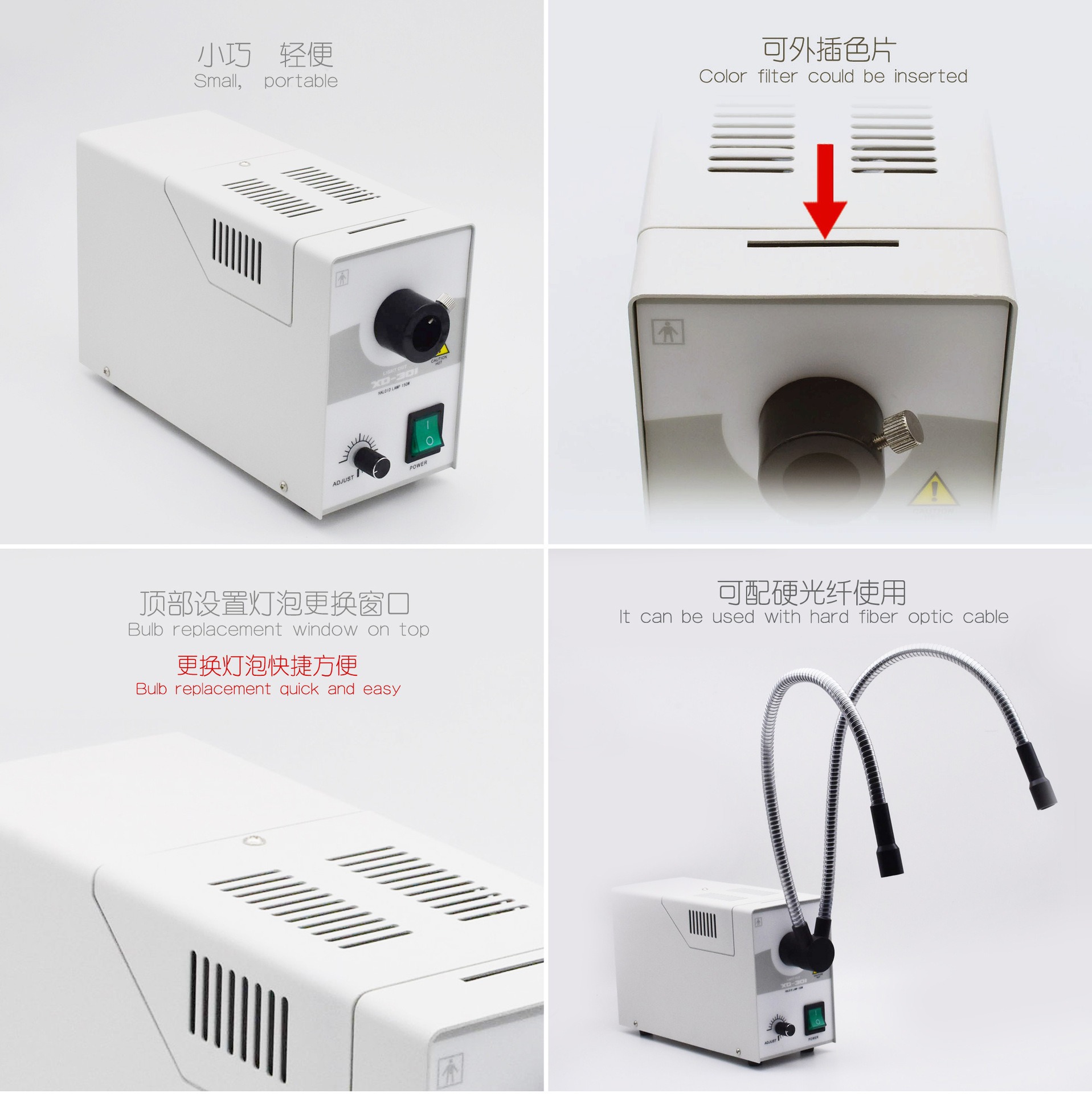 产品描述:采用单个150W卤素灯做光源,经济实惠;产品亮度线性可调,顶部设置灯泡更换窗口,更换灯泡快捷方便;产品输入网电压110ⅴ或220ⅴ,输出电压24v,性能稳定、安全可靠 ;产品结构紧凑小巧、便携,占用工作空间小。