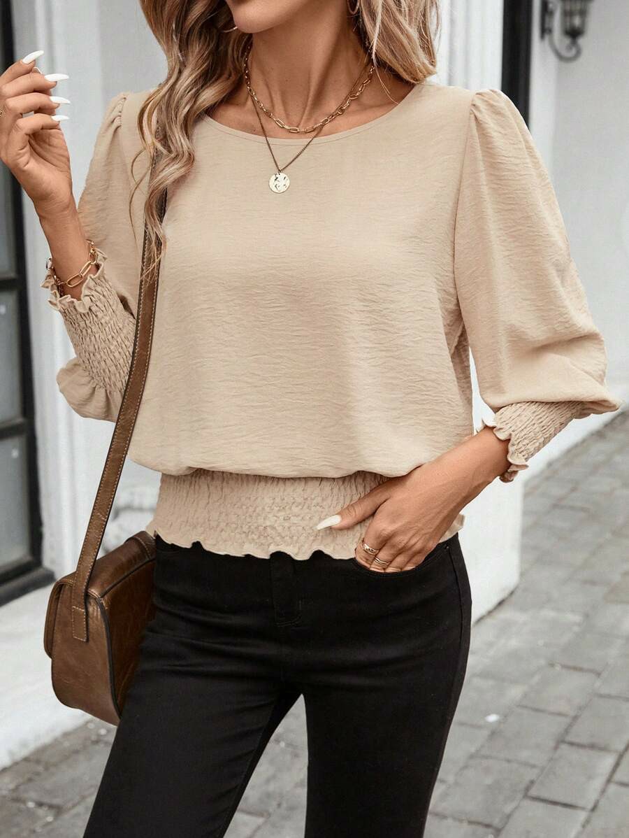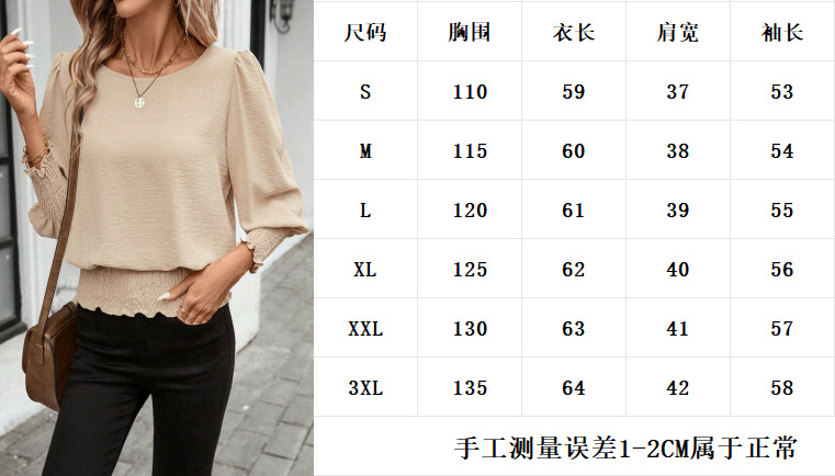 Независимый сайт Amazon. Европейская и американская трансграничная новинка 2025 года: свободная рубашка больших размеров с круглым вырезом, однотонная, с драпировкой и рукавами-фонариками.
