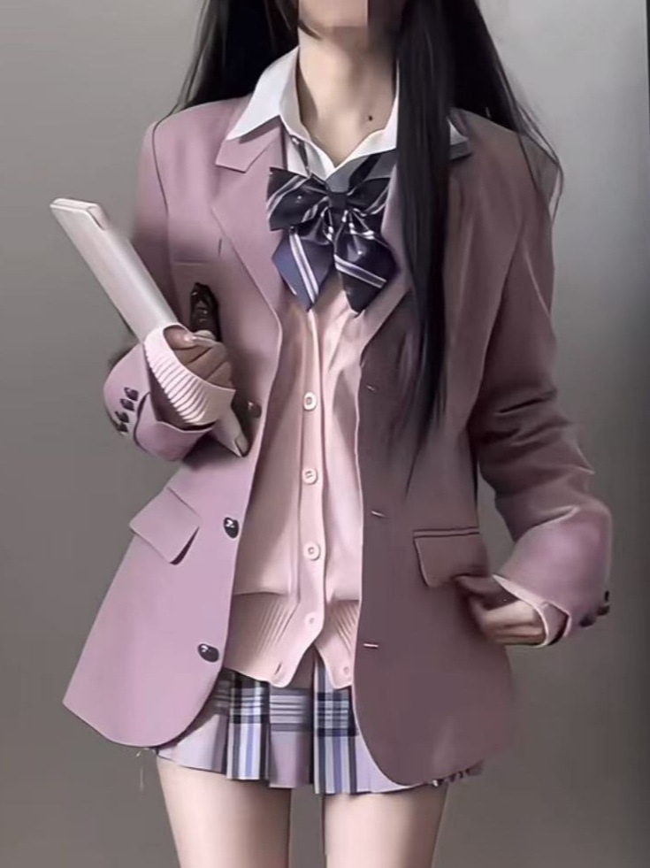 костюм плюс значок; Рубашка и галстук-бабочка; розовый кардиган; нижняя юбка; полный комплект